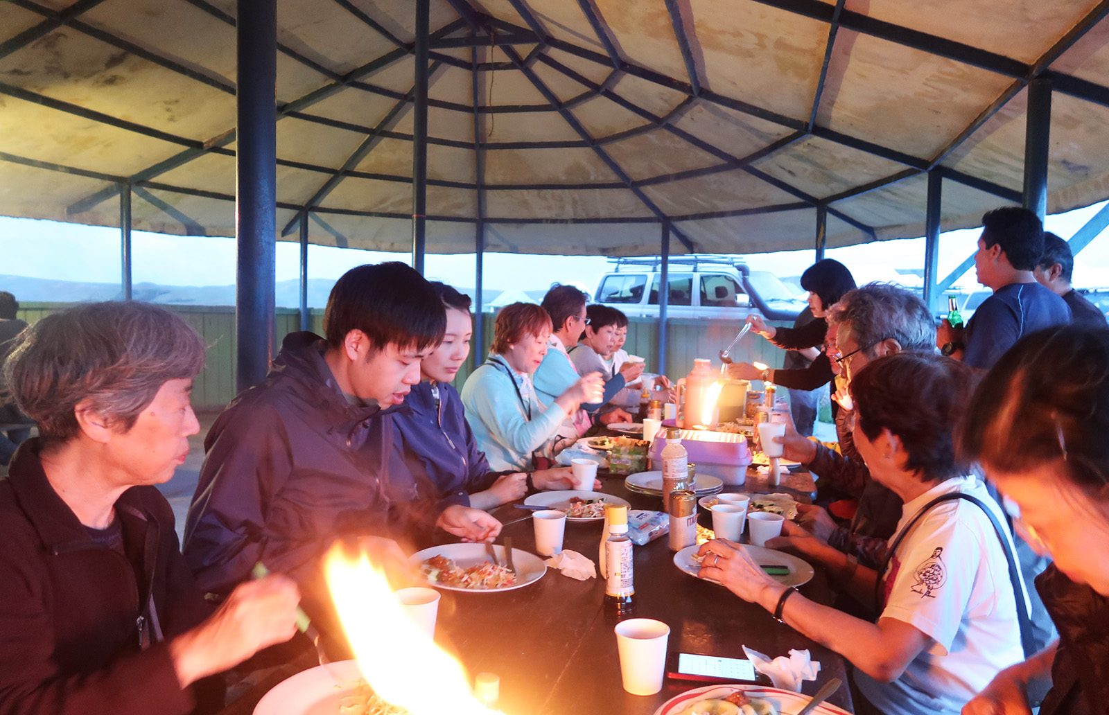 ロッジでの夕食(ガイド作のバーベキュ-を空き缶利用ランプのもとで)