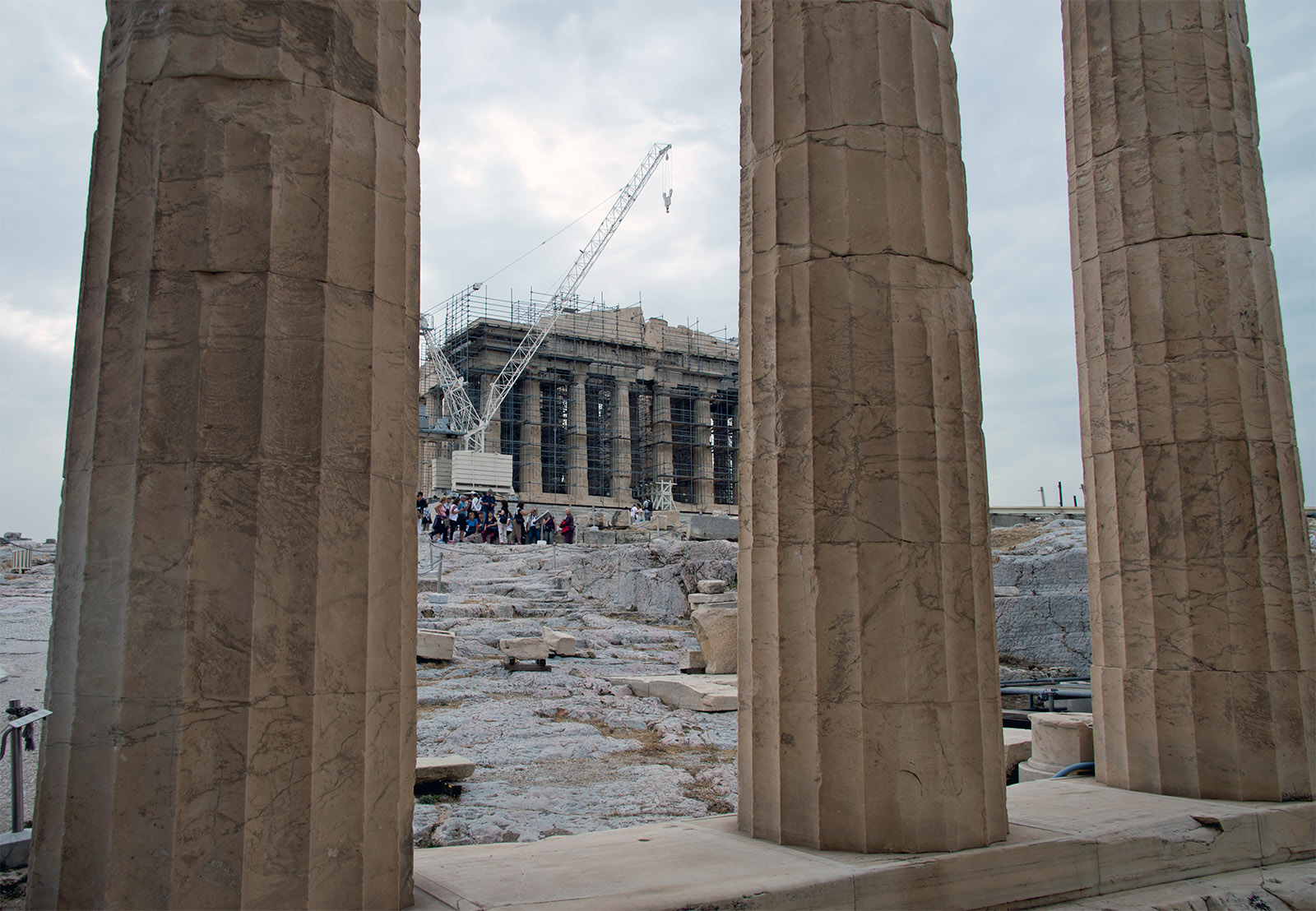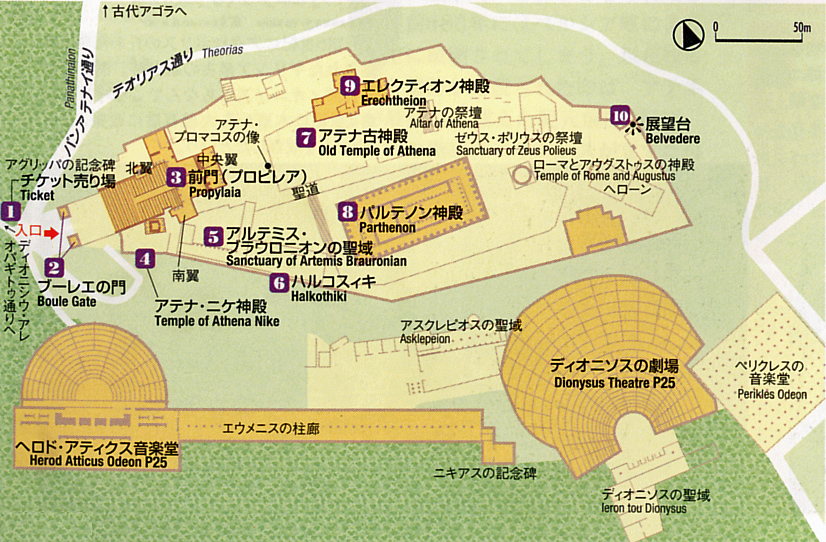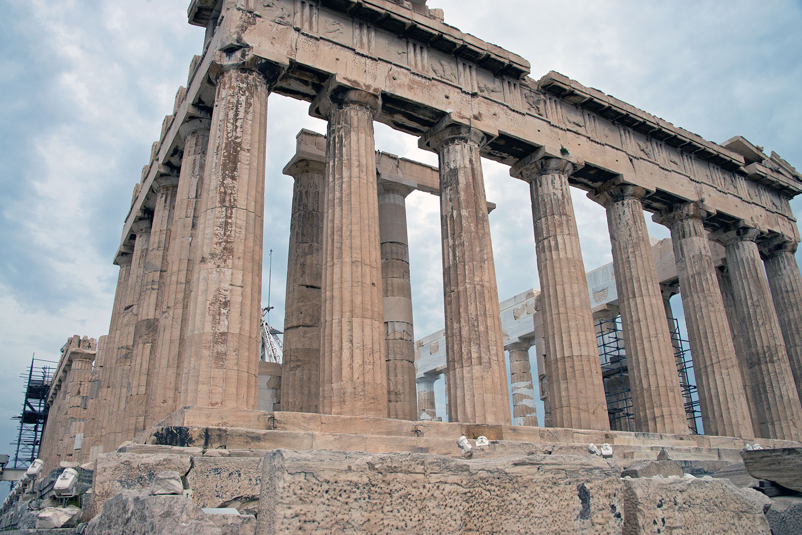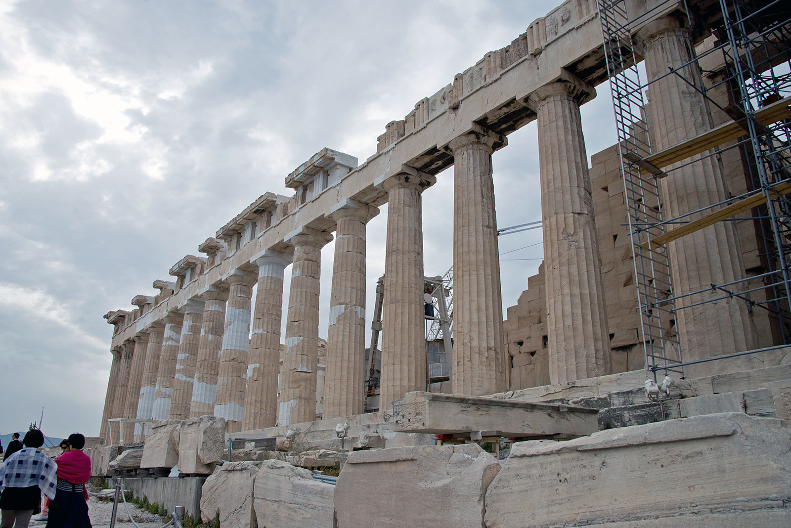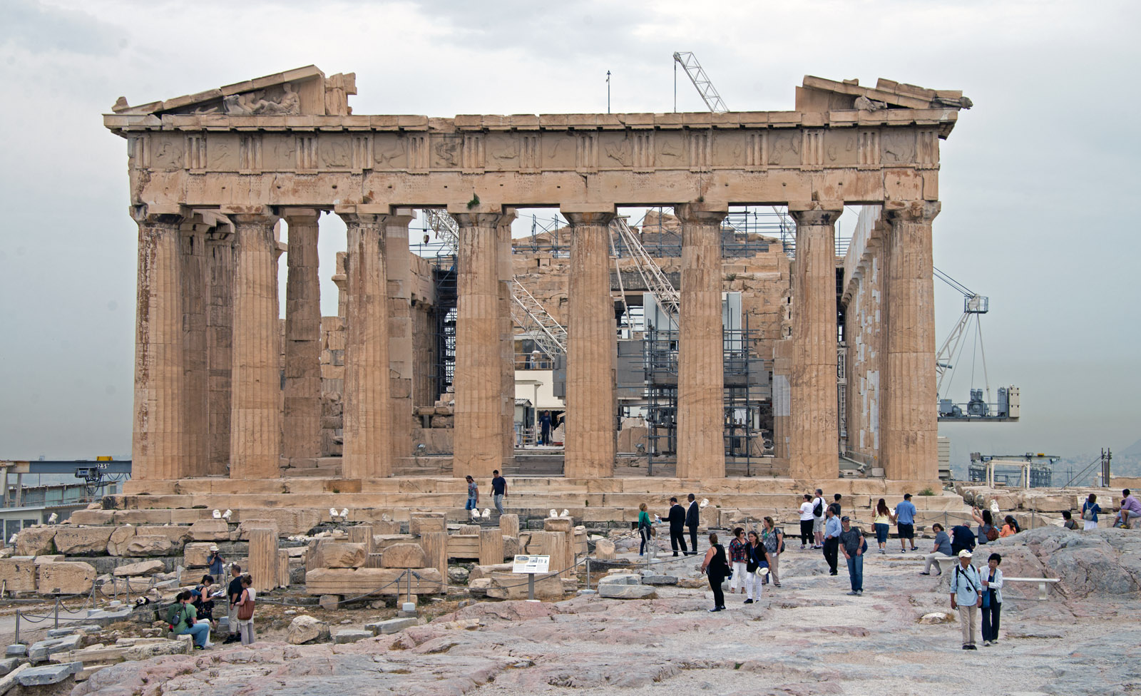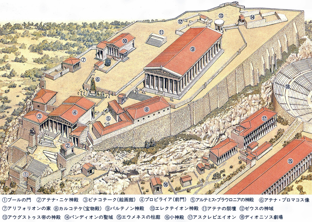 古代ギリシャの各ポリスには守護神が存在しておりアテナはアテネの守護神であった。 神話によると、智恵や戦略で戦いを指導する処女(パルテノン)女神アテナは、 海・水の守護神であるポセイドンと、アテネの支配権をめぐって争った。 それは、2人の神がアテネに贈り物をし、どちらが優れているかをアテネの人が決めるというもの。 まず、ポセイドンが三叉の矛で地面をたたき、泉を作ったが、塩水しか出なかった。 一方、アテナはオリーブの木を贈り、人々はこれを喜び、アテナがアテネの守護神となった。 BC5世紀当時、ペルシアとの戦で勝利を得、ギリシャの中心となっていたアテネは、 その守護神への感謝を表明するため、高さ12mにも及ぶ黄金と象牙のアテナ像を彫刻家 フィディアスに作成させた。それを設置するために、アクロポリスに既存の神殿を改造・拡大させ、 計46本の柱を有する、幅約31m、奥行き約70mの巨大なパルテノン神殿が建てられた。 現在はアテナ像はなく、破損した神殿の復元工事が続いているが、その存在感は当時のままである。 |