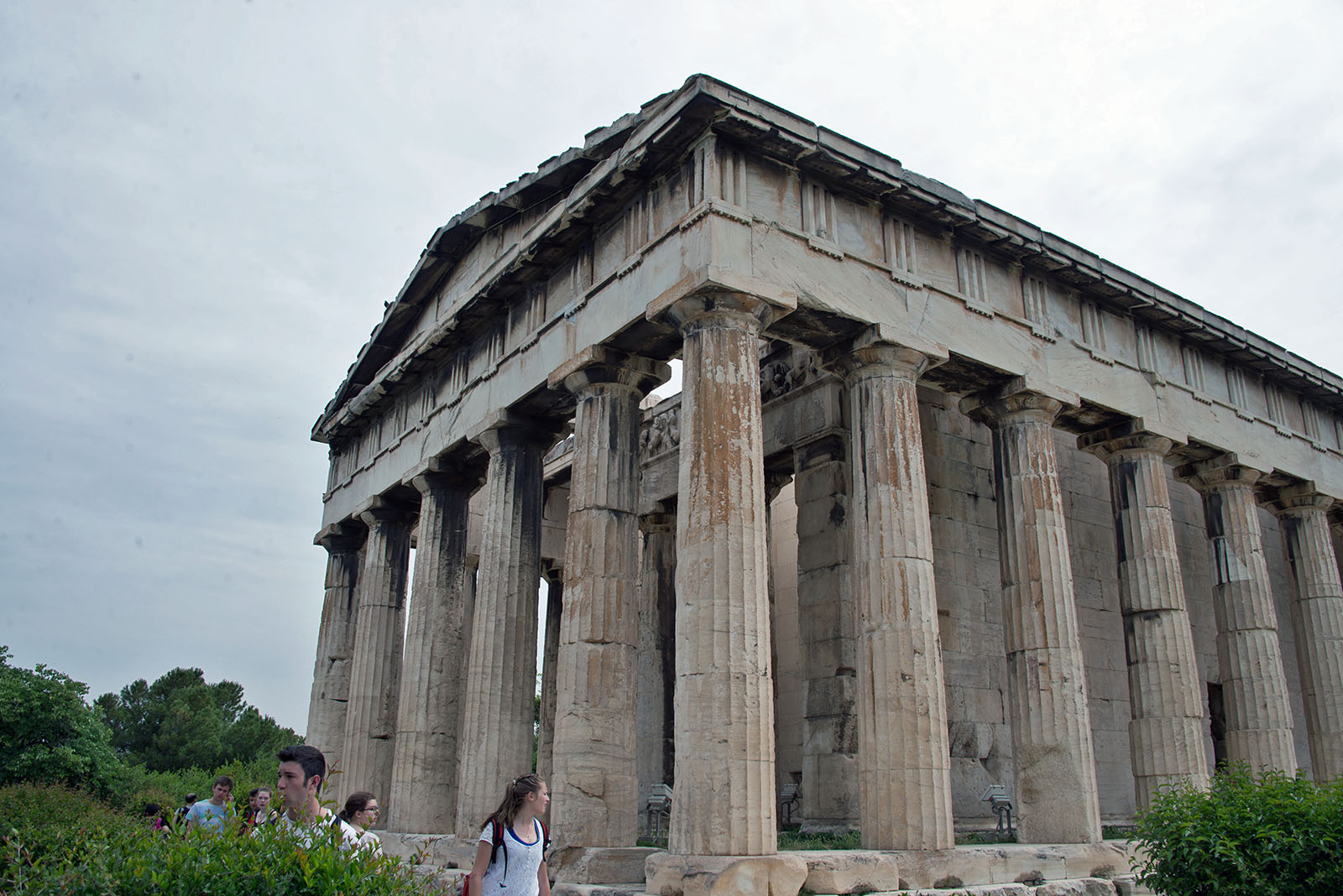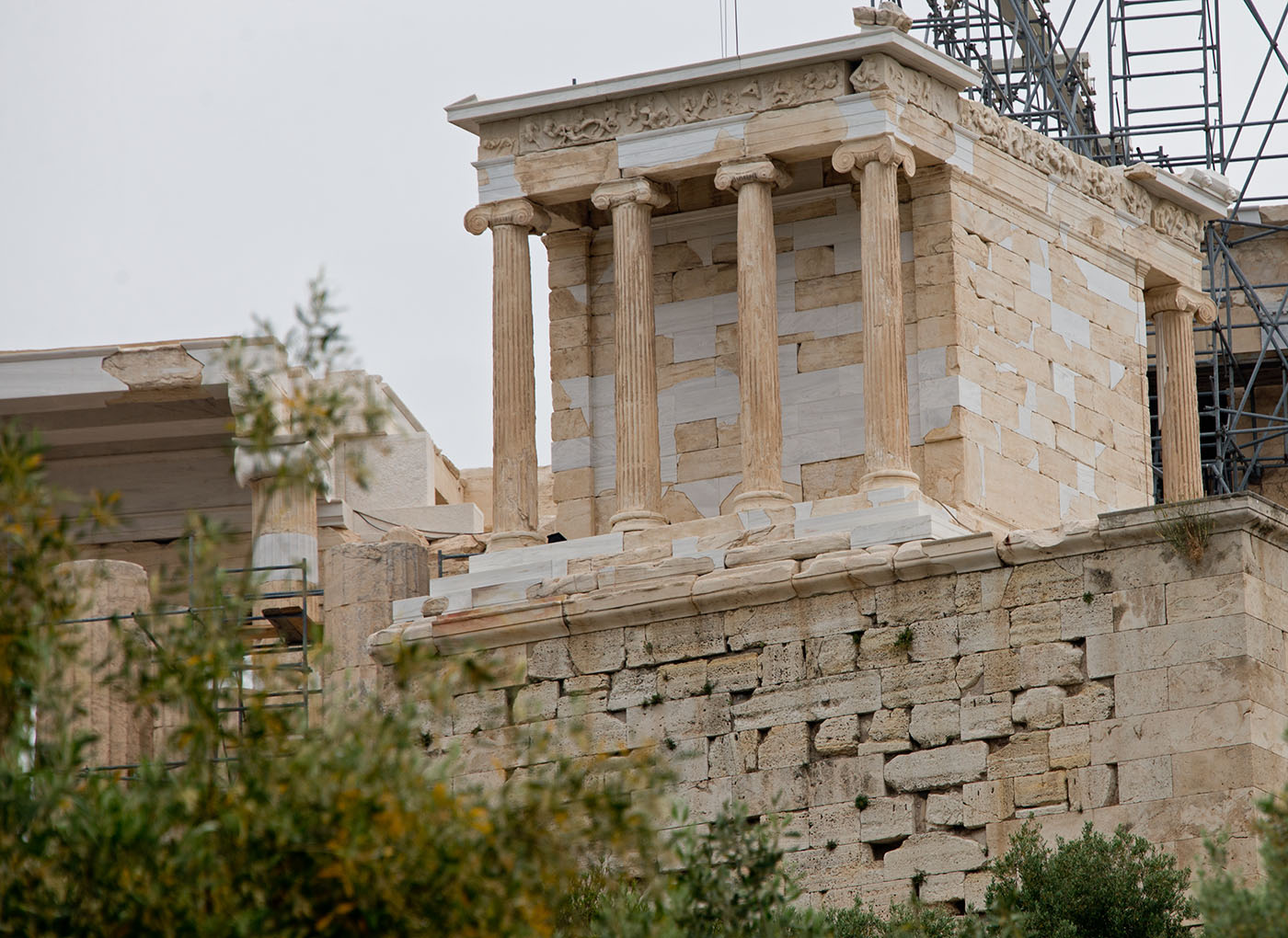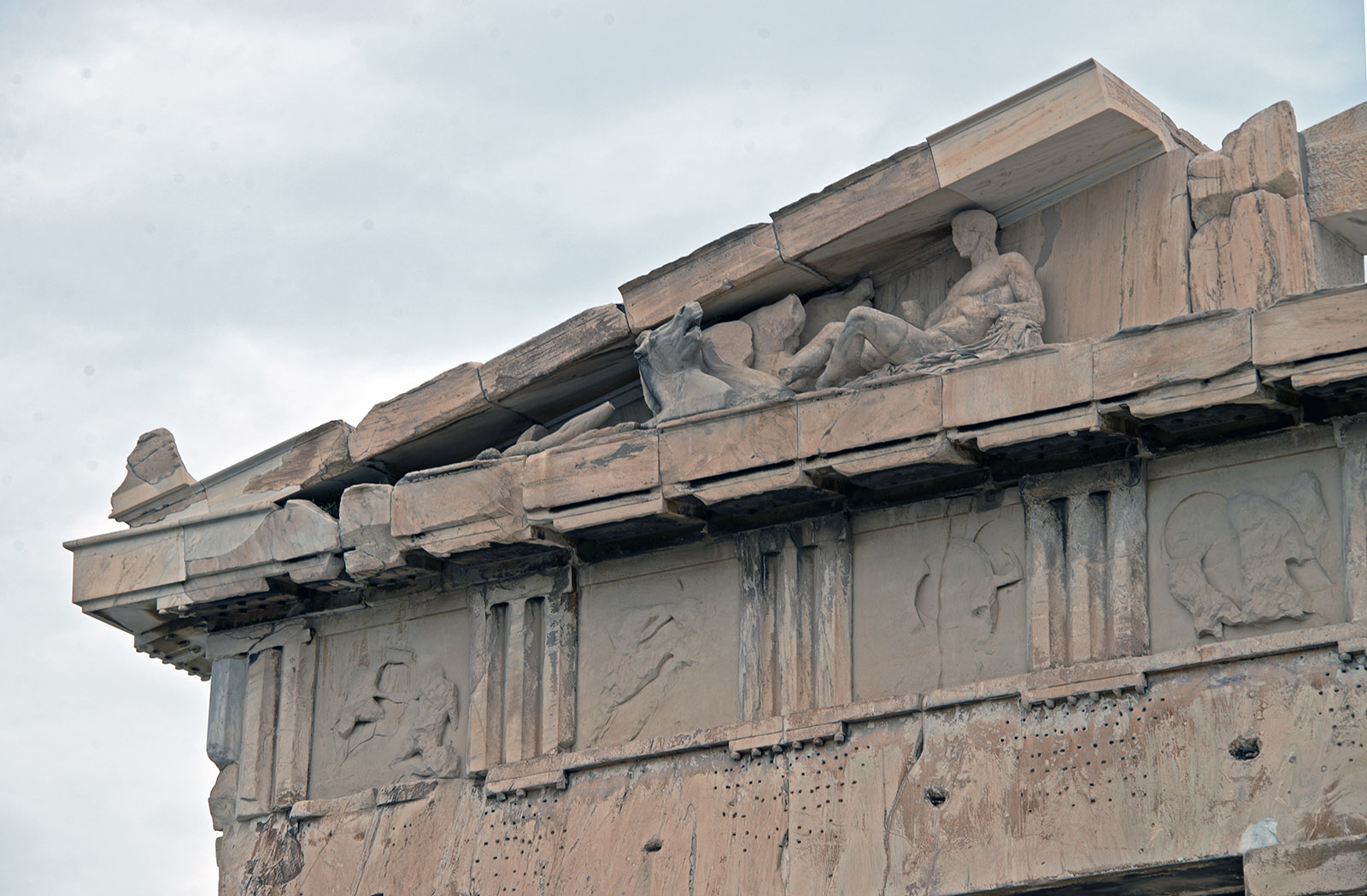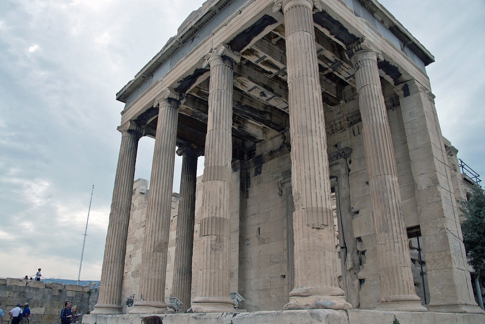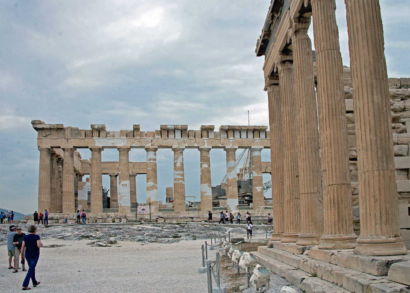 古代ギリシャの各ポリスには守護神が存在しておりアテナはアテネの守護神であった。 神話によると、智恵や戦略で戦いを指導する処女(パルテノン)女神アテナは、 海・水の守護神であるポセイドンと、アテネの支配権をめぐって争った。 それは、2人の神がアテネに贈り物をし、どちらが優れているかをアテネの人が決めるというもの。 まず、ポセイドンが三叉の矛で地面をたたき、泉を作ったが、塩水しか出なかった。 一方、アテナはオリーブの木を贈り、人々はこれを喜び、アテナがアテネの守護神となった。 BC5世紀当時、ペルシアとの戦で勝利を得、ギリシャの中心となっていたアテネは、 その守護神への感謝を表明するため、高さ12mにも及ぶ黄金と象牙のアテナ像を彫刻家 フィディアスに作成させた。それを設置するために、アクロポリスに既存の神殿を改造・拡大させ、 計46本の柱を有する、幅約31m、奥行き約70mの巨大なパルテノン神殿が建てられた。 現在はアテナ像はなく、破損した神殿の復元工事が続いているが、その存在感は当時のままである。 |