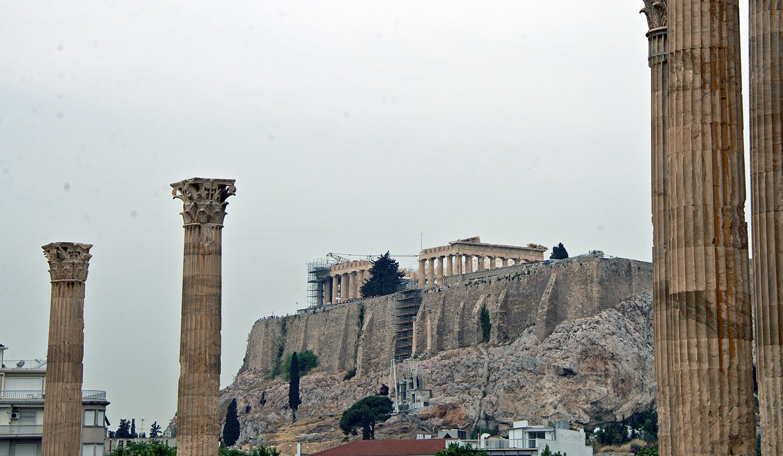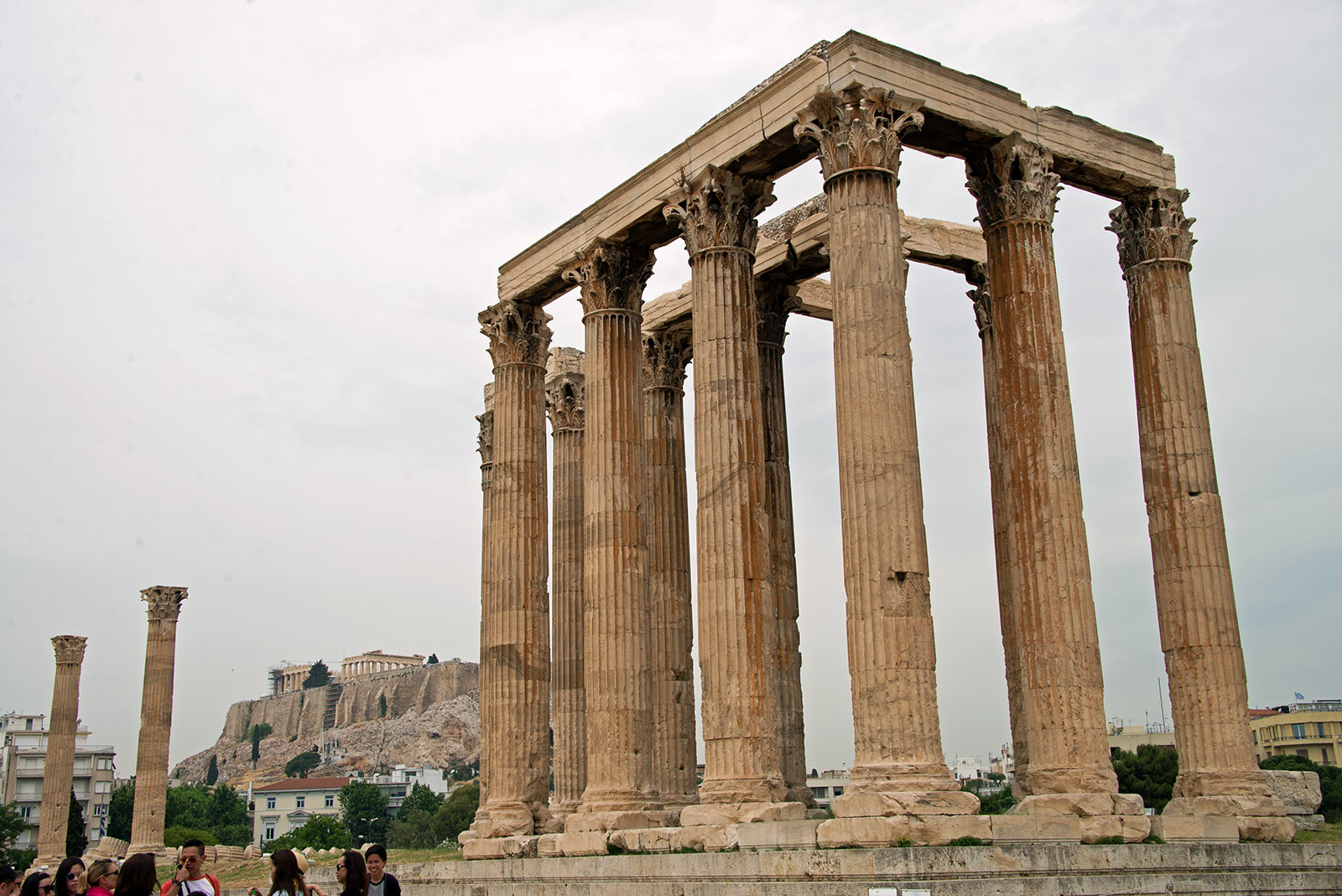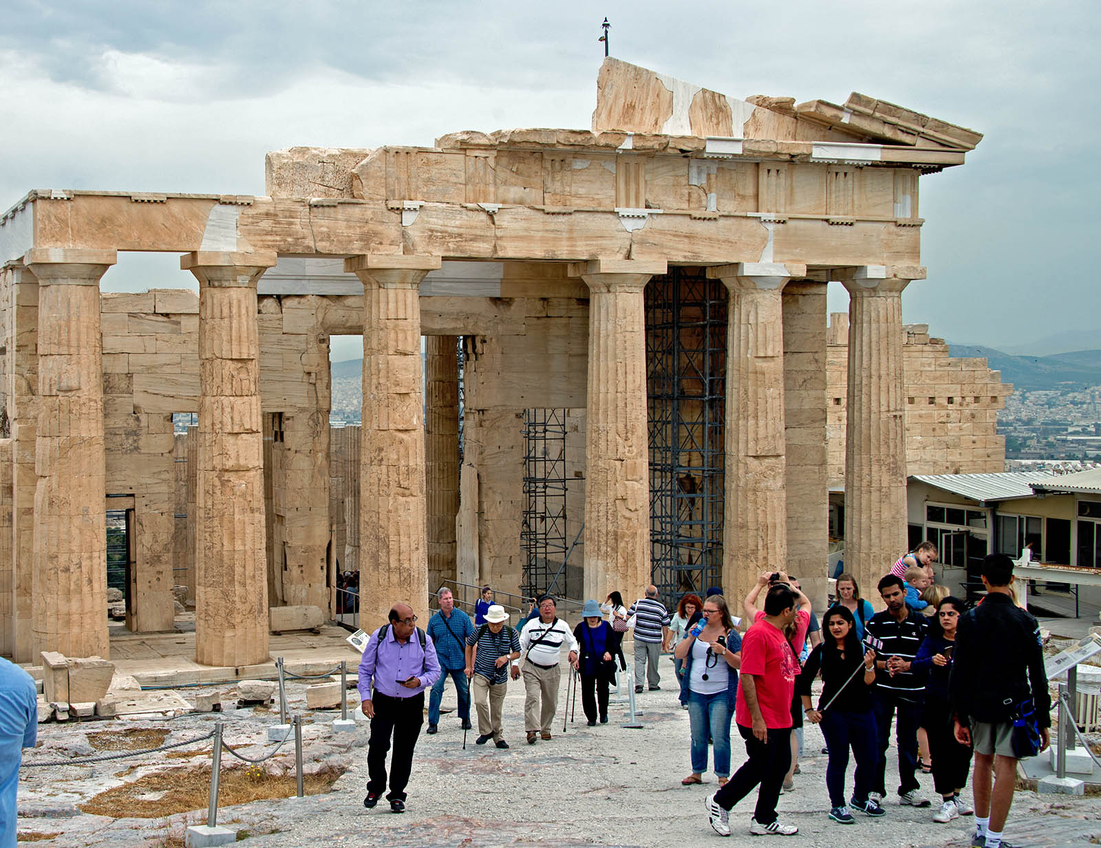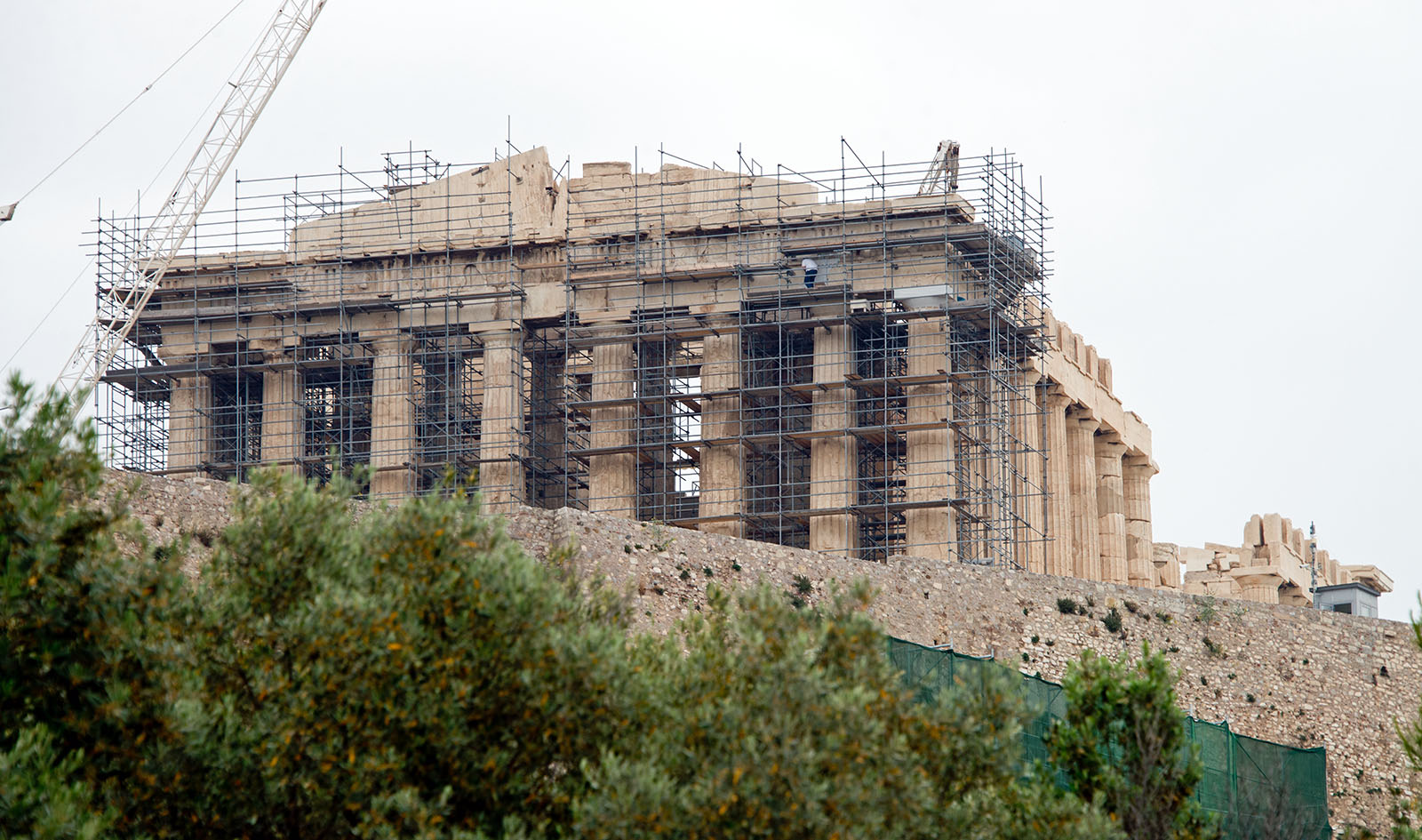 古代ギリシャの各ポリスには守護神が存在しておりアテナはアテネの守護神であった。 神話によると、智恵や戦略で戦いを指導する処女(パルテノン)女神アテナは、 海・水の守護神であるポセイドンと、アテネの支配権をめぐって争った。 それは、2人の神がアテネに贈り物をし、どちらが優れているかをアテネの人が決めるというもの。 まず、ポセイドンが三叉の矛で地面をたたき、泉を作ったが、塩水しか出なかった。 一方、アテナはオリーブの木を贈り、人々はこれを喜び、アテナがアテネの守護神となった。 BC5世紀当時、ペルシアとの戦で勝利を得、ギリシャの中心となっていたアテネは、 その守護神への感謝を表明するため、高さ12mにも及ぶ黄金と象牙のアテナ像を彫刻家 フィディアスに作成させた。それを設置するために、アクロポリスに既存の神殿を改造・拡大させ、 計46本の柱を有する、幅約31m、奥行き約70mの巨大なパルテノン神殿が建てられた。 現在はアテナ像はなく、破損した神殿の復元工事が続いているが、その存在感は当時のままである。 |