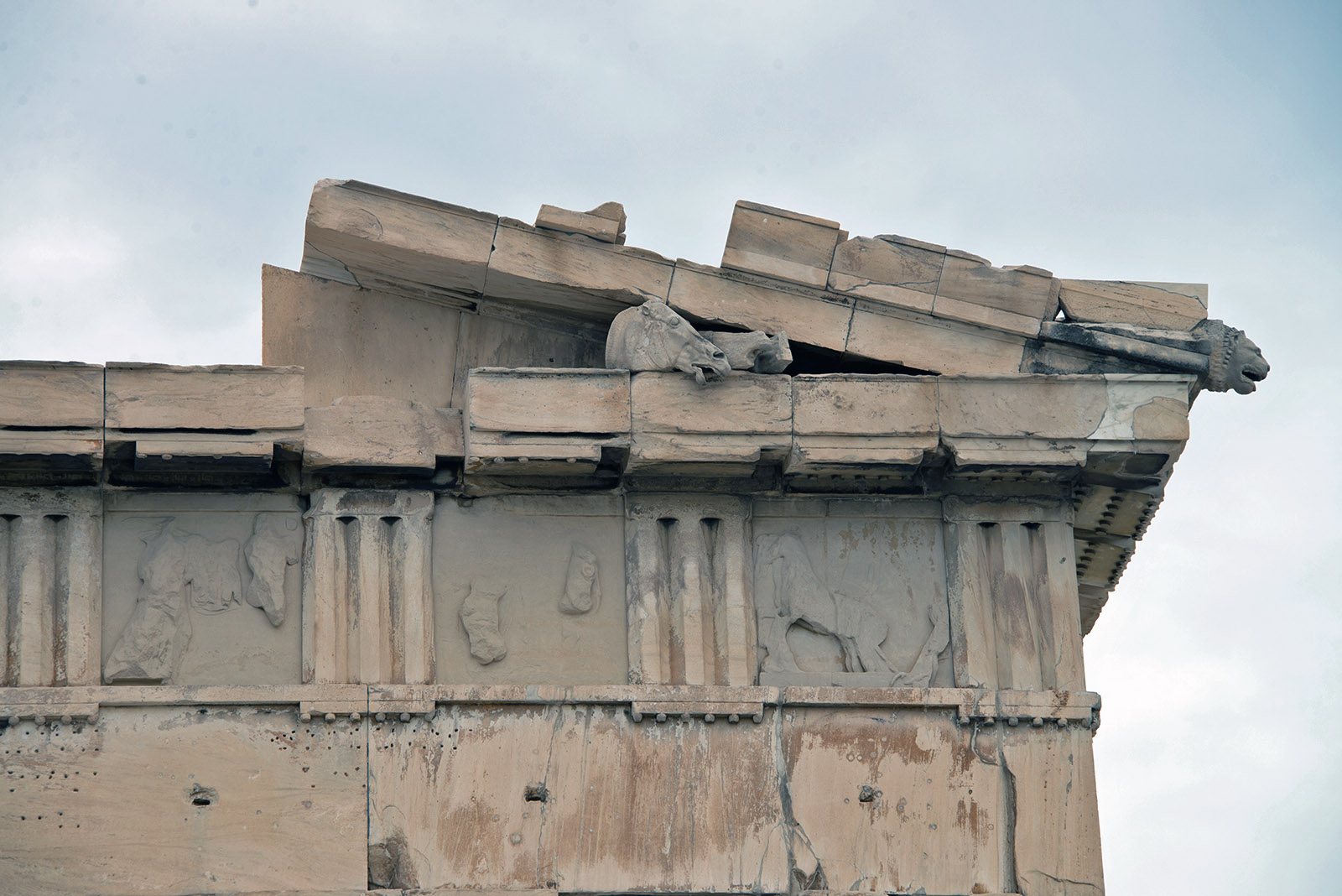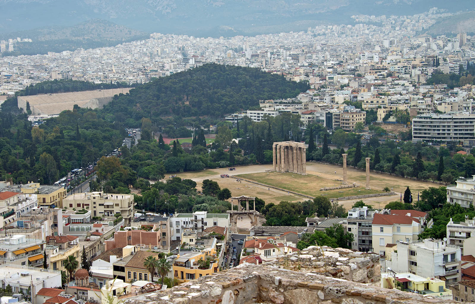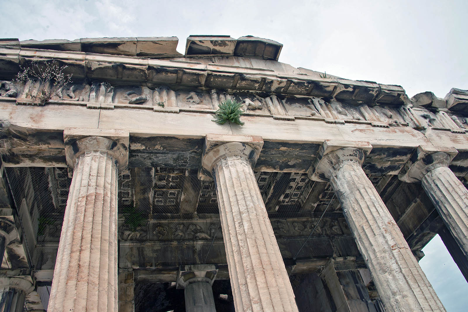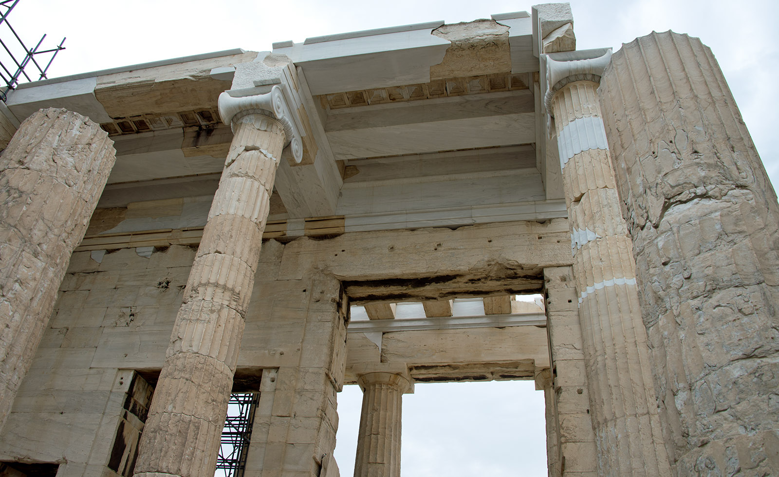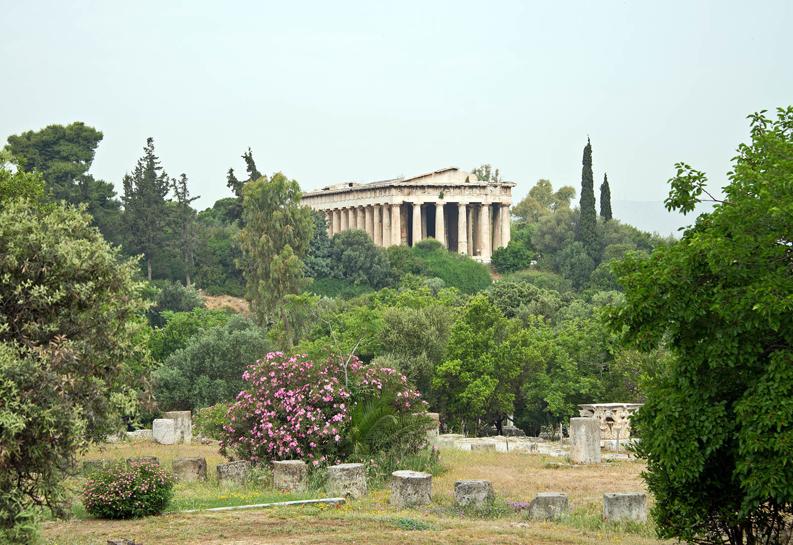 古代ギリシャの各ポリスには守護神が存在しておりアテナはアテネの守護神であった。 神話によると、智恵や戦略で戦いを指導する処女(パルテノン)女神アテナは、 海・水の守護神であるポセイドンと、アテネの支配権をめぐって争った。 それは、2人の神がアテネに贈り物をし、どちらが優れているかをアテネの人が決めるというもの。 まず、ポセイドンが三叉の矛で地面をたたき、泉を作ったが、塩水しか出なかった。 一方、アテナはオリーブの木を贈り、人々はこれを喜び、アテナがアテネの守護神となった。 BC5世紀当時、ペルシアとの戦で勝利を得、ギリシャの中心となっていたアテネは、 その守護神への感謝を表明するため、高さ12mにも及ぶ黄金と象牙のアテナ像を彫刻家 フィディアスに作成させた。それを設置するために、アクロポリスに既存の神殿を改造・拡大させ、 計46本の柱を有する、幅約31m、奥行き約70mの巨大なパルテノン神殿が建てられた。 現在はアテナ像はなく、破損した神殿の復元工事が続いているが、その存在感は当時のままである。 |