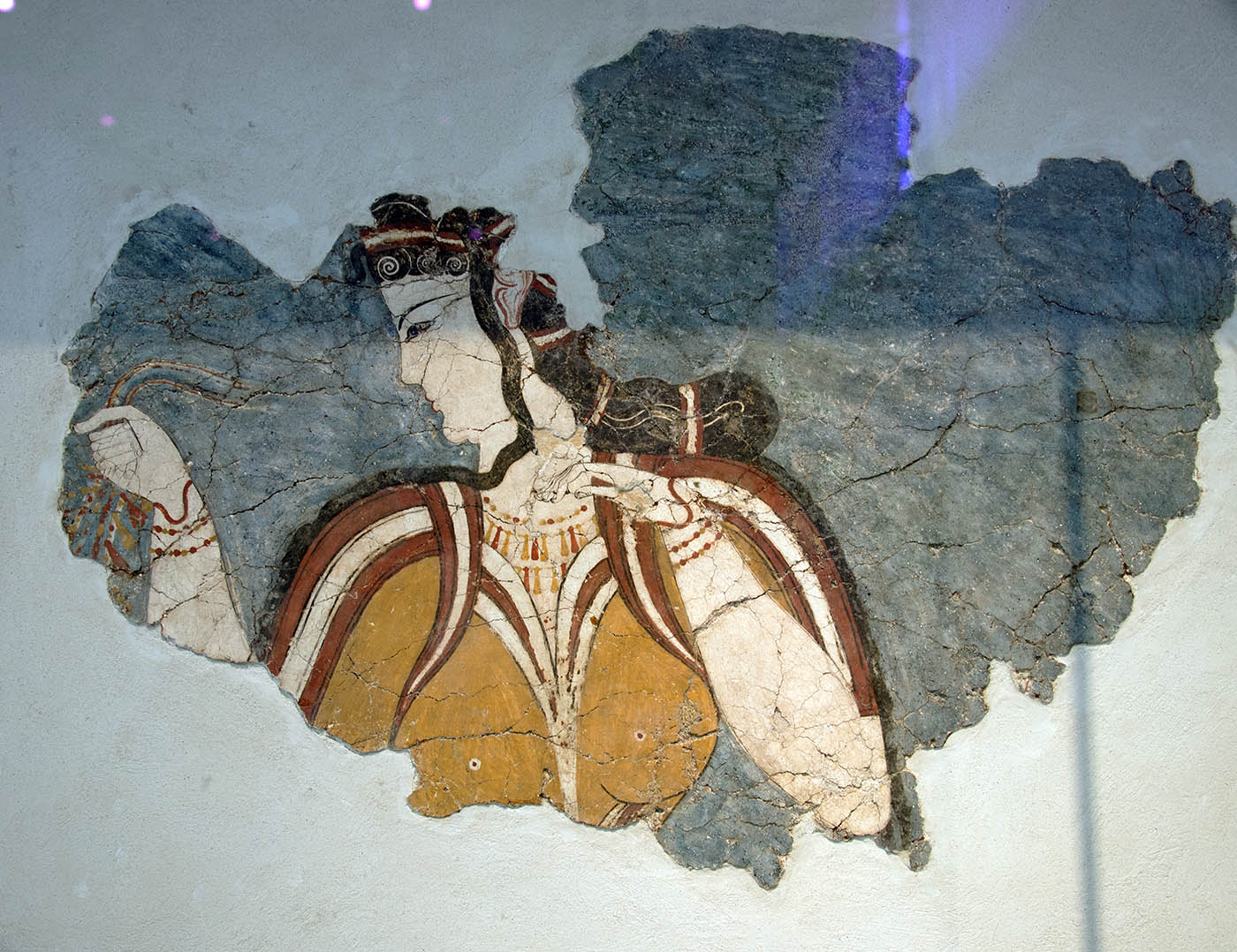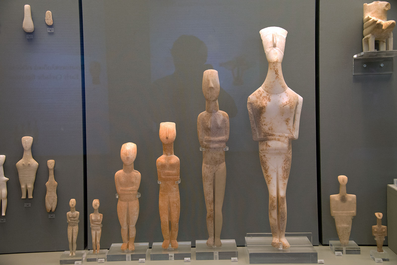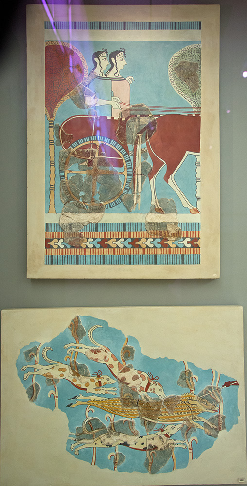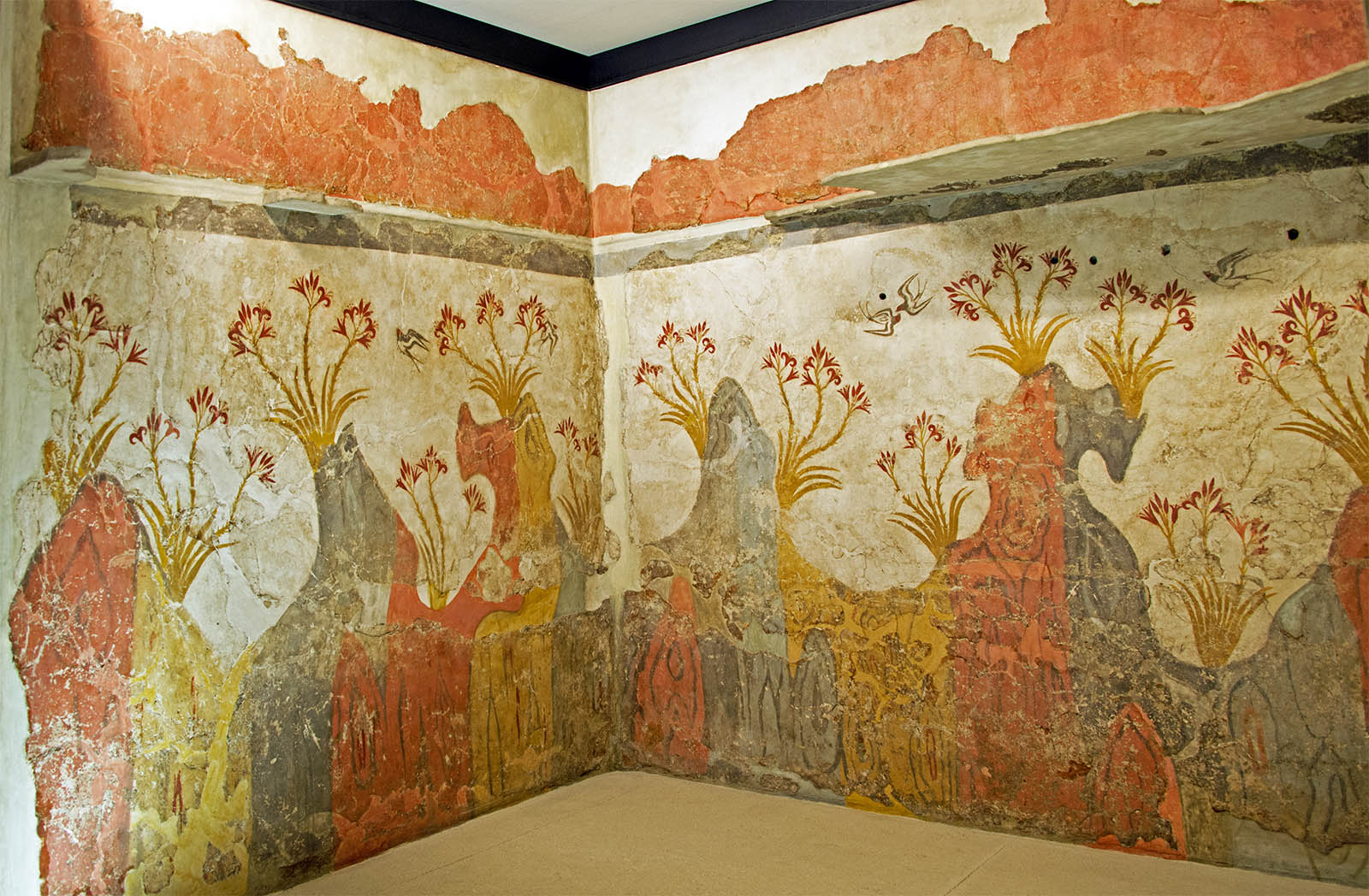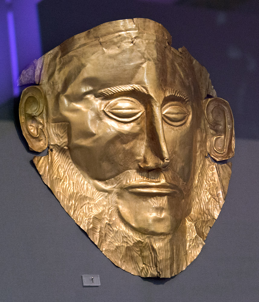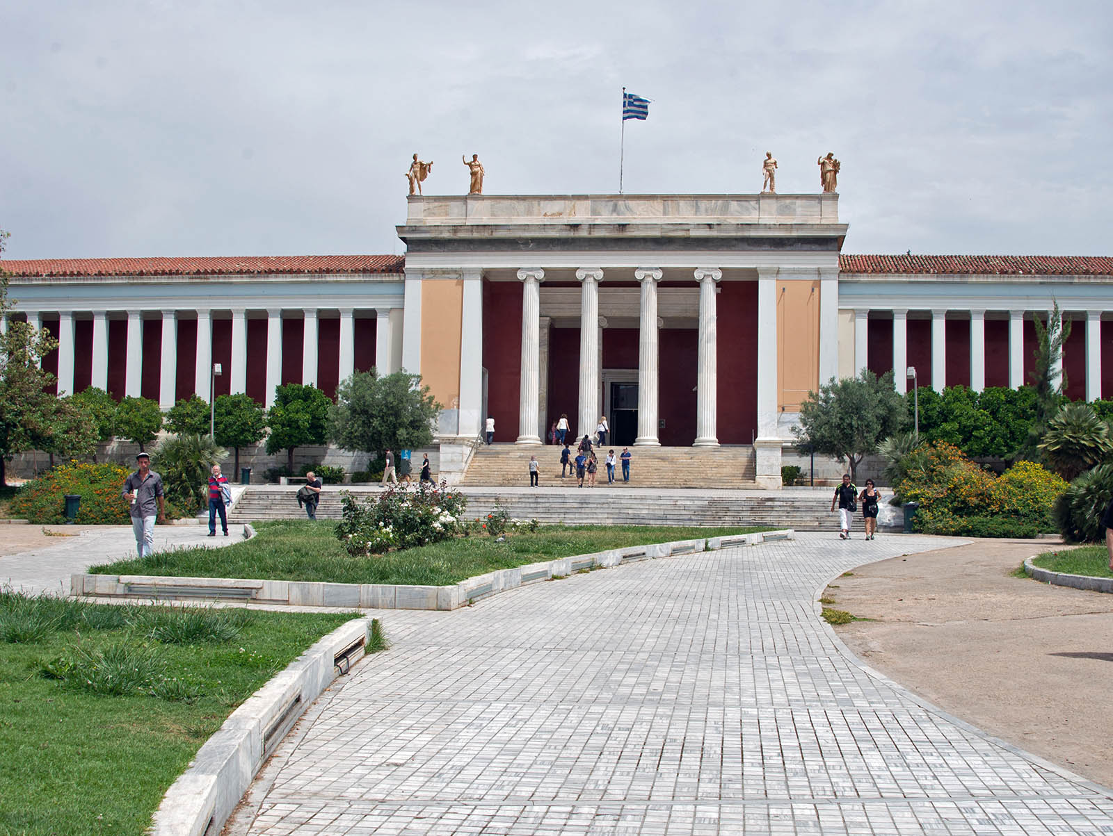 ミケーネ遺跡から出土した 「アガメムノンの黄金の仮面」、海底からみつかった「馬上の少年像」、 デロス島の「アフロディーテと牧神パンとエロスの像」「ポセイドンの青銅像」などが見られる。 1975年以降,サントリニ島出土の壁画群が特別展示されおり、見ものである。 |