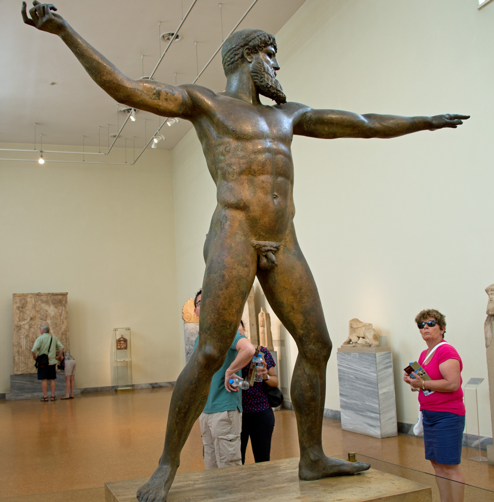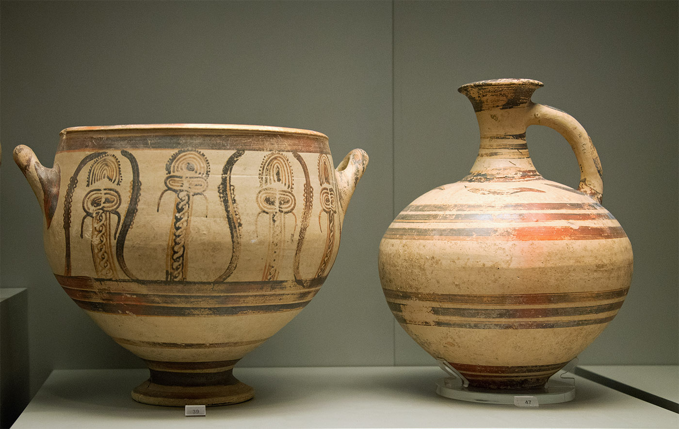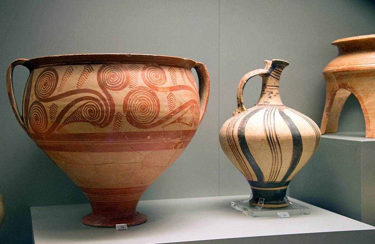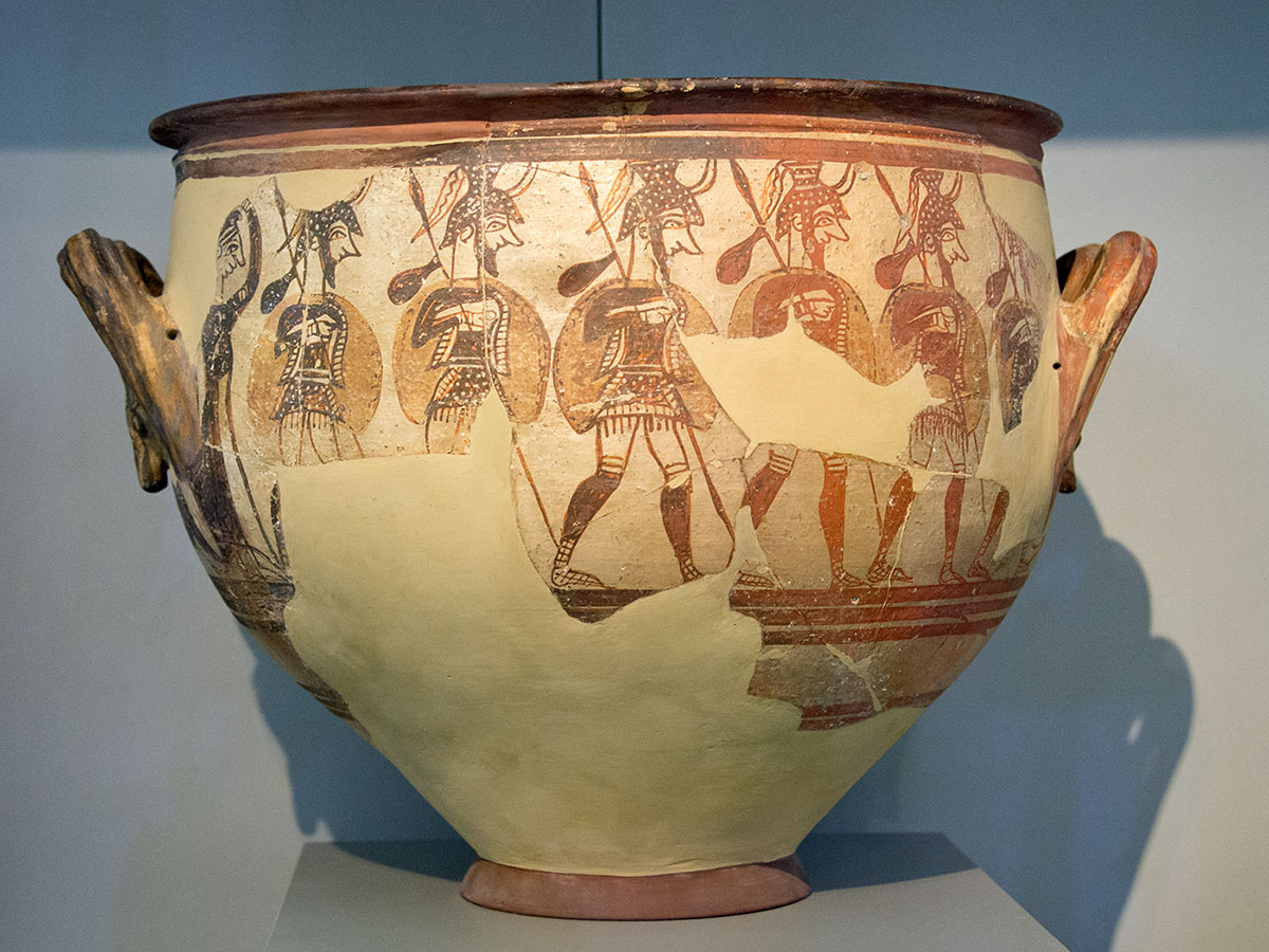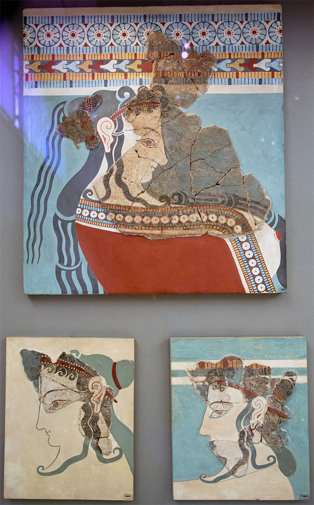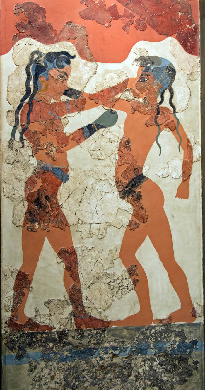 ミケーネ遺跡から出土した 「アガメムノンの黄金の仮面」、海底からみつかった「馬上の少年像」、 デロス島の「アフロディーテと牧神パンとエロスの像」「ポセイドンの青銅像」などが見られる。 1975年以降,サントリニ島出土の壁画群が特別展示されおり、見ものである。 |