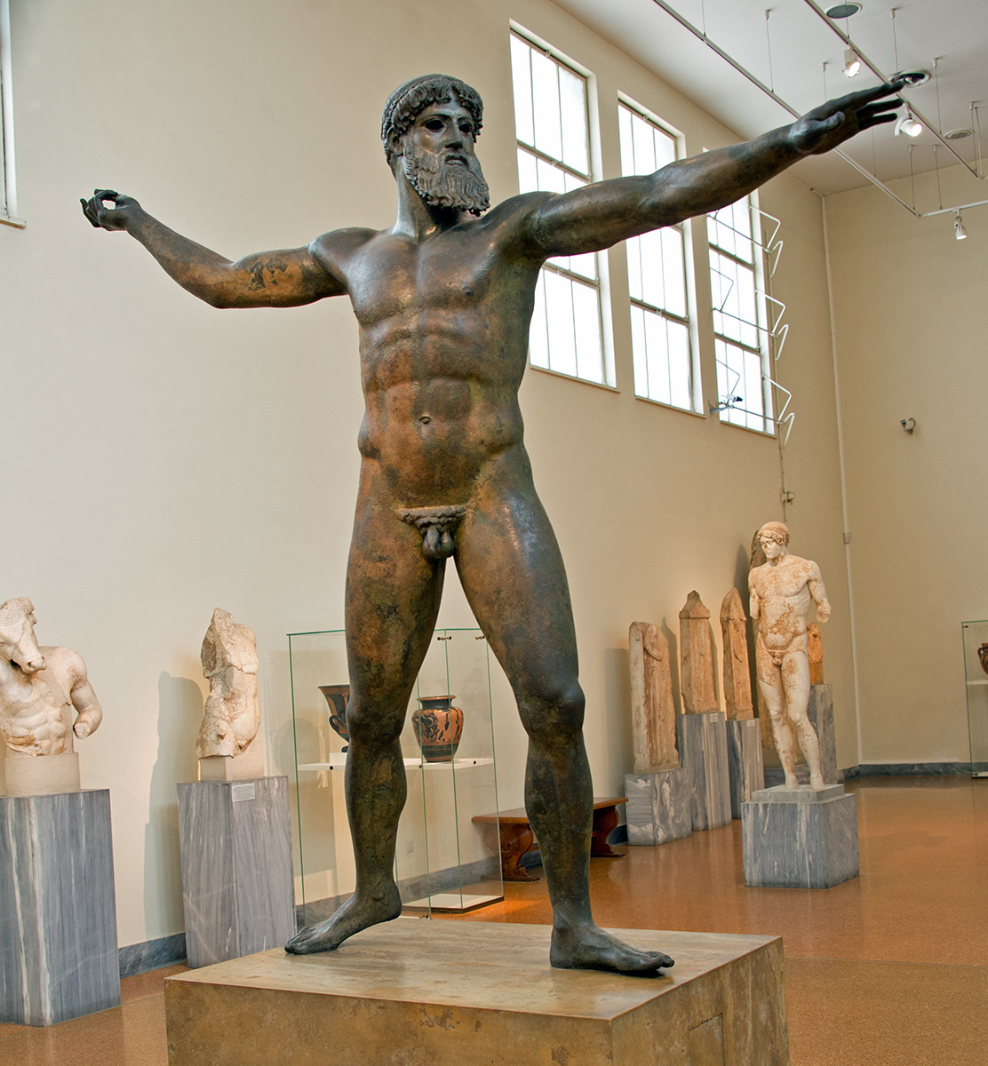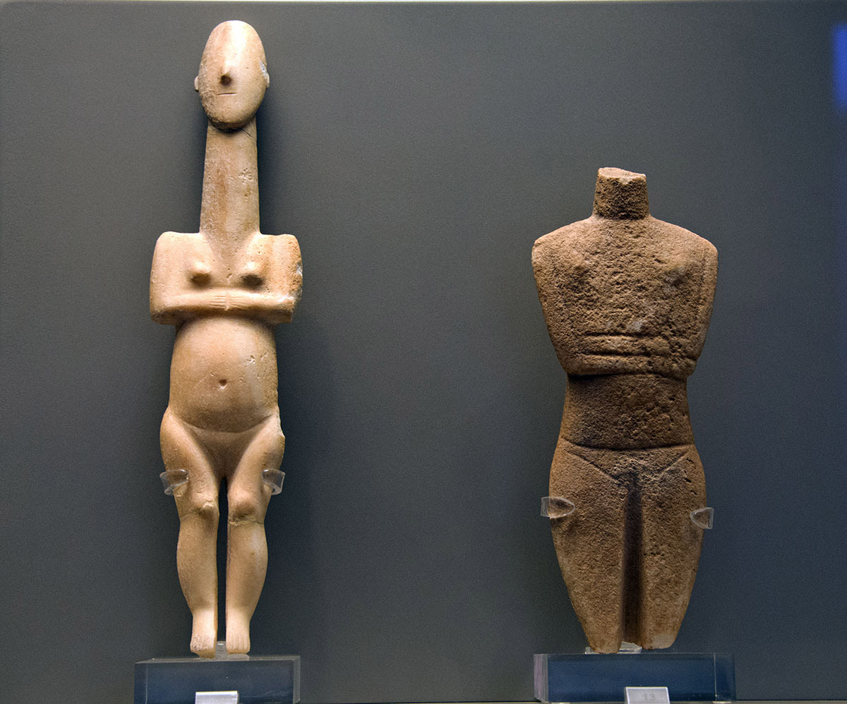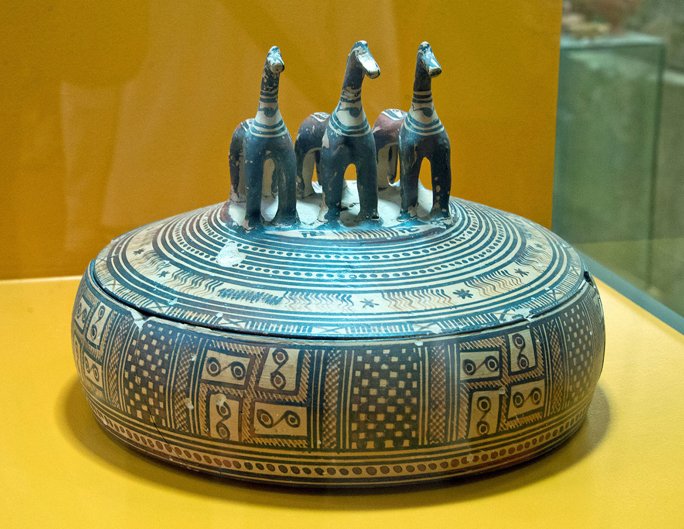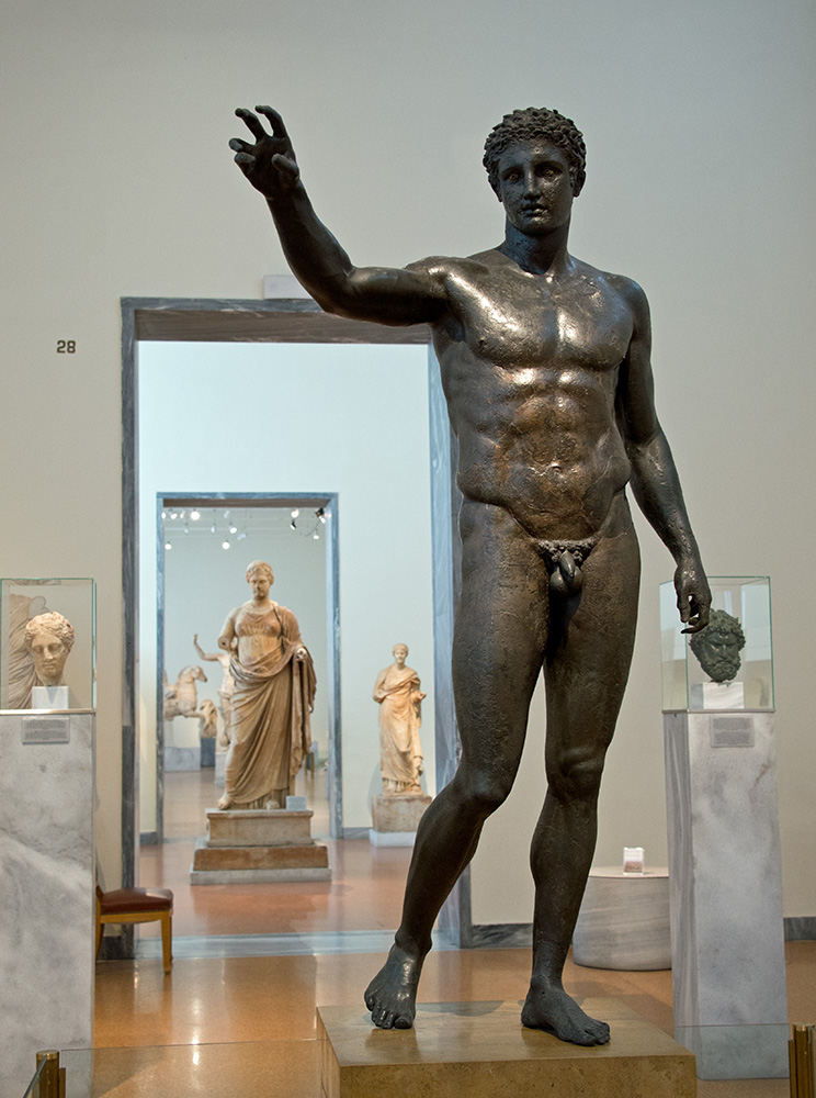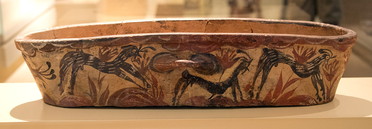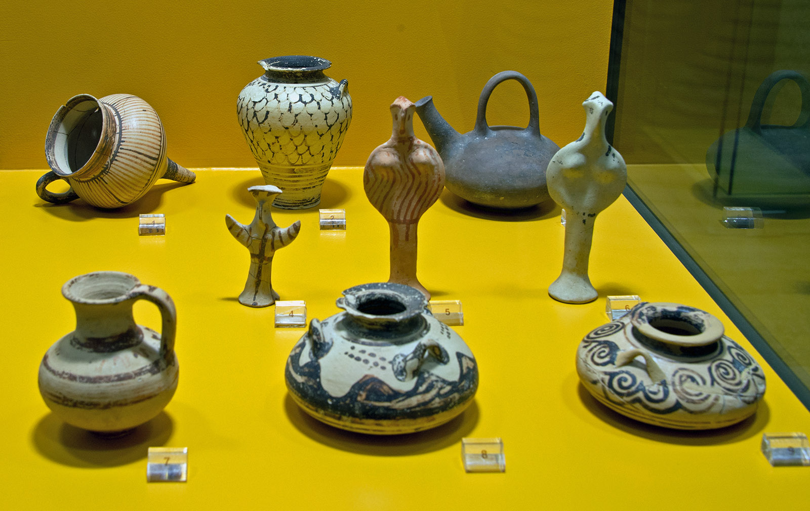 ミケーネ遺跡から出土した 「アガメムノンの黄金の仮面」、海底からみつかった「馬上の少年像」、 デロス島の「アフロディーテと牧神パンとエロスの像」「ポセイドンの青銅像」などが見られる。 1975年以降,サントリニ島出土の壁画群が特別展示されおり、見ものである。 |