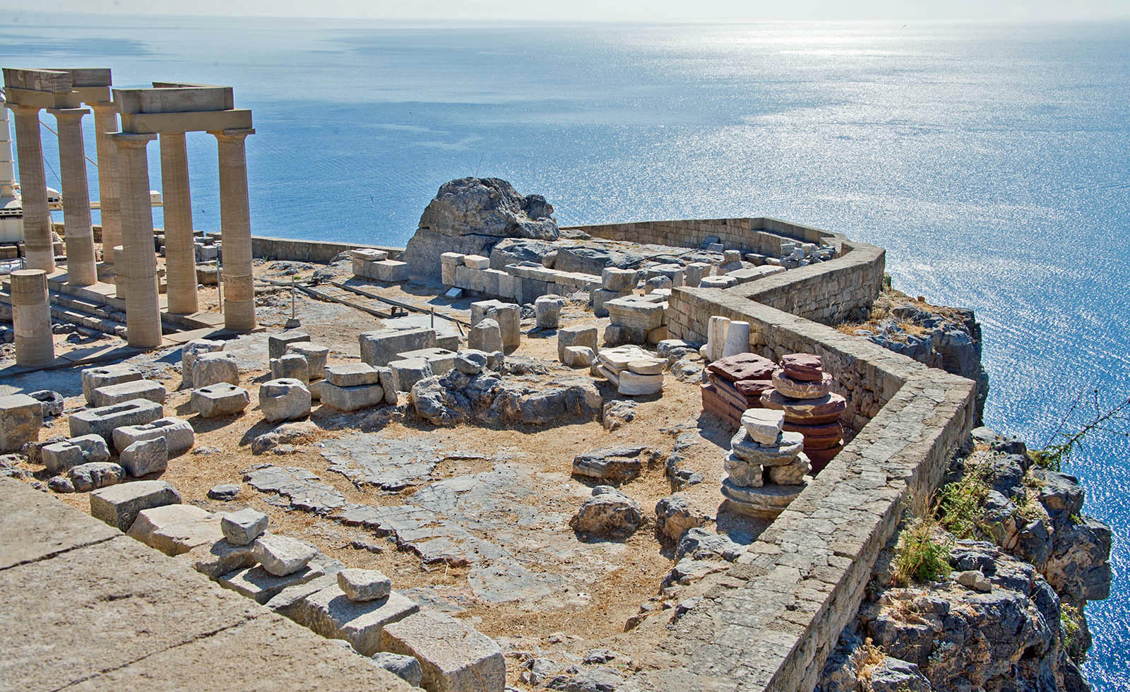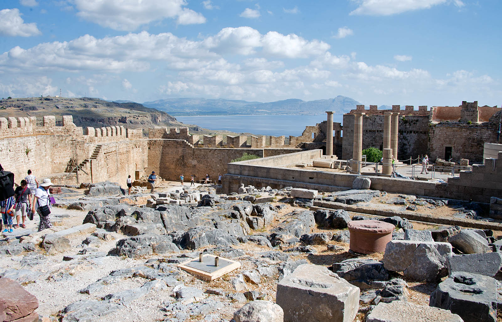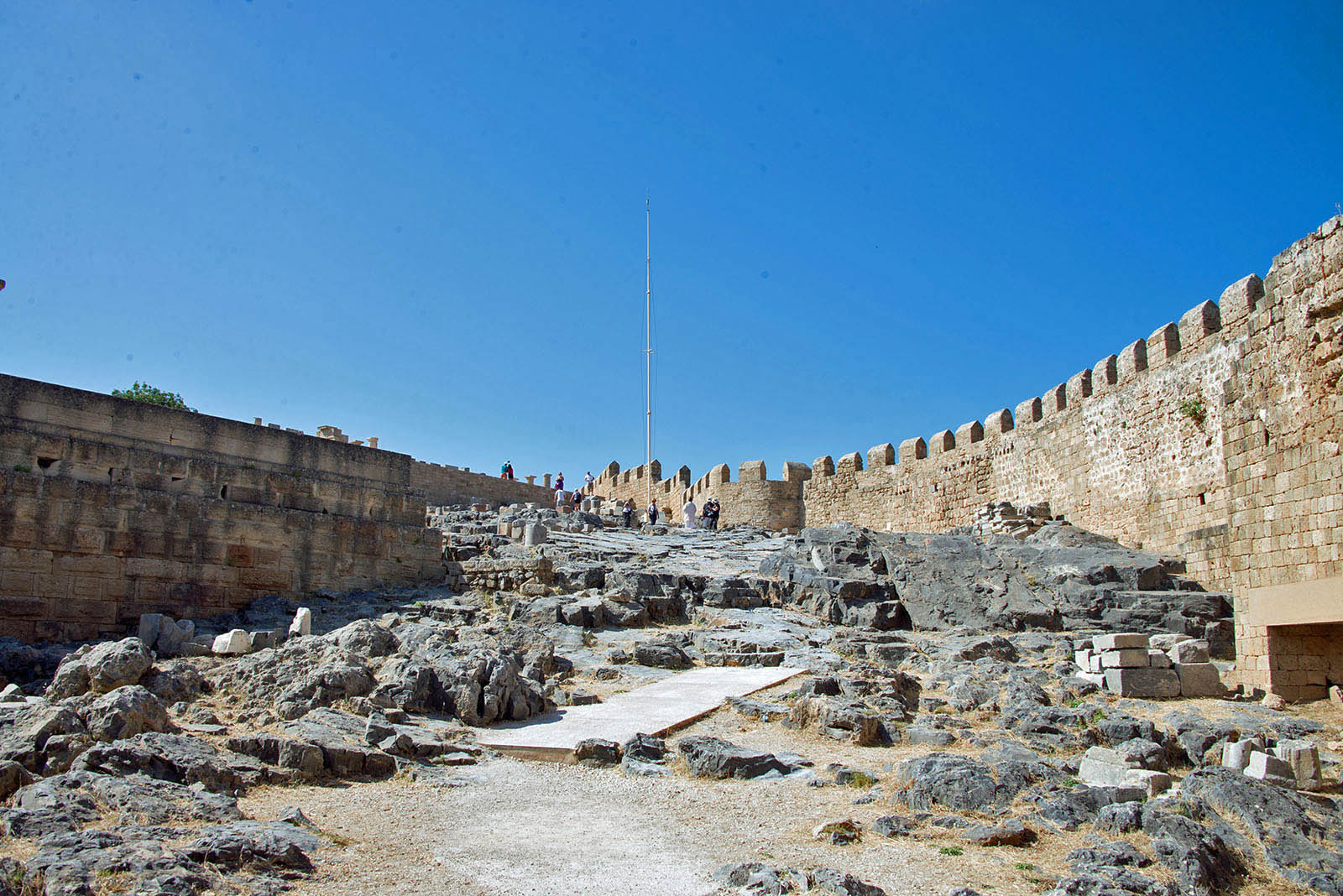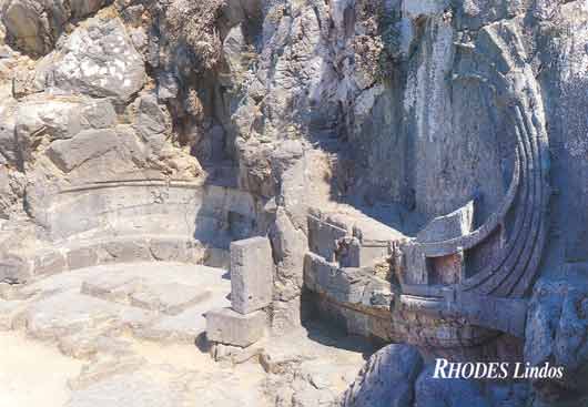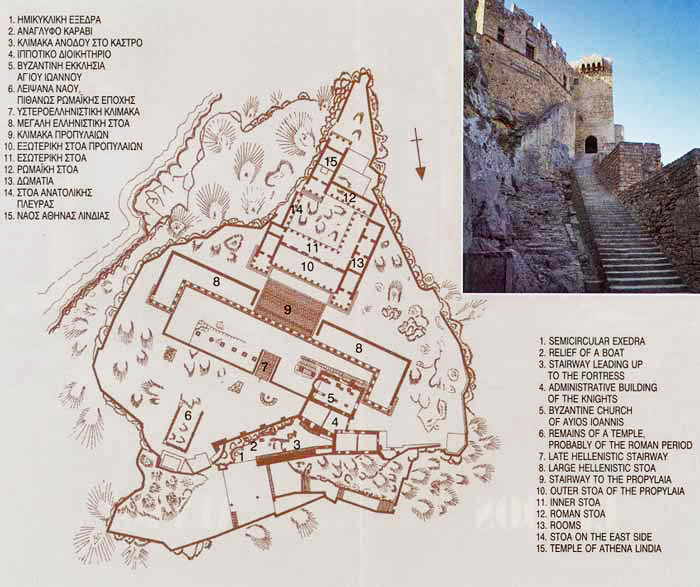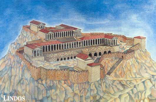 現代の街より海岸沿いの小高い丘にアクロポリスがあり、古典期には巨大なアテーナ・リンディアの神殿が建設され、 BC300年ごろに最終的な形に達した。ヘレニズム期とローマ帝国時代にはさらに神殿などが増築されて発展した。 中世初期には建物は廃墟となり、14世紀にはその上に聖ヨハネ騎士団が要塞を建設しオスマン帝国と対峙し、 さらにオスマン帝国が要塞として使った。このように地の利を得た要塞として、古代ギリシア、ローマ帝国、 東ローマ帝国、聖ヨハネ騎士団、オスマン帝国というように数奇な利用の歴史を持つために、 発掘とその考古学的解釈が難しくなっている。 |