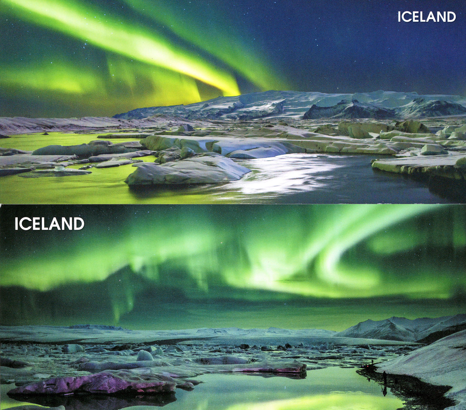 こんなオーロラ見えたらいいなあ。氷河湖のオーロラ(絵はがき)