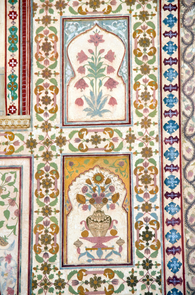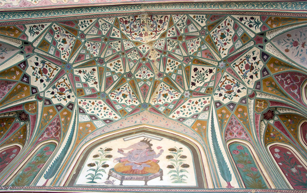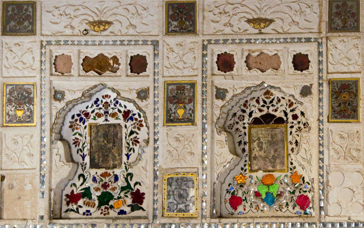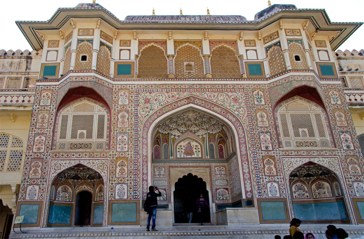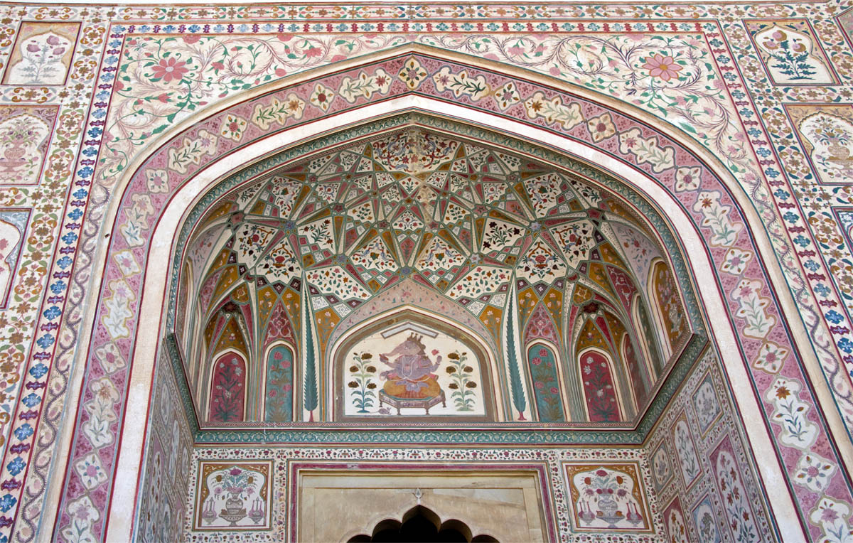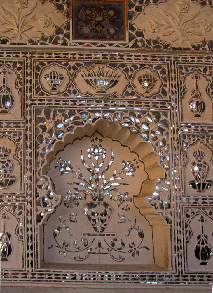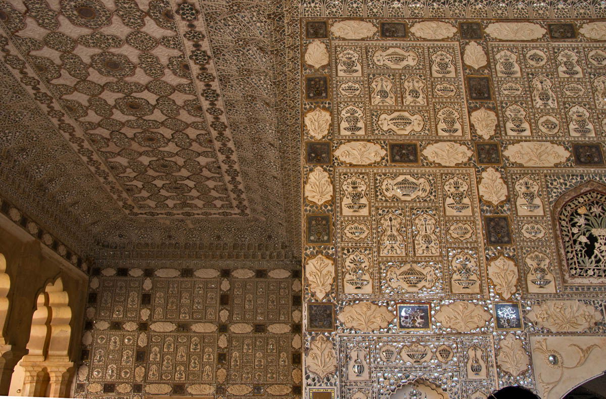 鏡の間は壁面に鏡を散りばめ,ガネーシャ門はフレスコ画や透かし窓など装飾が美しい.