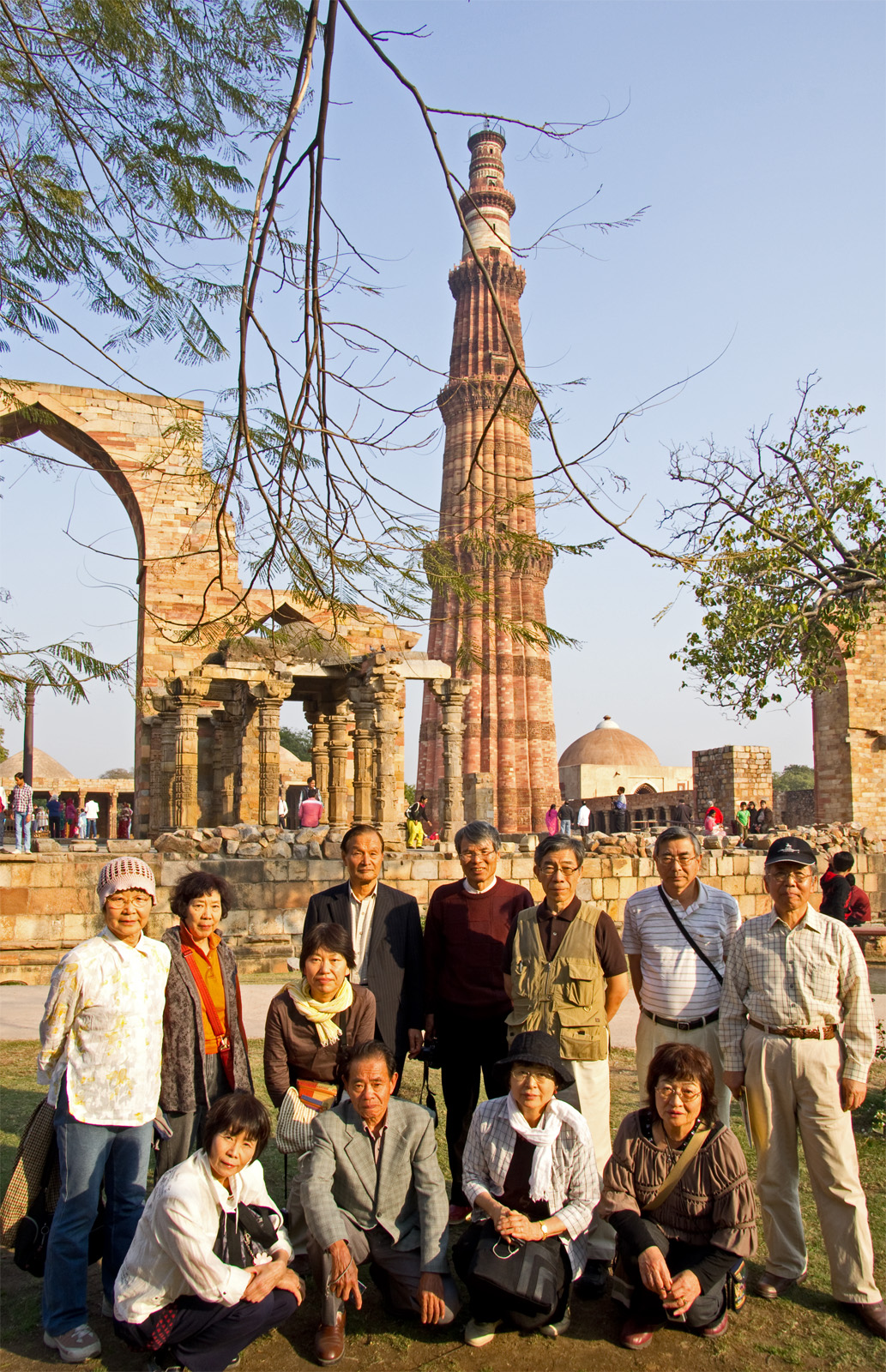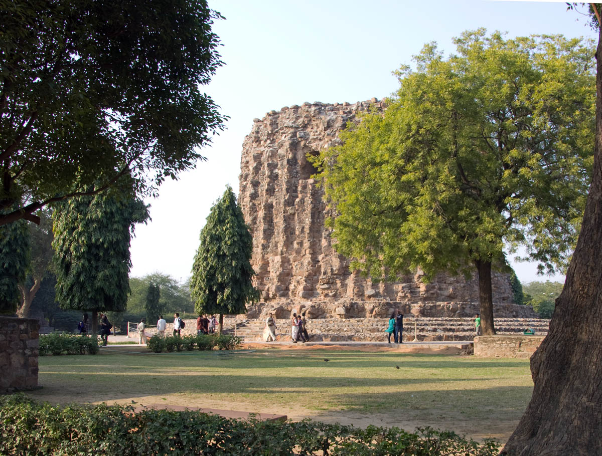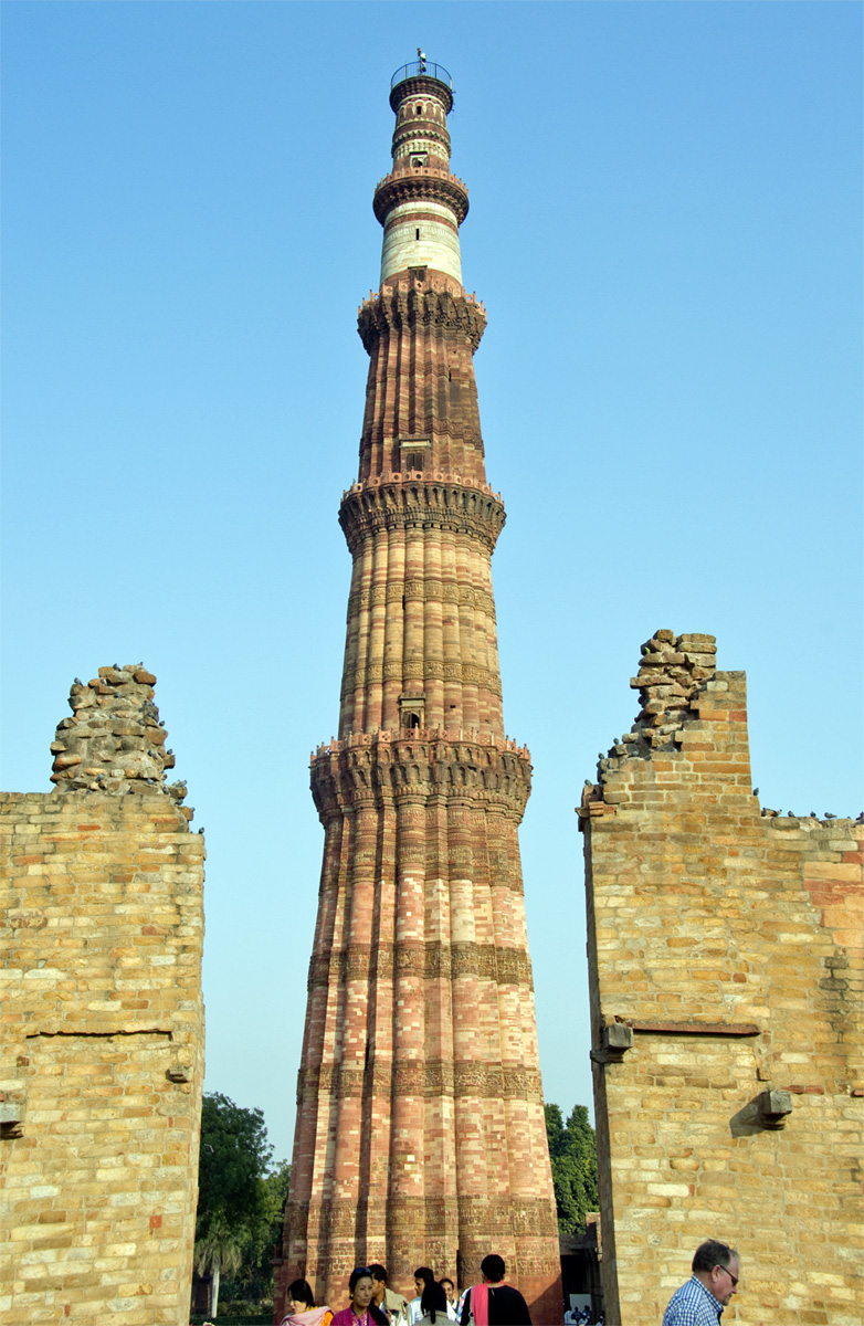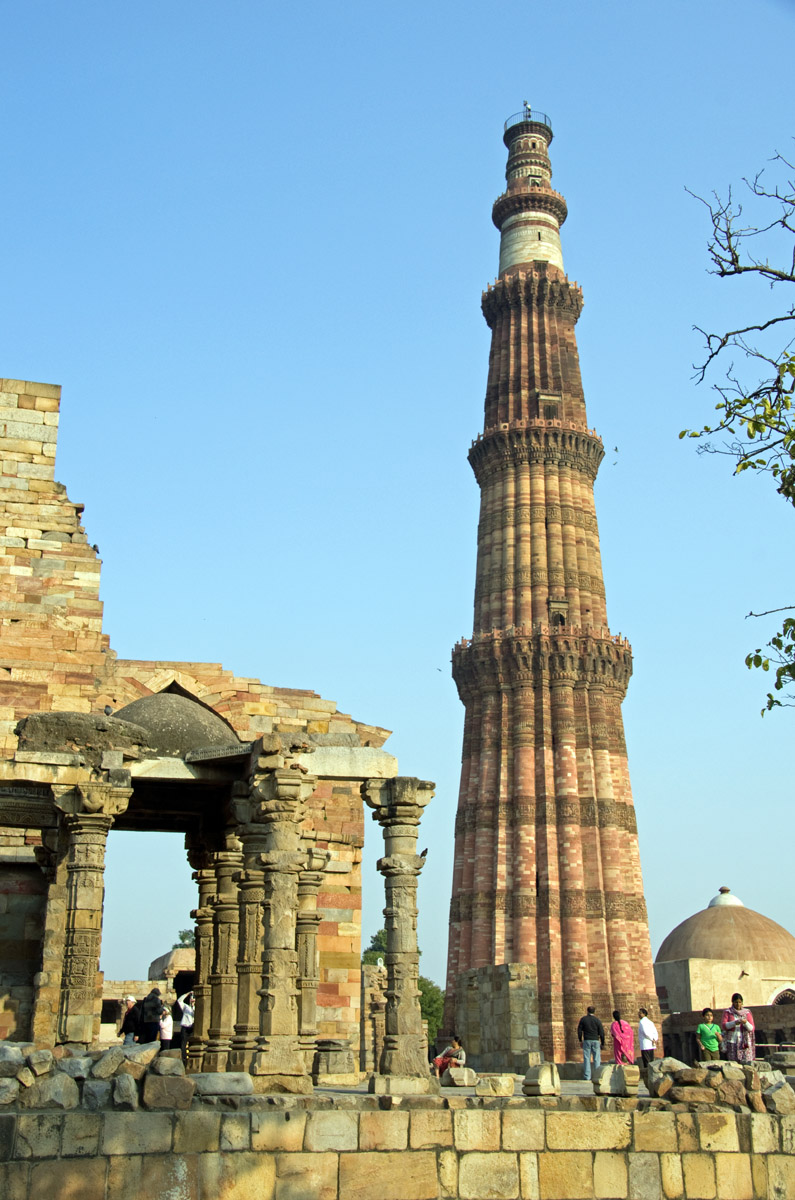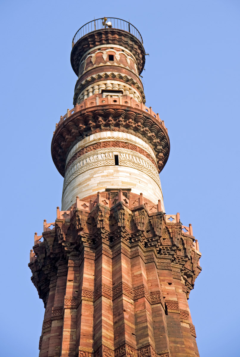 1200年頃にアイバク帝が戦争勝利の記念碑として3層まで建設したイスラム建築様式の巨大な尖塔.14世紀にはフィルーズ・シャー帝が塔の白い部分の4層と5層を増築した.