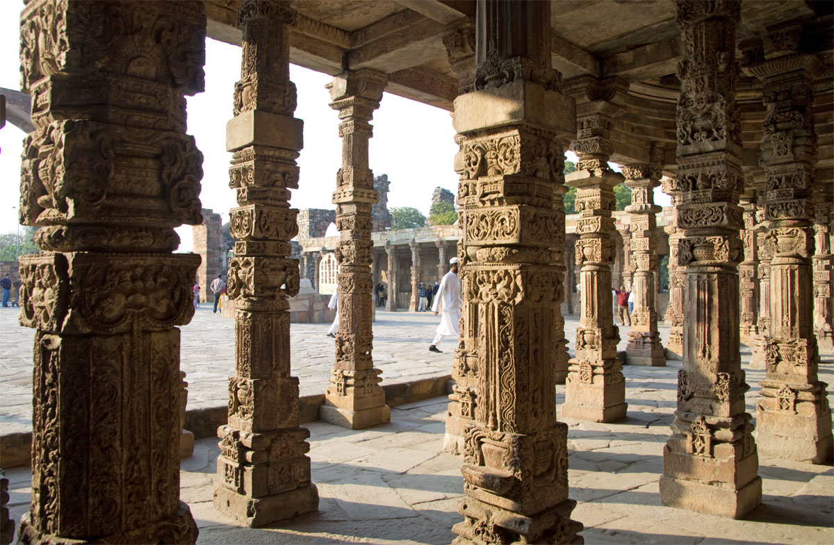 アイバク帝は周辺のヒンドゥー教やジャイナ教の寺院を廃止・解体し,それらの石材をモスクの建材に流用.イスラム教では偶像崇拝は禁止され,建築に神や動物の像はなく,図案化した草花や幾何学模様のみ.しかし、このモスクではヒンドゥー寺院の石建材をそのまま使用したために,女神像などが柱に残されている.