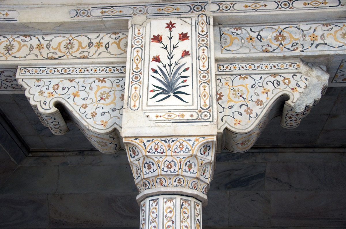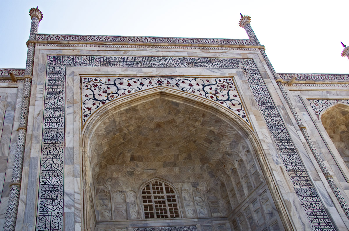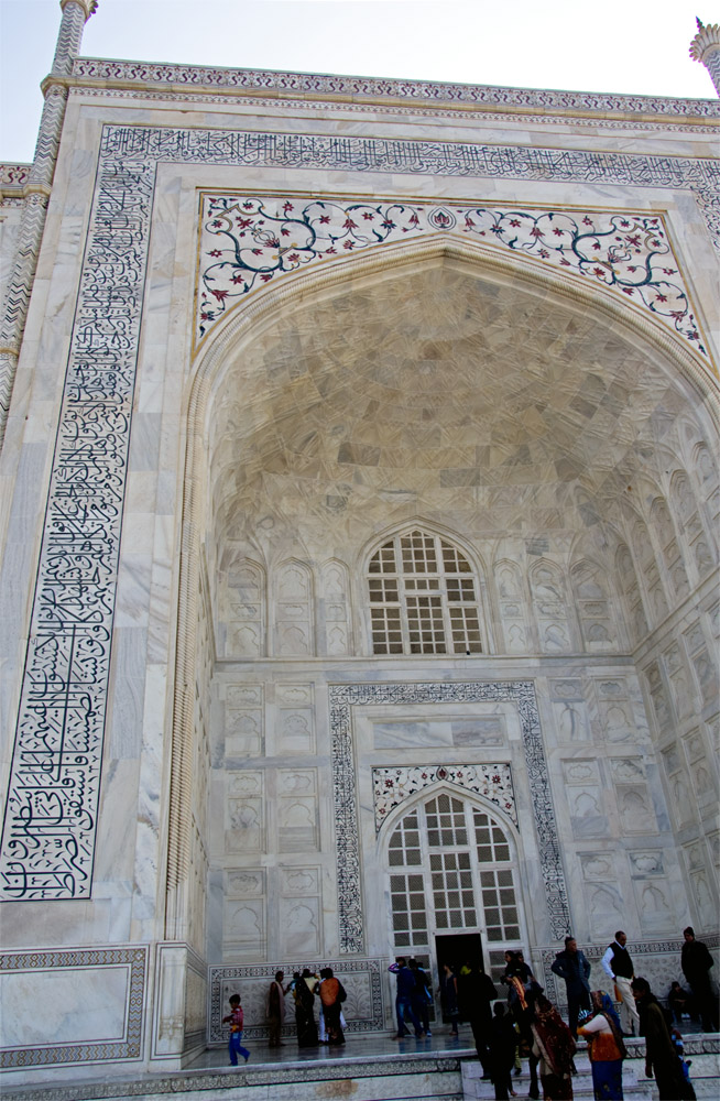 霊廟入口,アーチの縁取にコーランの文句を 図案化した文字が黒大理石で描かれている