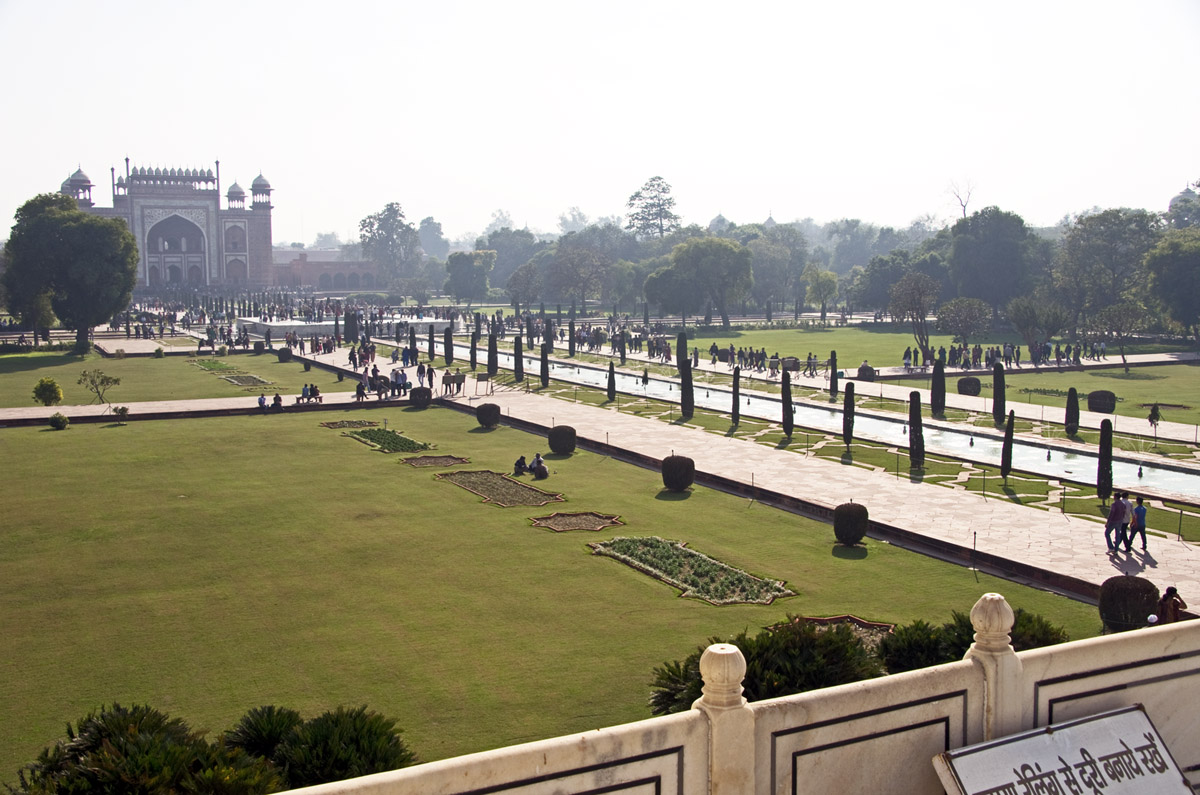 南門から四分庭園(バギーチャー),霊廟,西側のモスク(マスジド)を見る