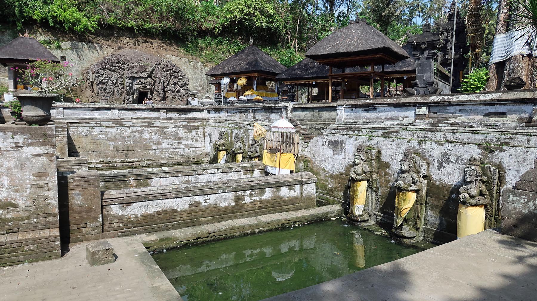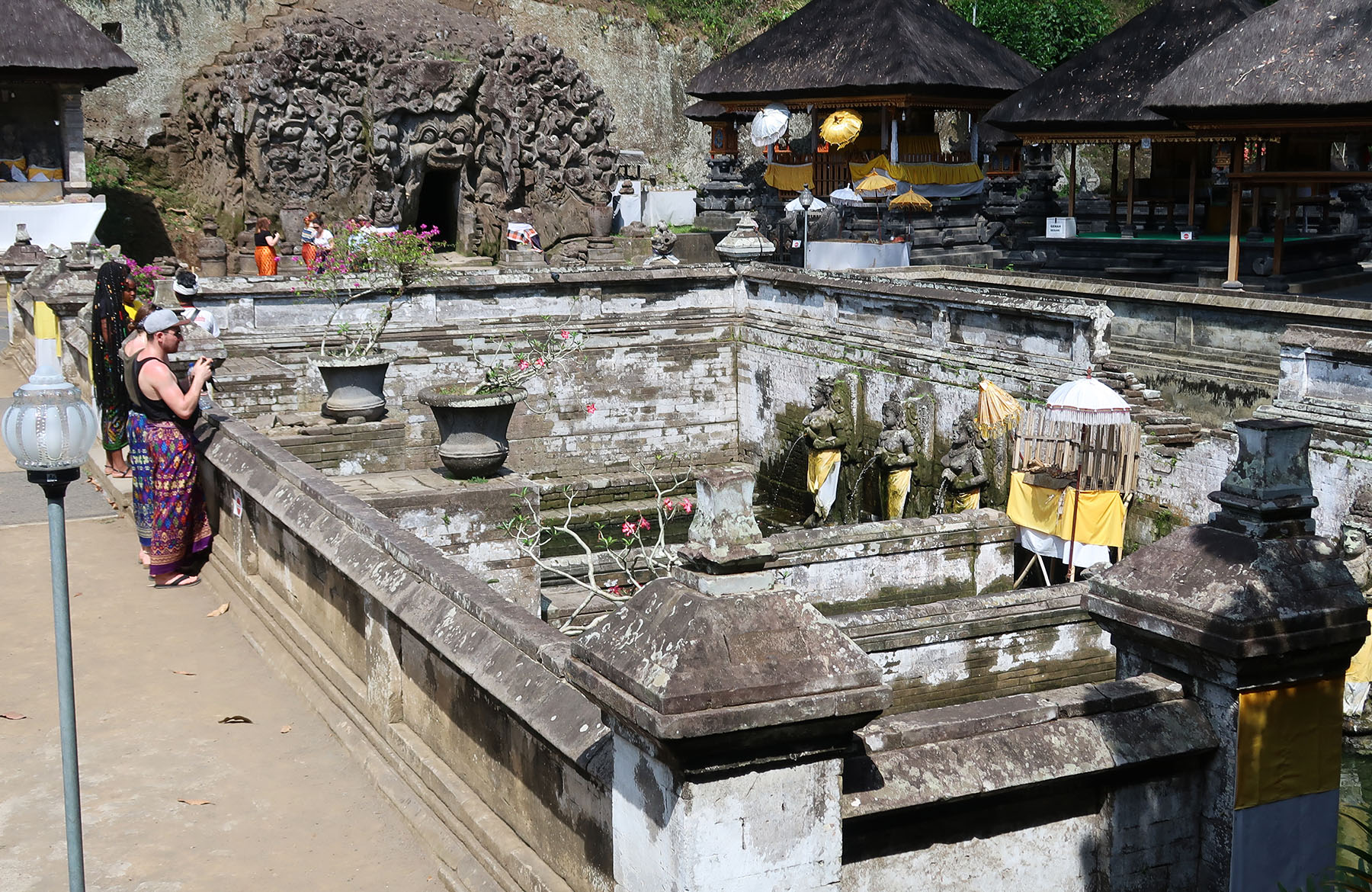 顔のレリーフが掘られた洞窟とその手前の広場には女神が彫られた沐浴場があります。この沐浴場は1945年に発見され戦後バリ島最大の発見と言われています。