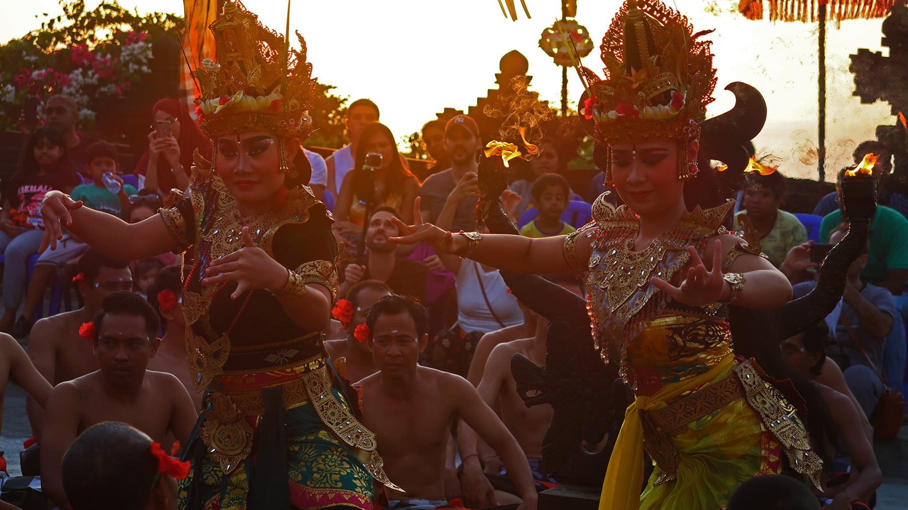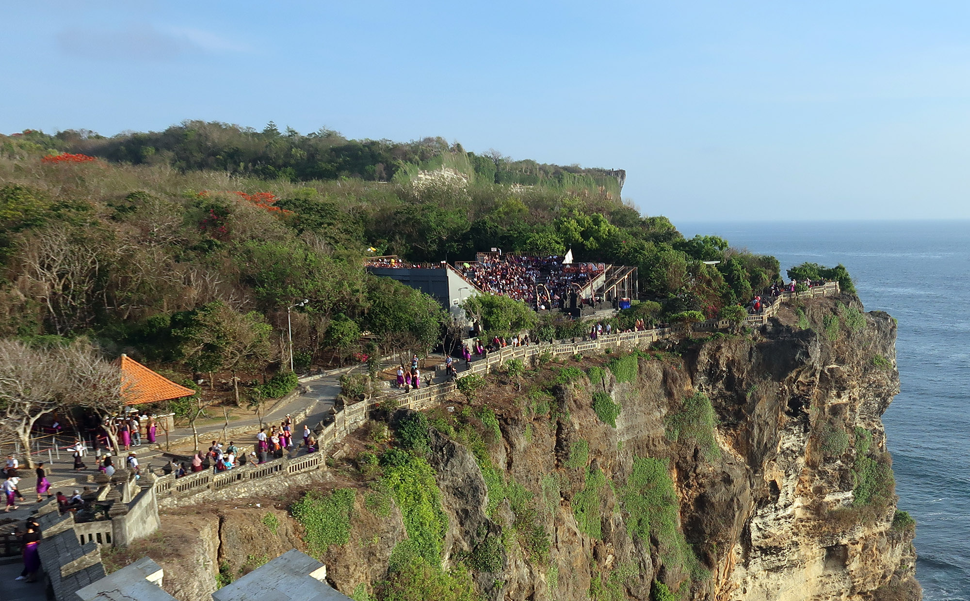 夕日が沈む前に始まるダンスも半ばになると日がインド洋に沈みます。ウルワツ寺院の3重のメルも遠くに見えとても絵になる光景です。