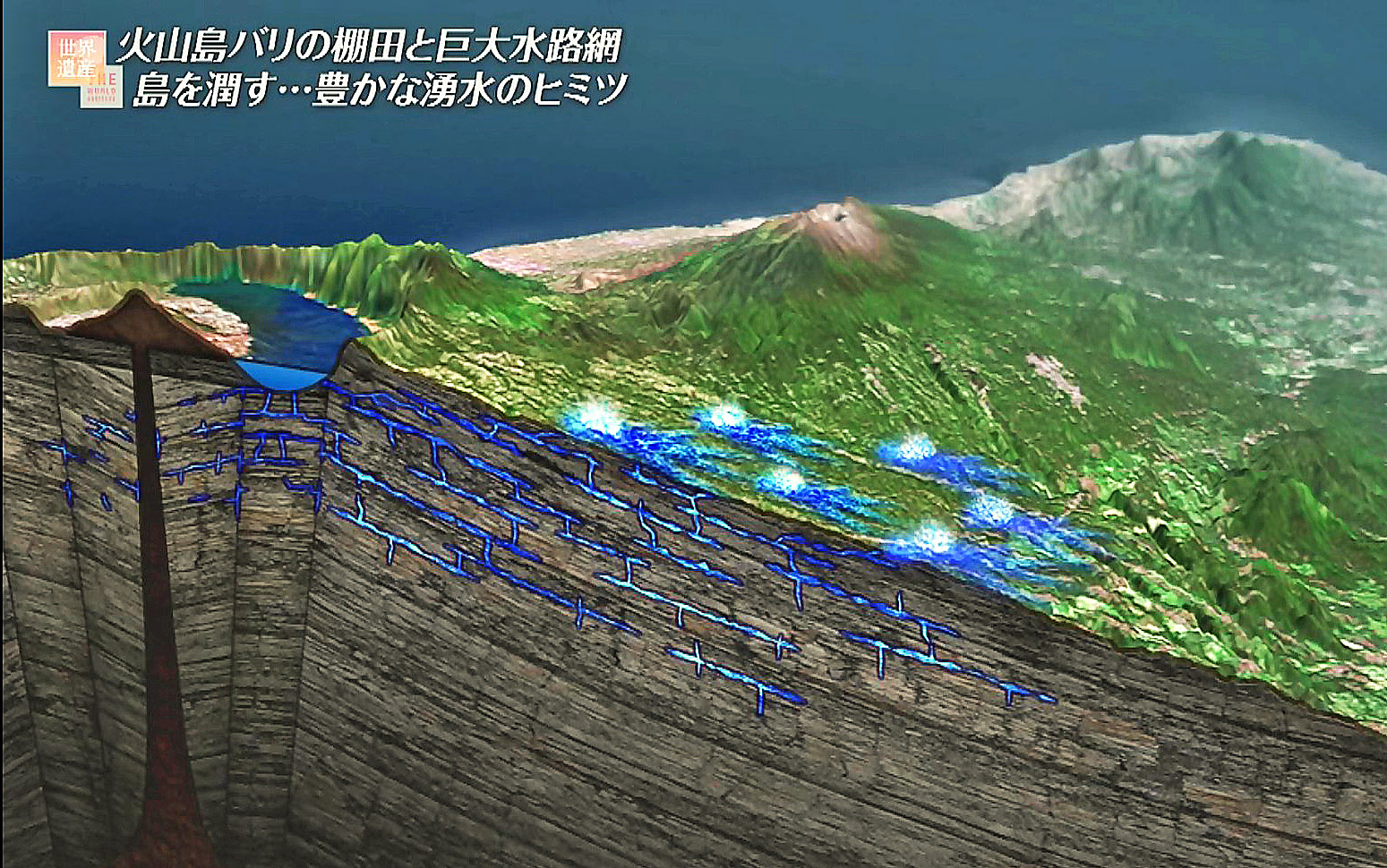 バトール火山のカルデラ湖から火山岩によりできた水を通しやすい層を持つ地下水通路が山麓に多くの湧き水をもたらしている。