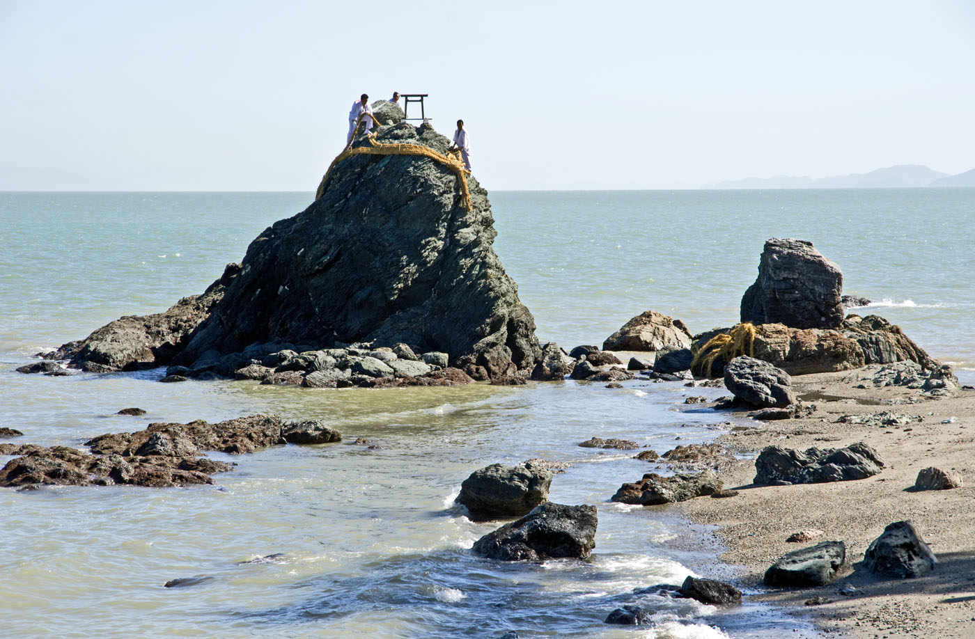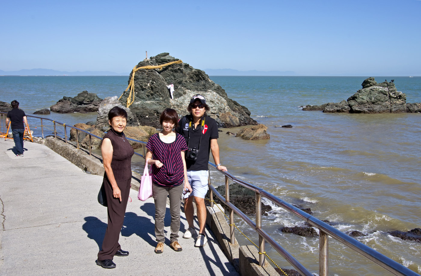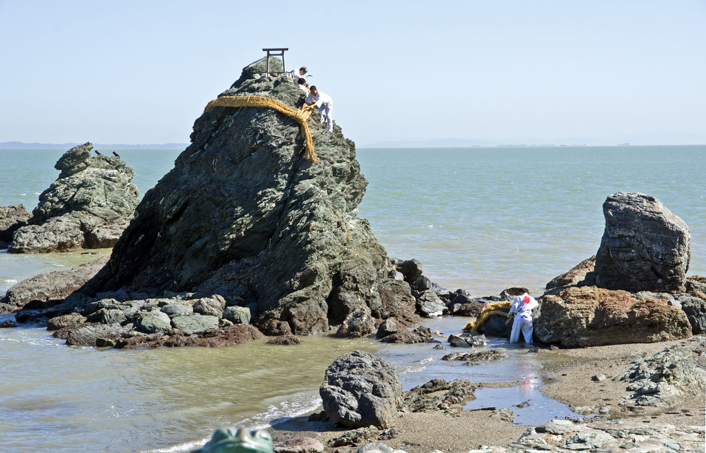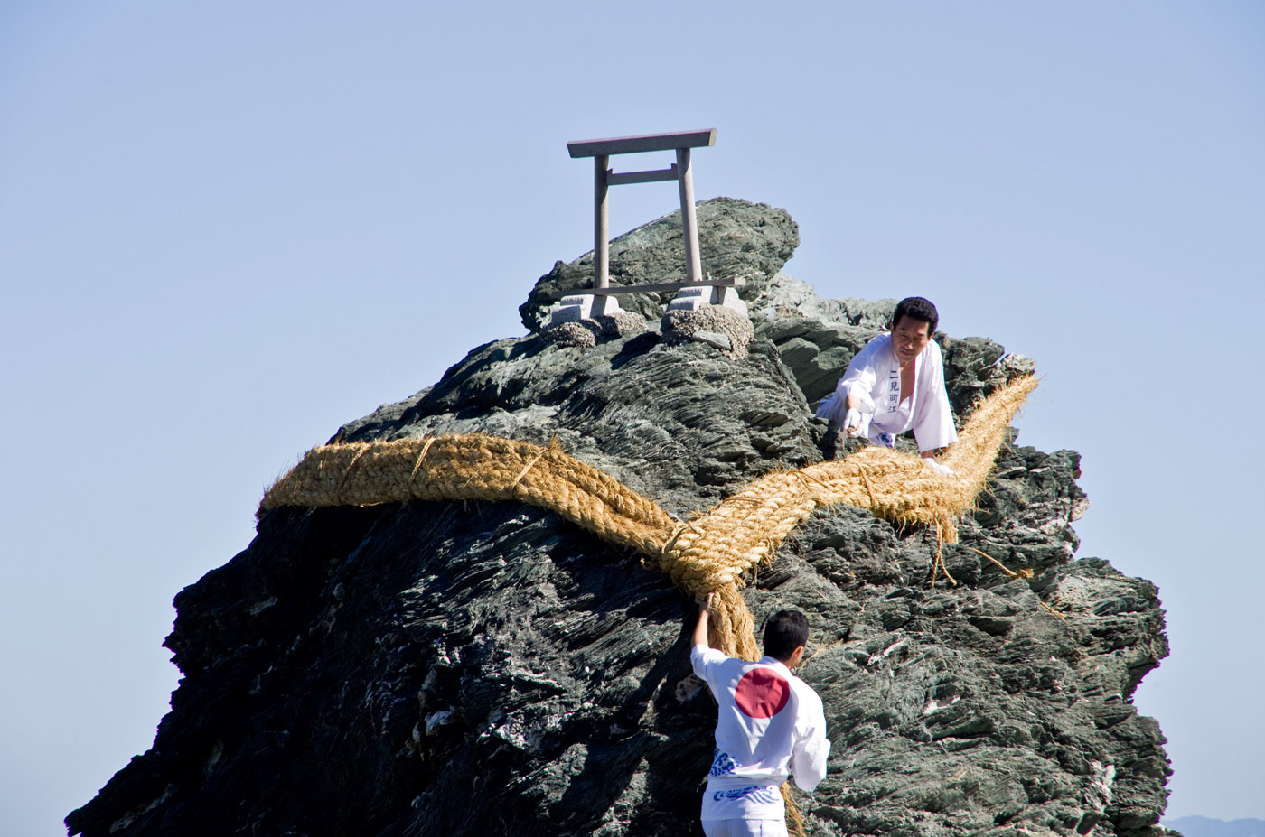 前日の台風の荒波で夫婦岩の縄が切れていた