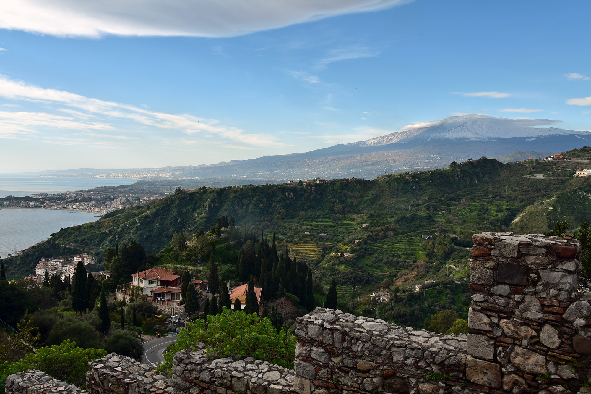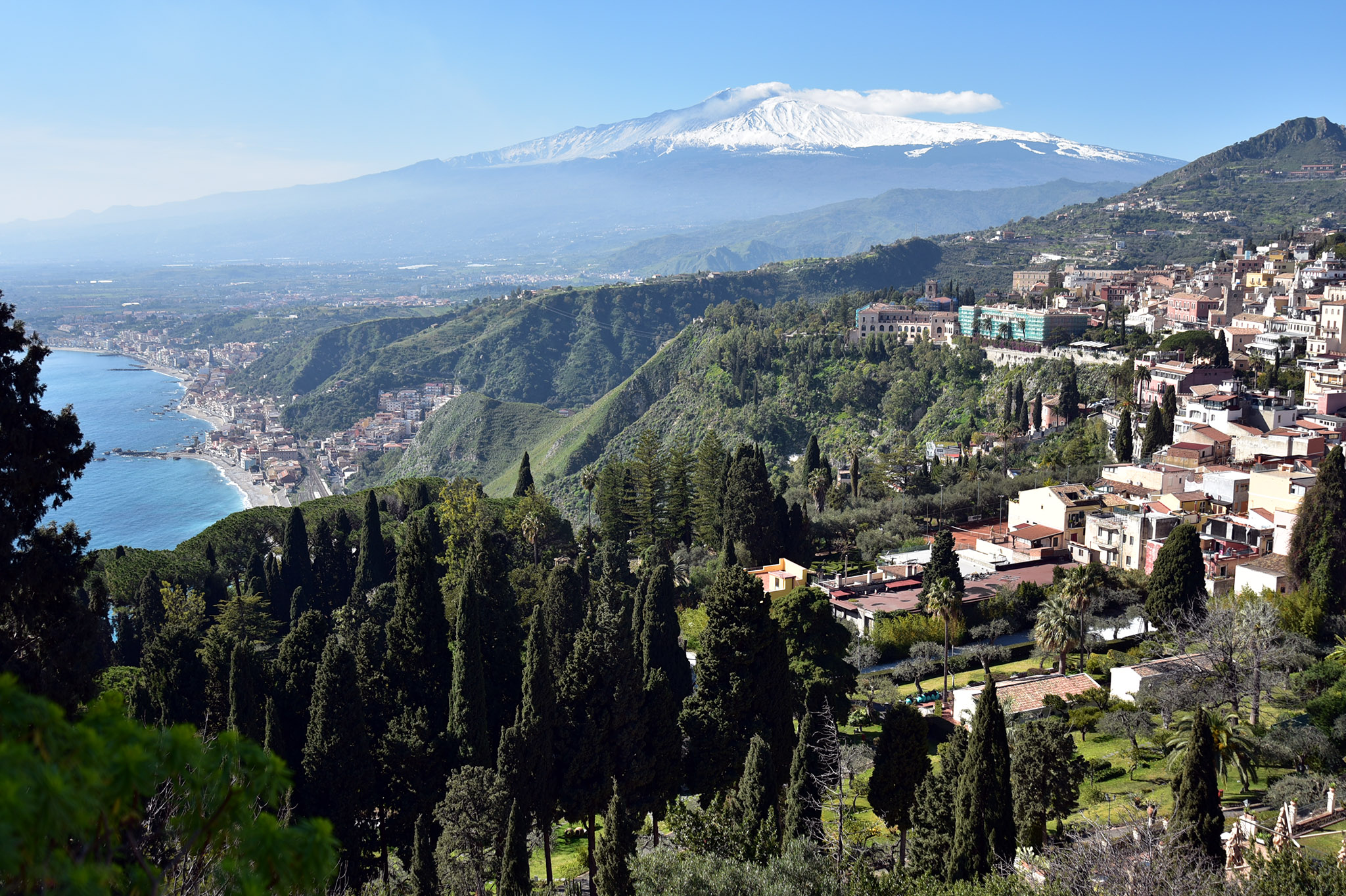 劇場入口から見たタオルミナの街とエトナ山 糸杉が美しい
