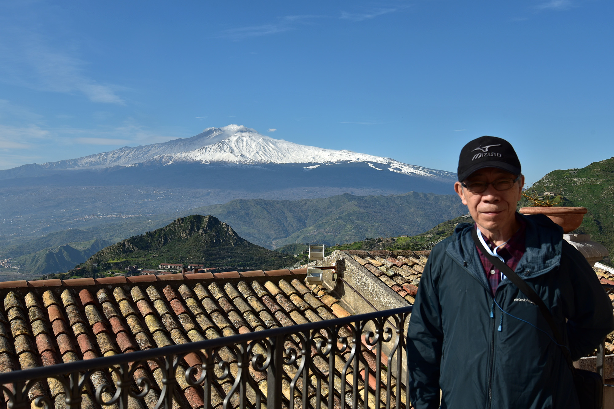 ホテルから見たエトナ山 カタニャの街に近くイオニア海から美しい円錐形をしている。
