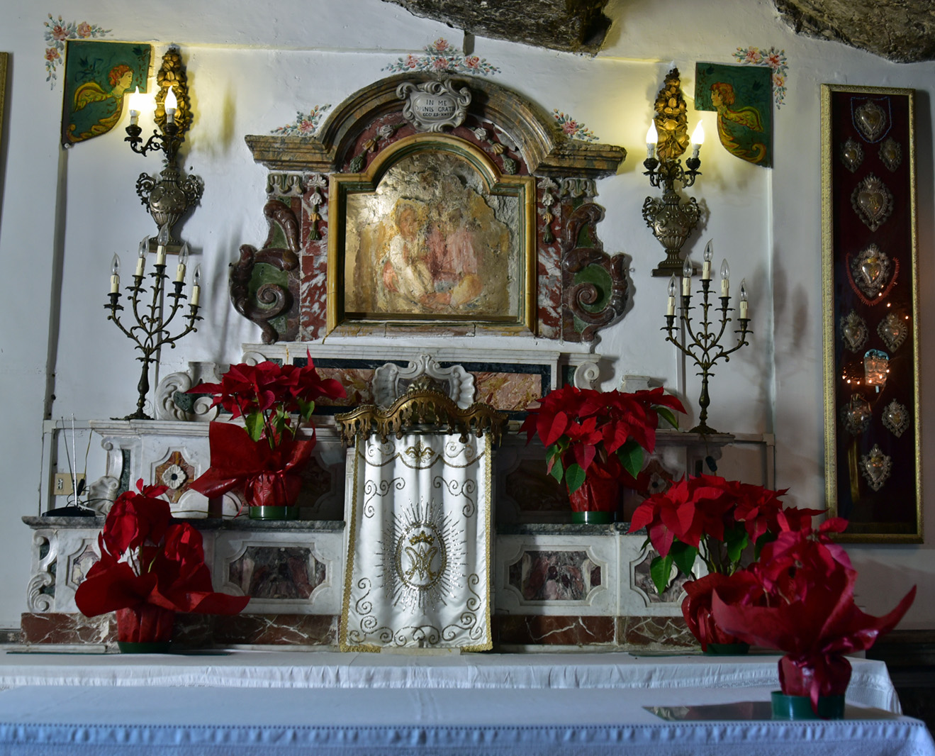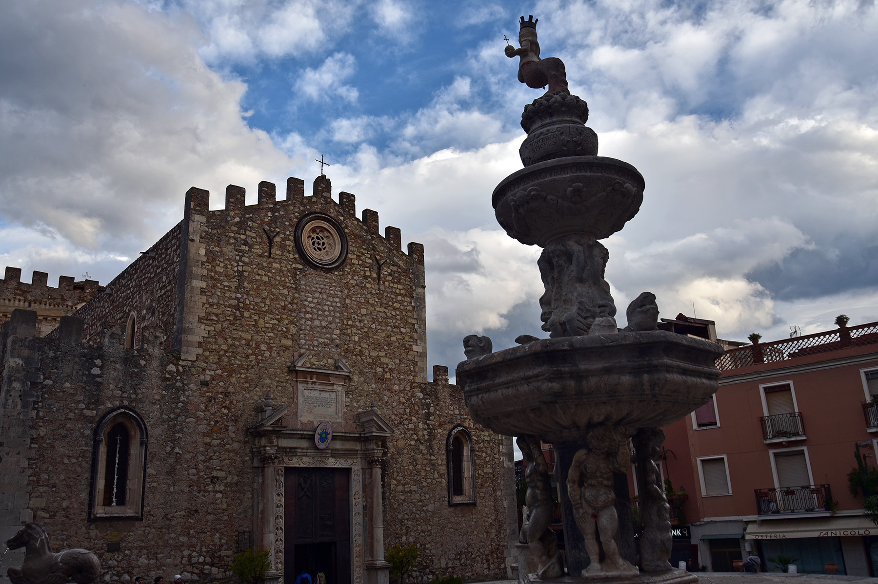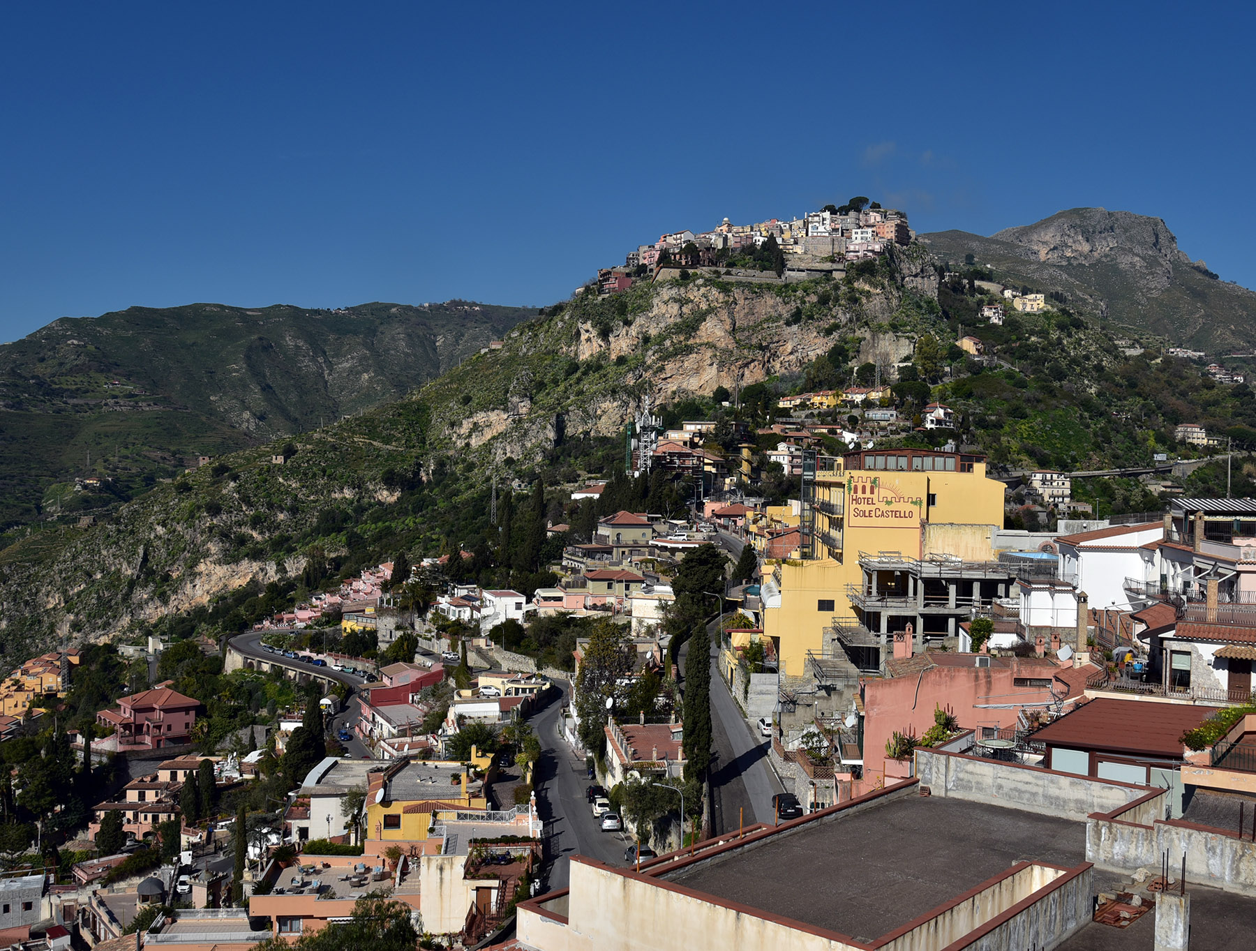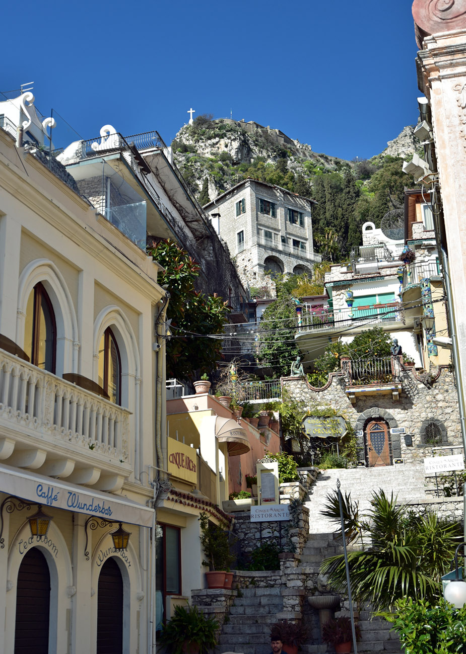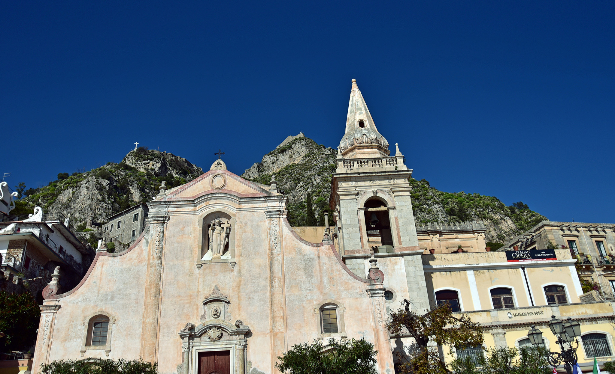 「岩の聖母教会」は標高400mにあるタウロ山にある岩をくり抜いて作った教会。岩の上に立つ十字架はタオルミナのどこからも見えるシンボル。入口からタオルミナのパノラマが素晴らしい、ギリシャ時代にはアクロポリスであり、隣の山にはアラブ時代の要塞がある。