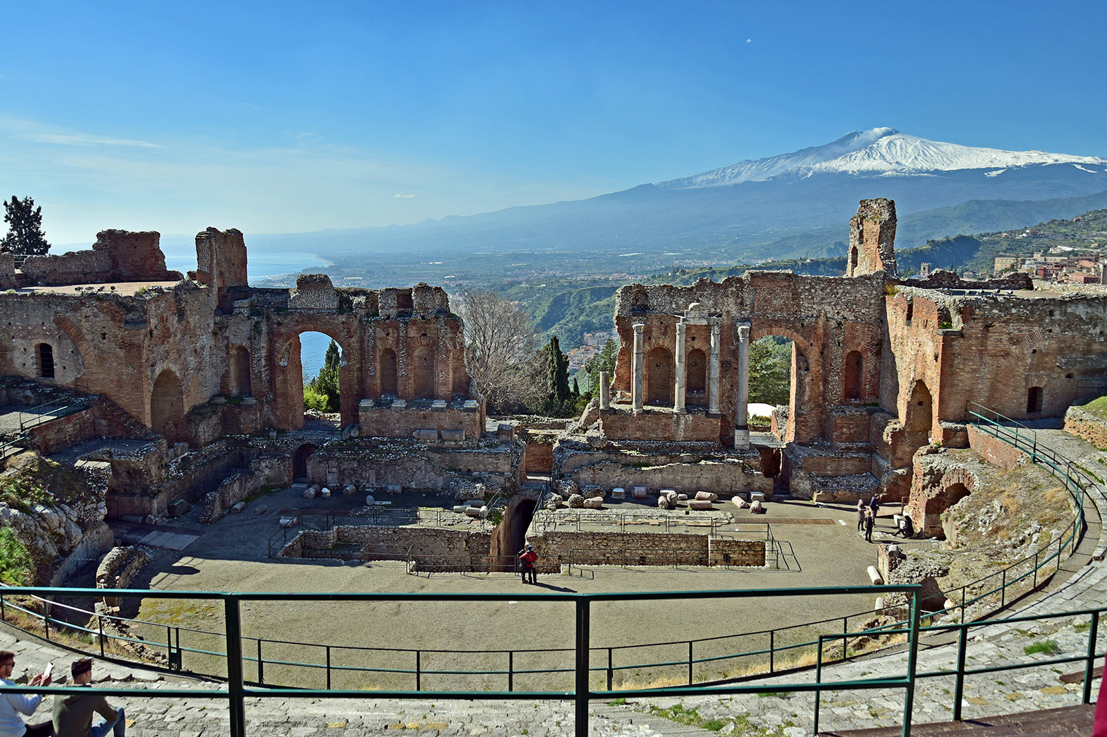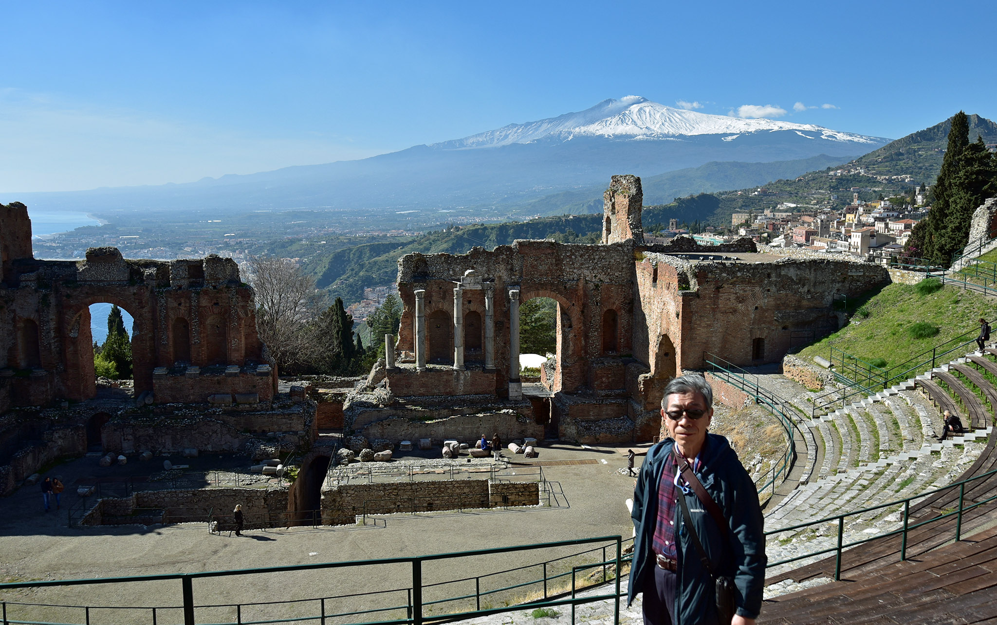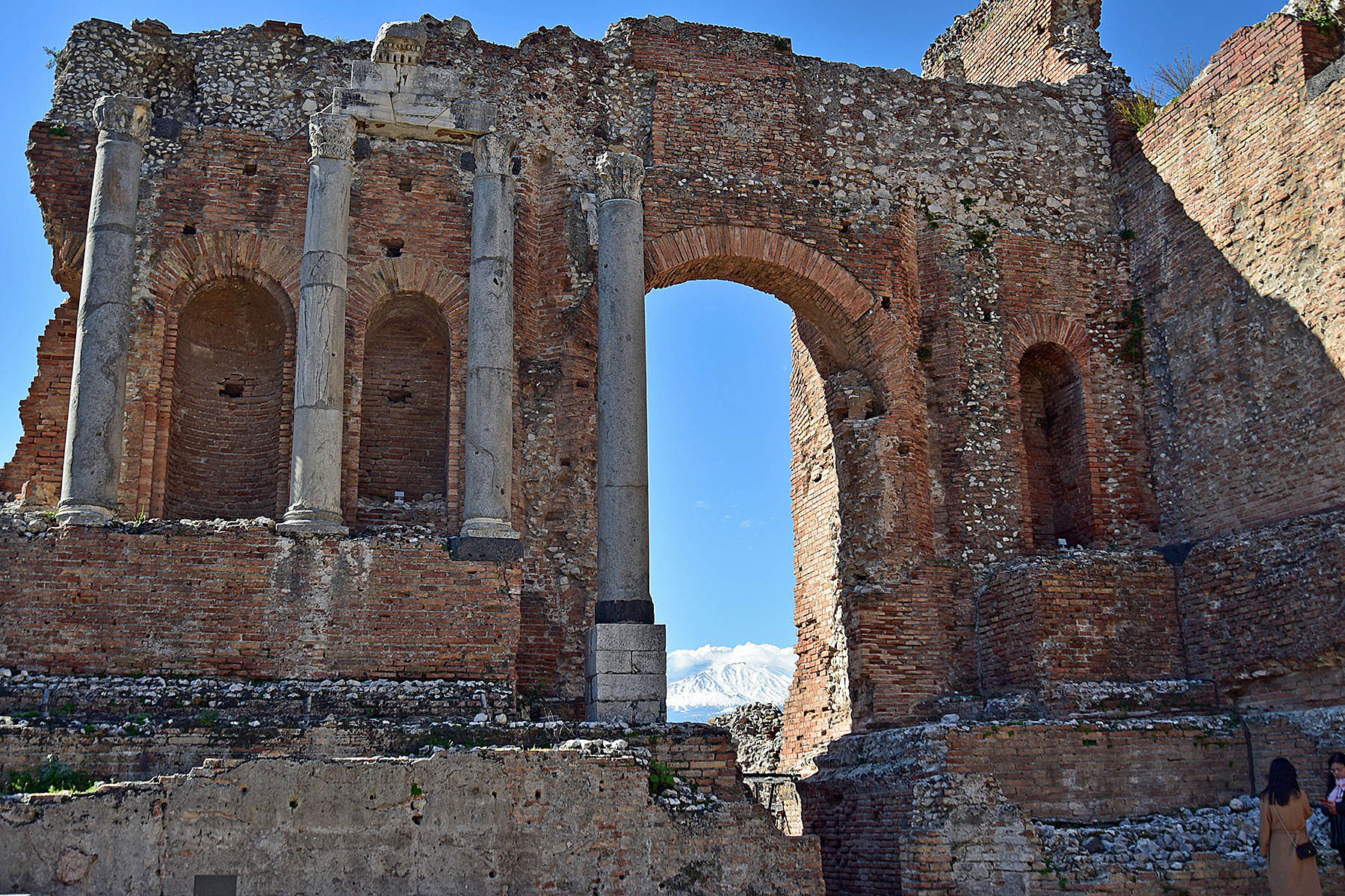 ギリシャ劇場はBC3世紀に建設された、背後のエトナ山も借景した美しい劇場、ローマ時代にはバックステージに高い壁を増築し血なまぐさい闘技場になった。