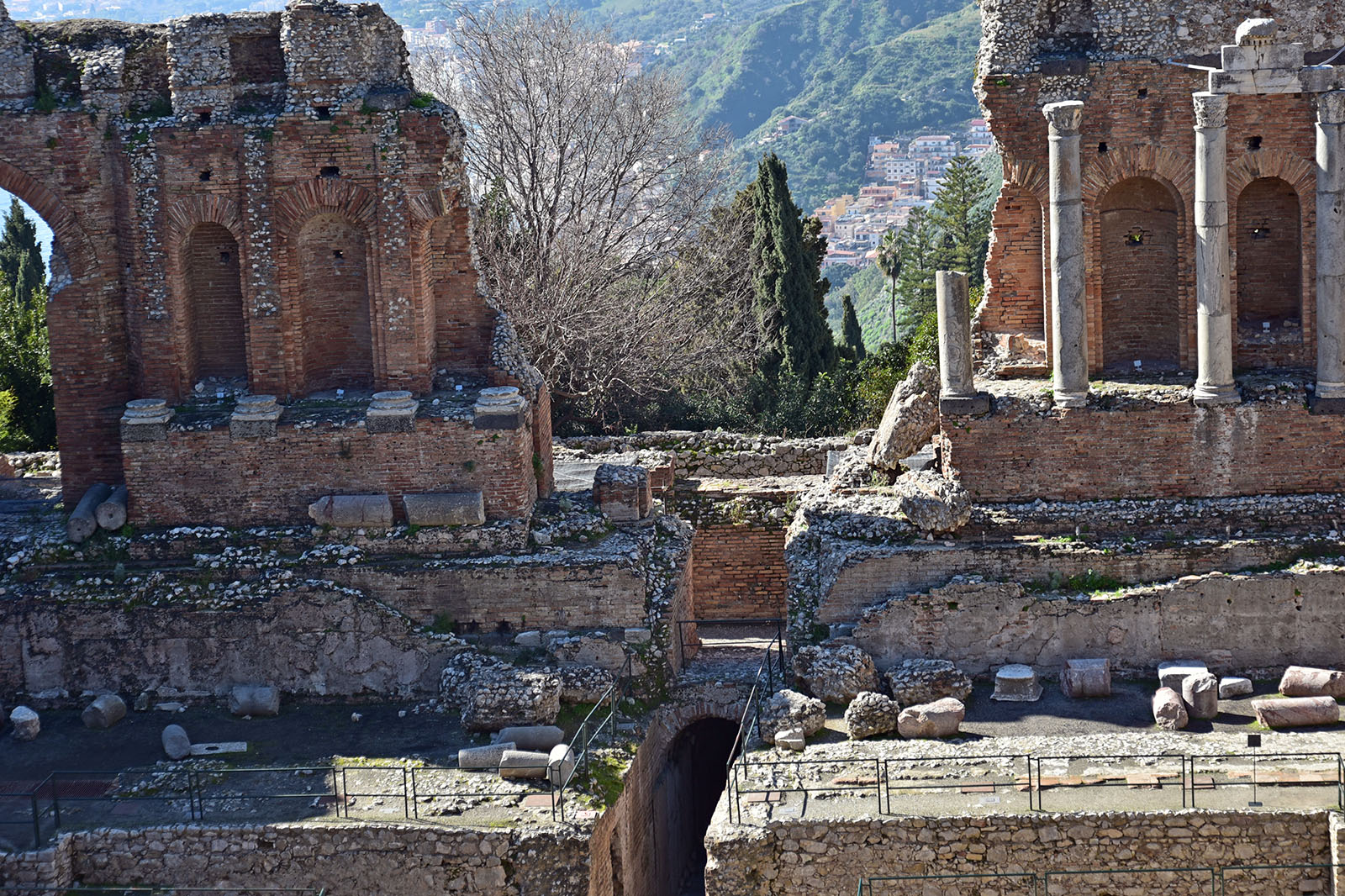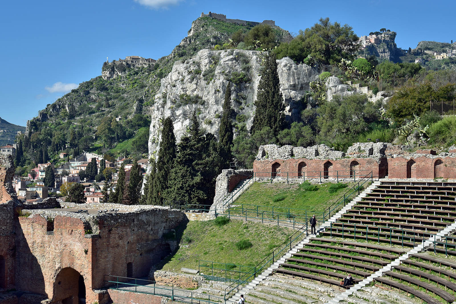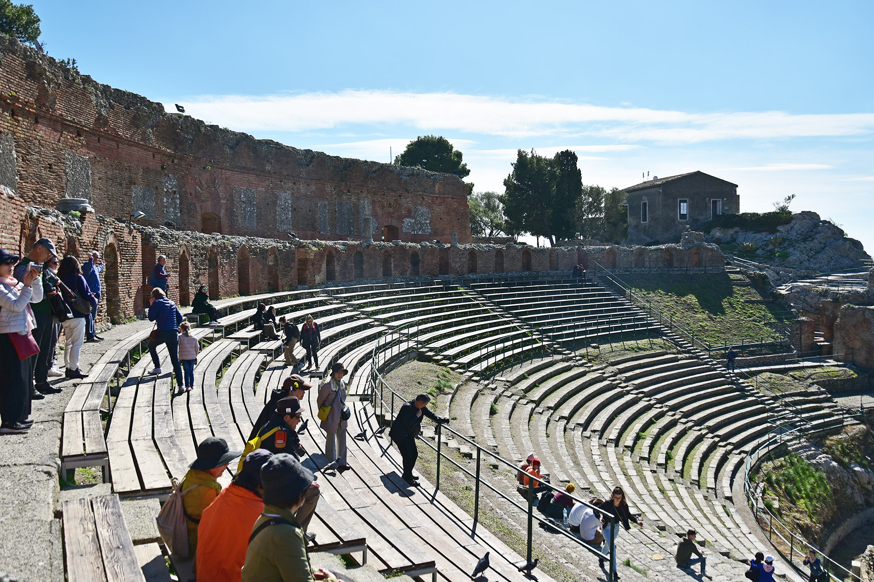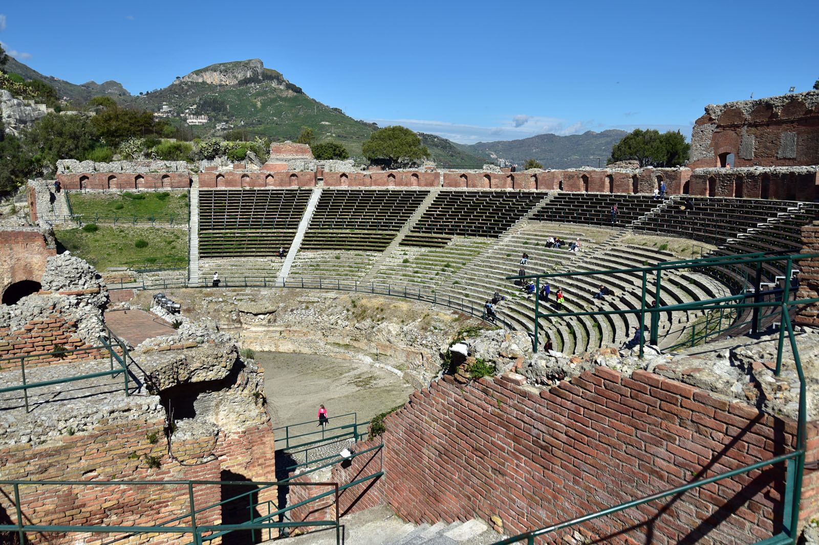 ギリシャ劇場はBC3世紀に建設された、背後のエトナ山も借景した美しい劇場、ローマ時代にはバックステージに高い壁を増築し血なまぐさい闘技場になった。