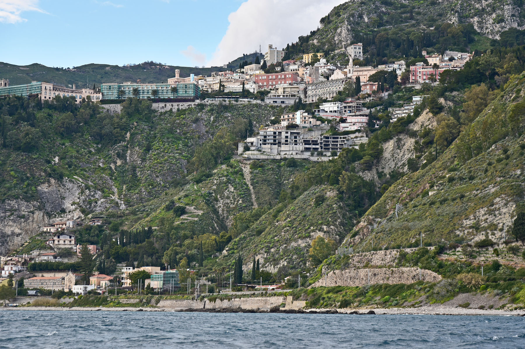 海から見上げるタオルミナの街 ホテル、礼拝堂などが見える