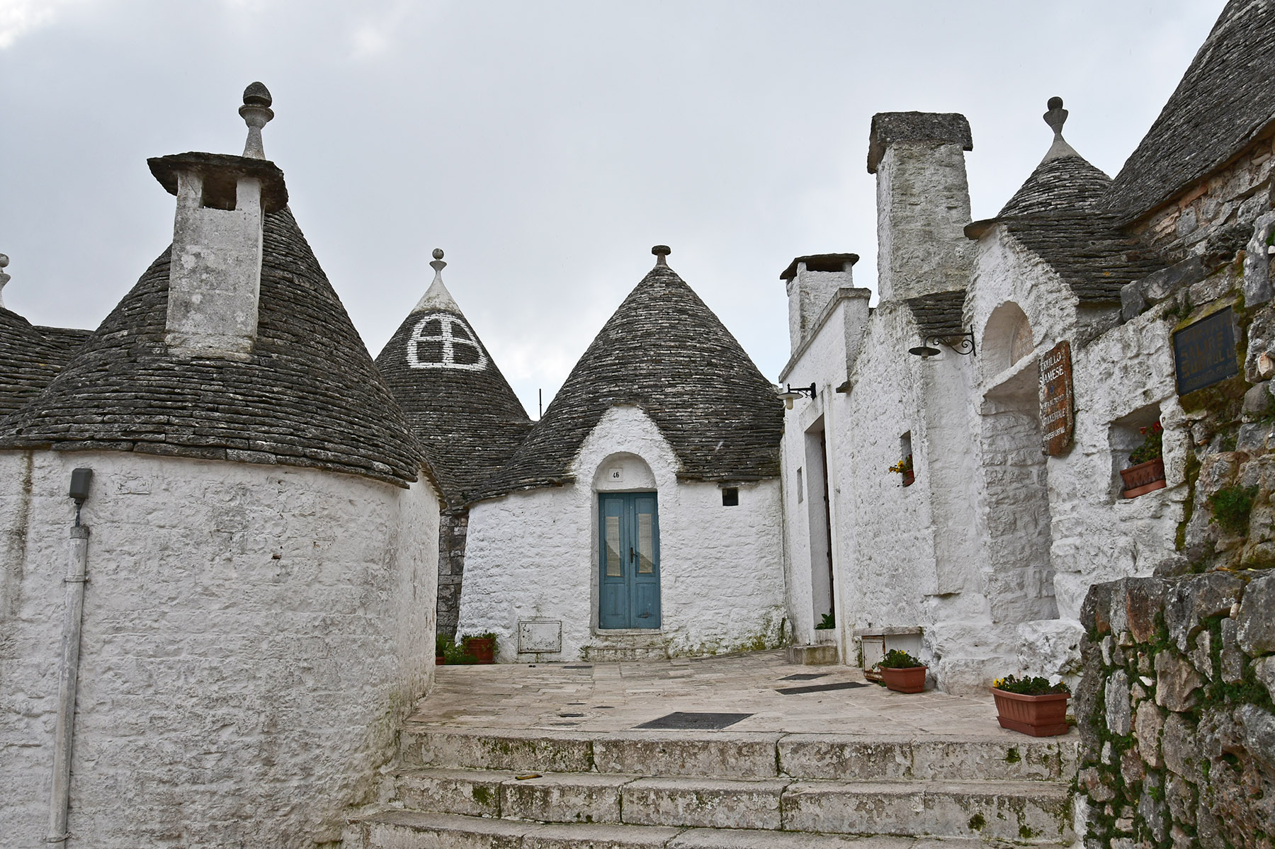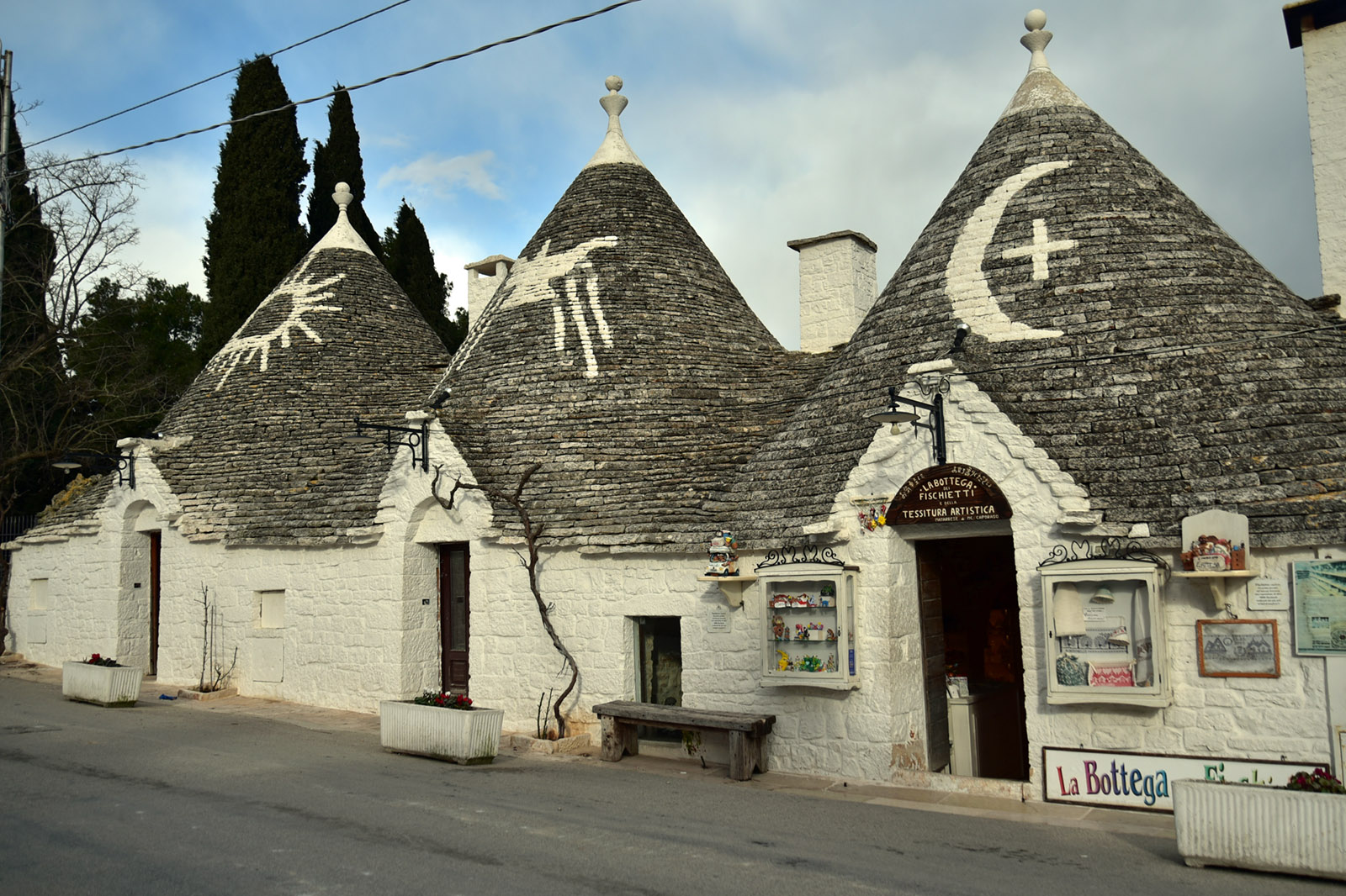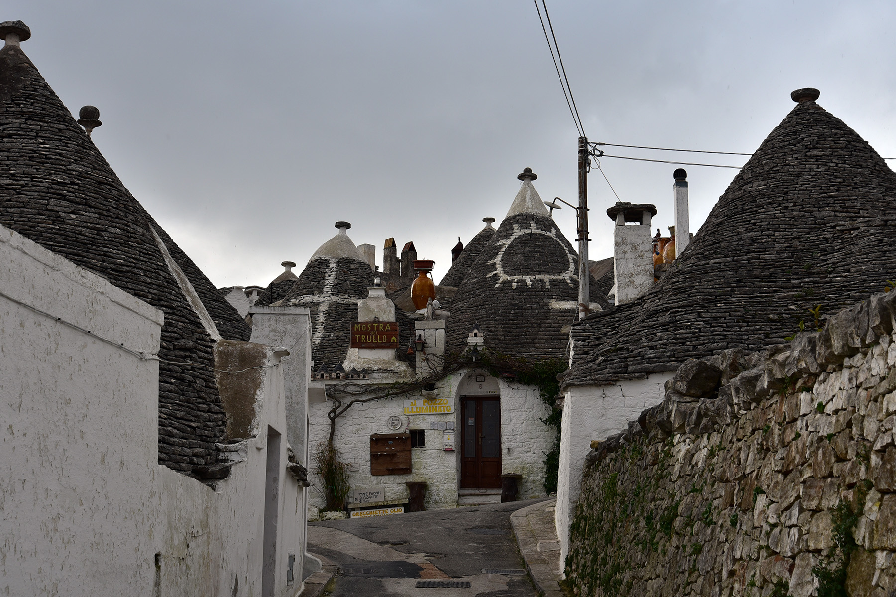 アルベロベッロは17世紀ごろから建築の始まった円錐形の石の屋根と白い石の壁が特長的なトゥルッリの街並みで有名。モンティ地区は商業地区で、ショップ、レストランがある。 アイア・ピッコラ地区は住宅がある。1996年に世界遺産登録。