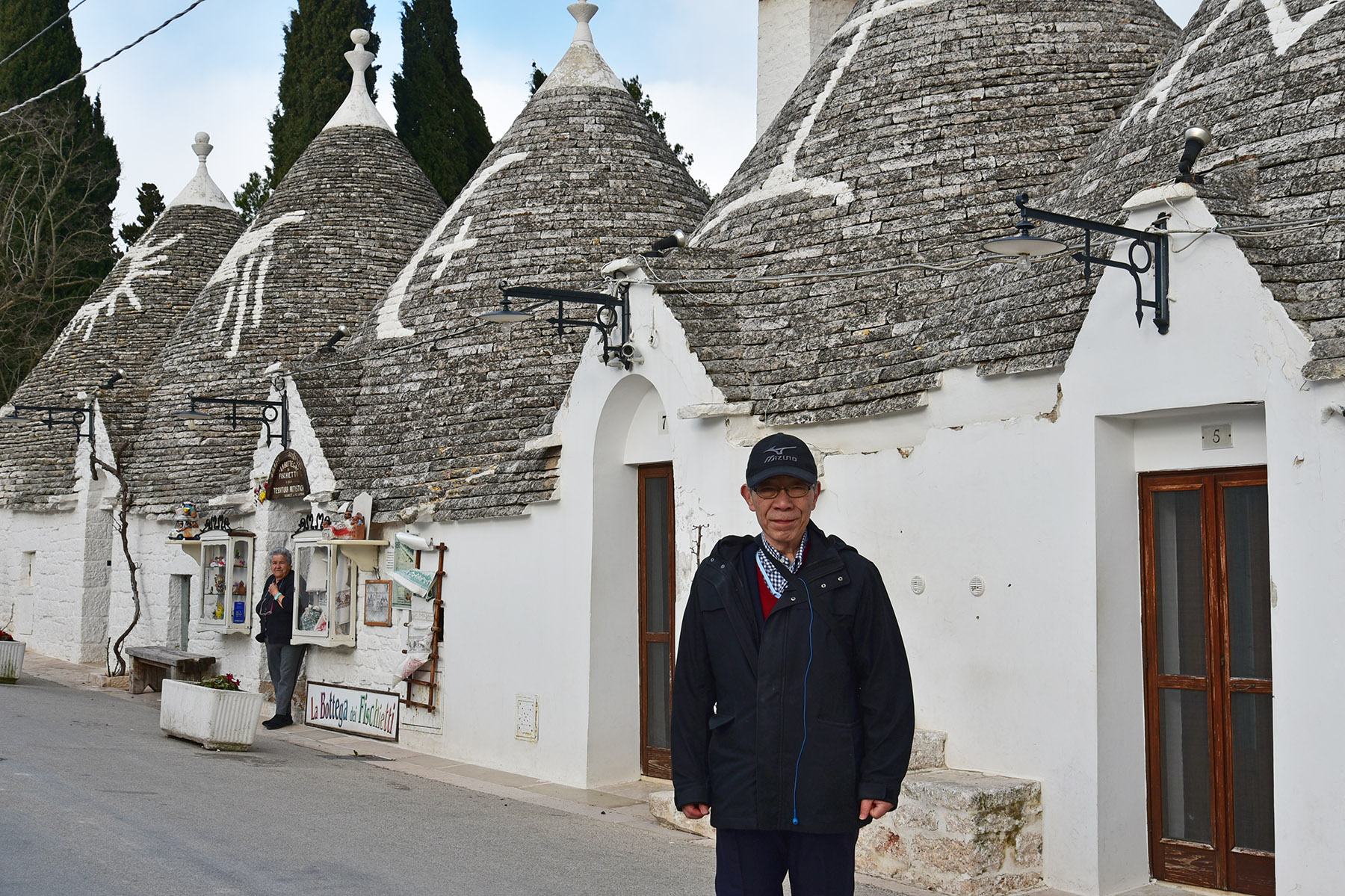 朝のアルベロベッロ 朝早くは予想外の雪に見舞れ、零下の気温であり、非常に寒かった。壁の白と屋根の黒というモノクロの世界であった。