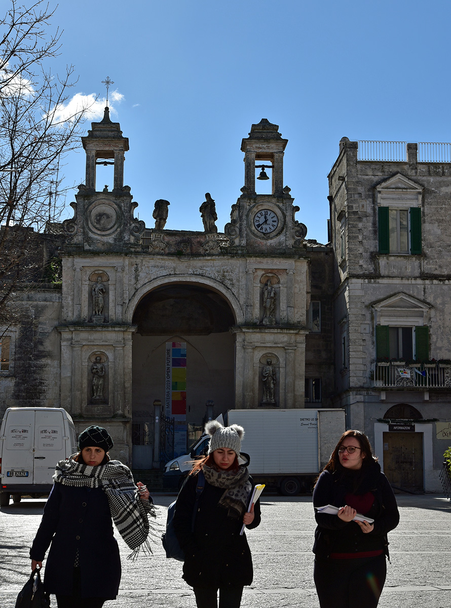 セディーレ広場で 街のシンボルの大聖堂 広場を歩く女子学生