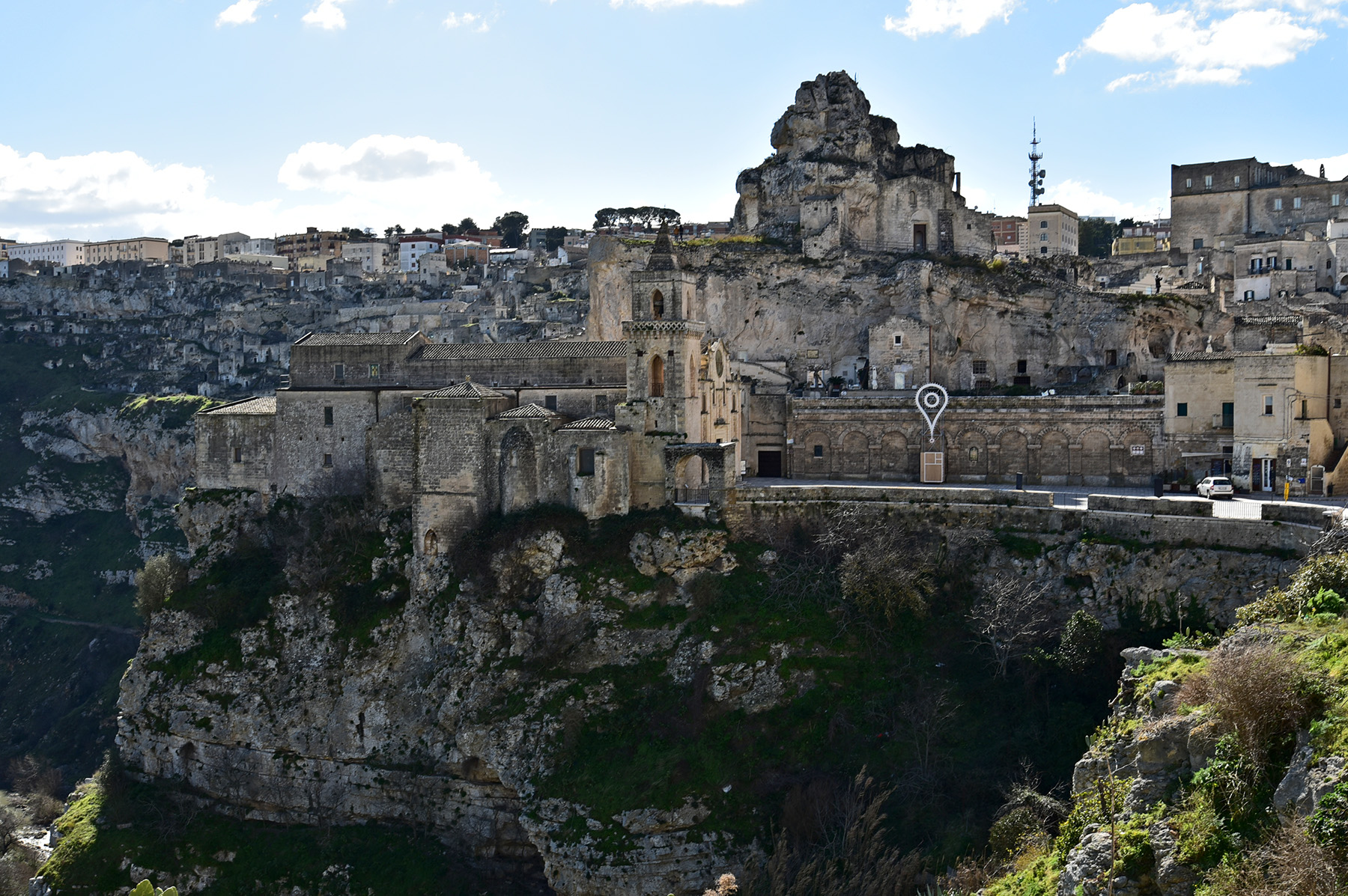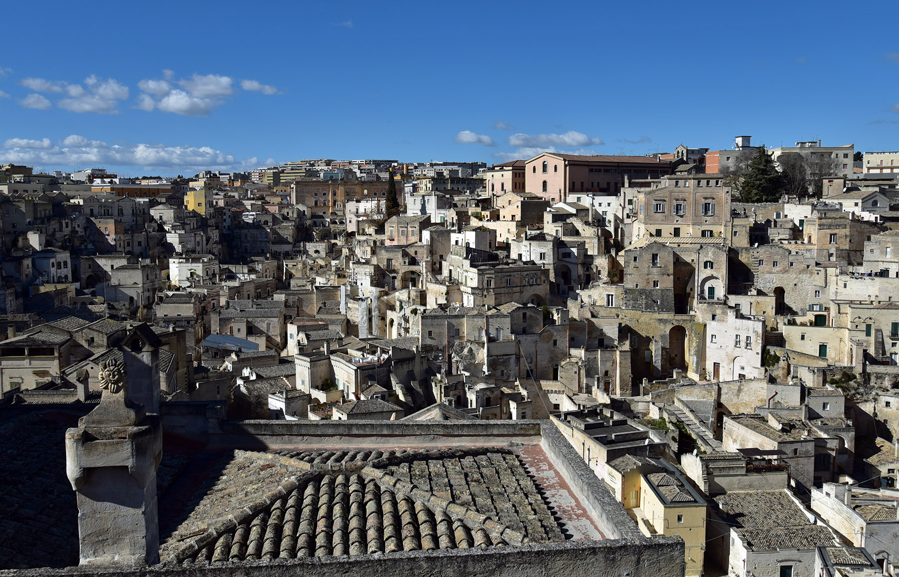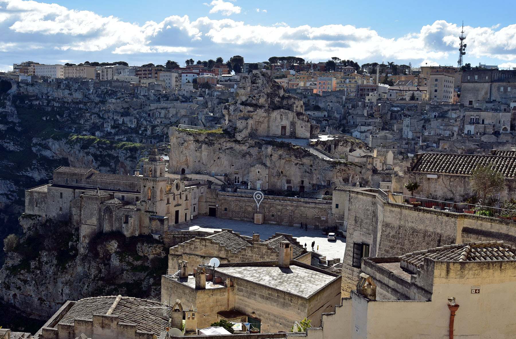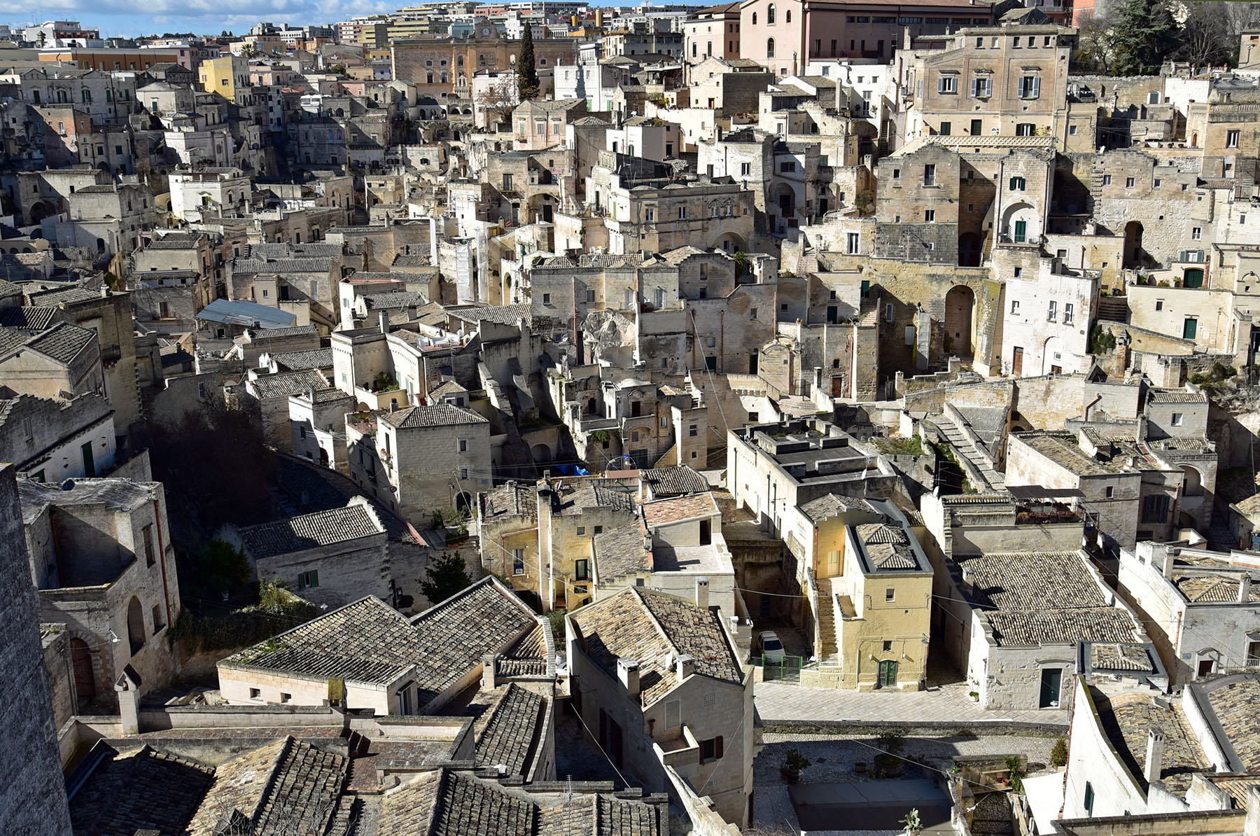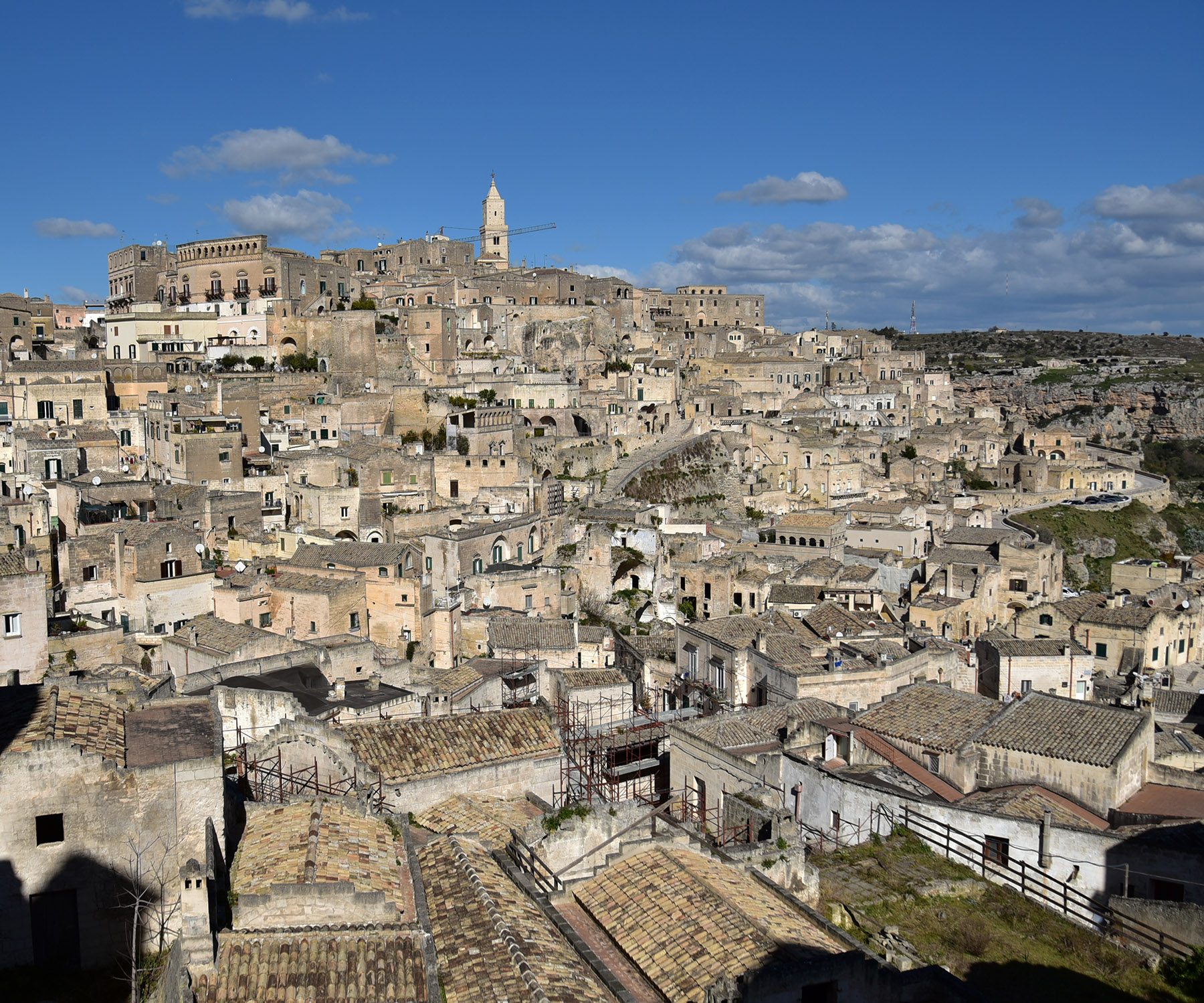 マテーラはバジリカ州第2の都市、旧市街には石灰岩の岩を掘った岩窟住居サッシが多数ある。美しいフレスコ画の岩窟教会、サッシを利用したレストランなどがある。旧市街全体が1993年世界文化遺産登録された。