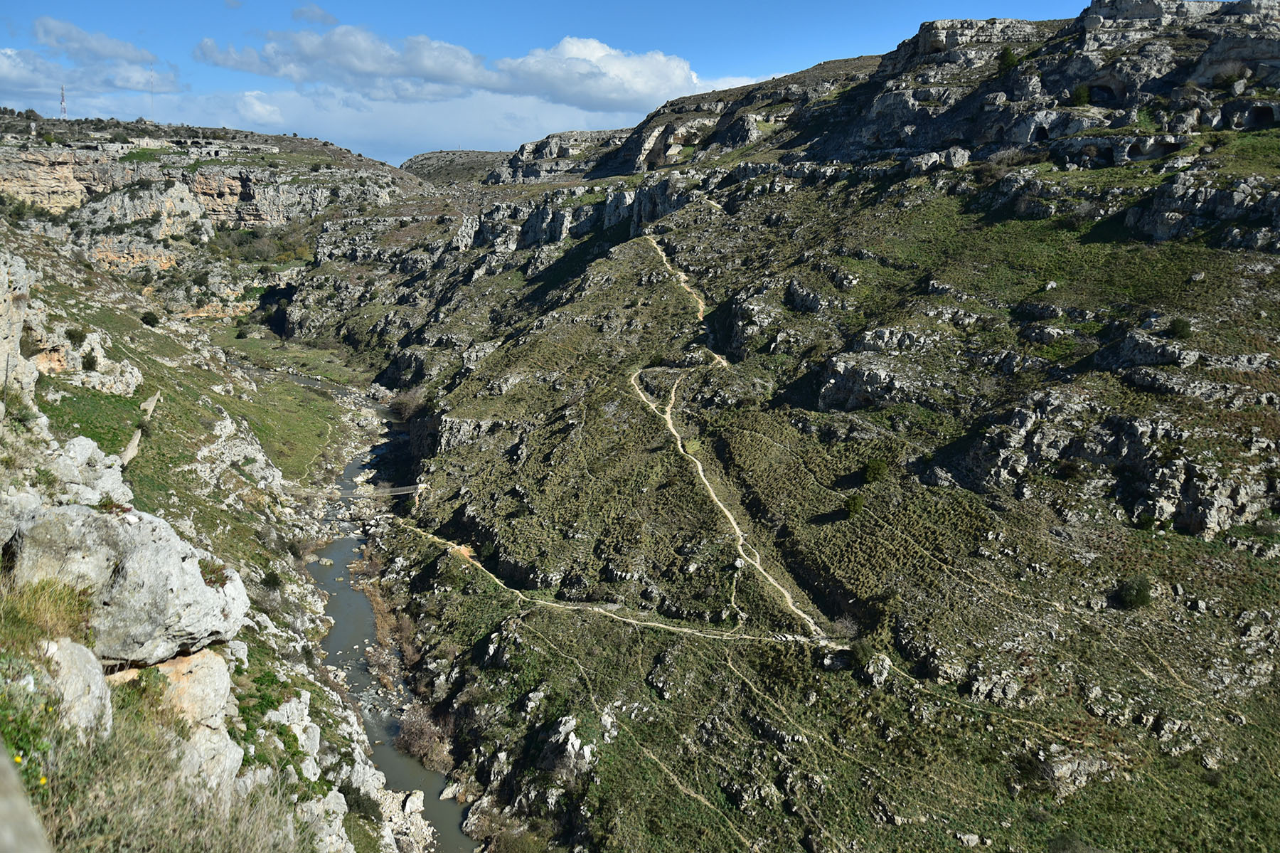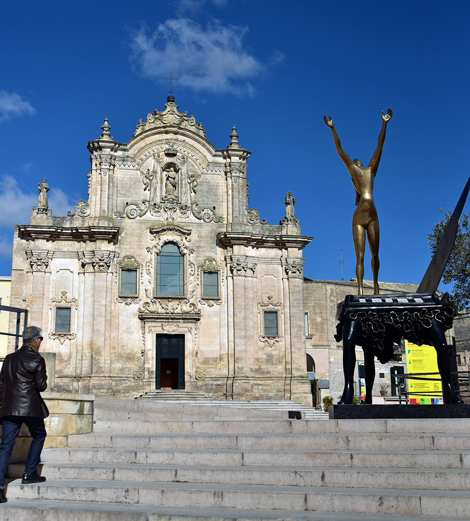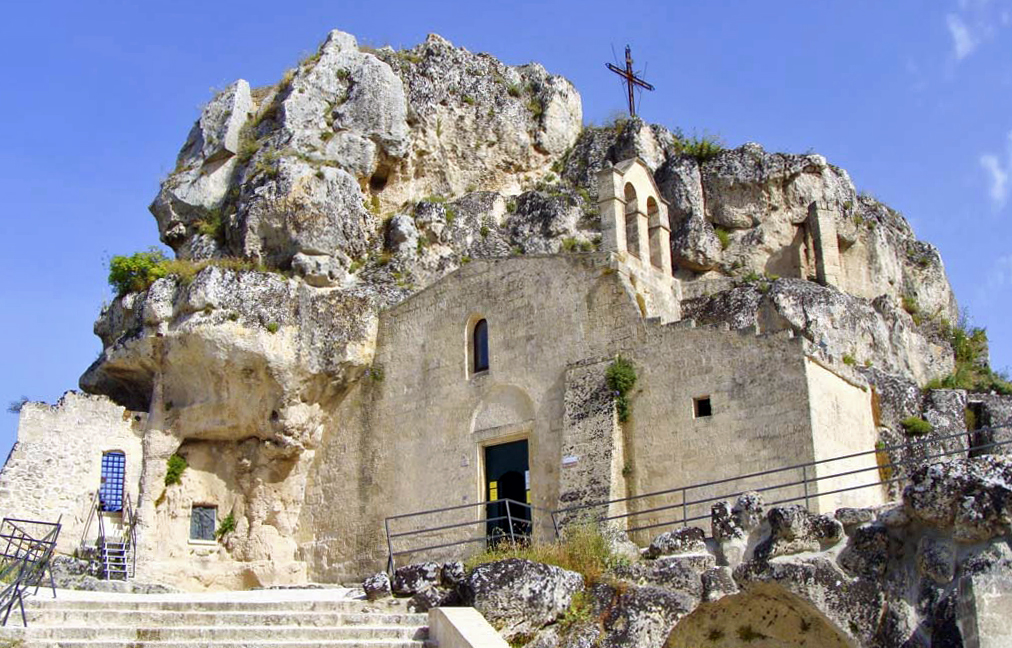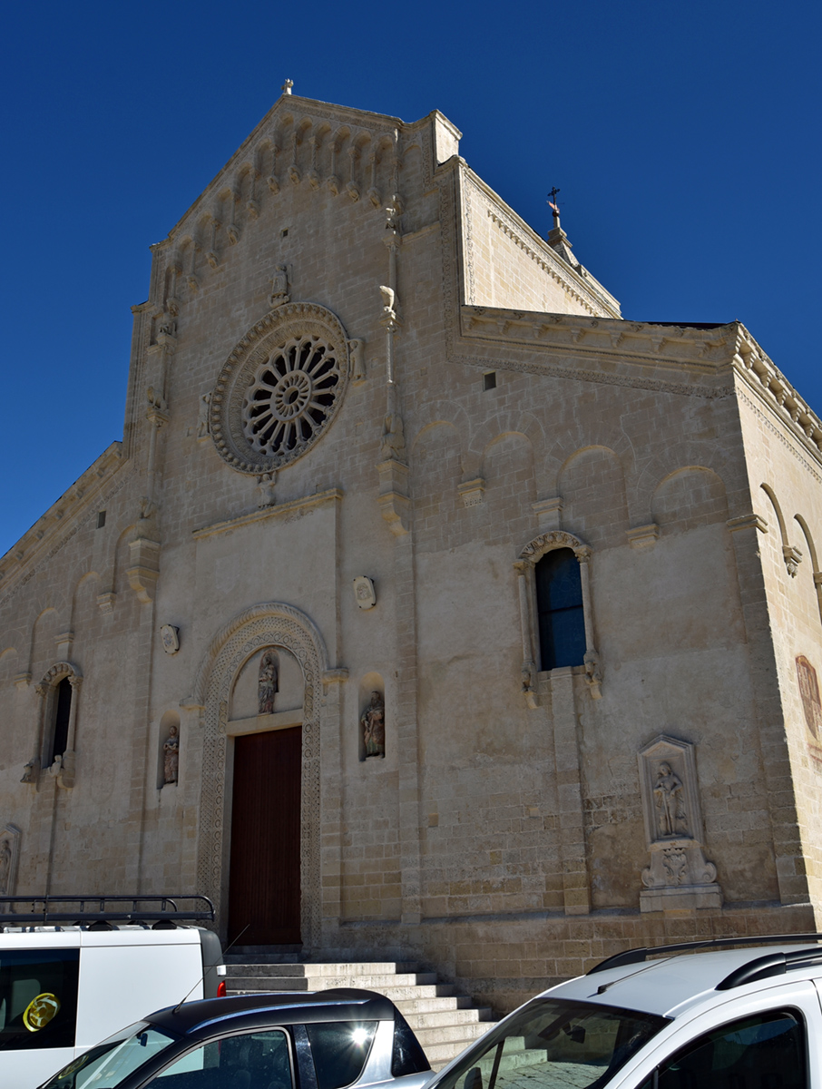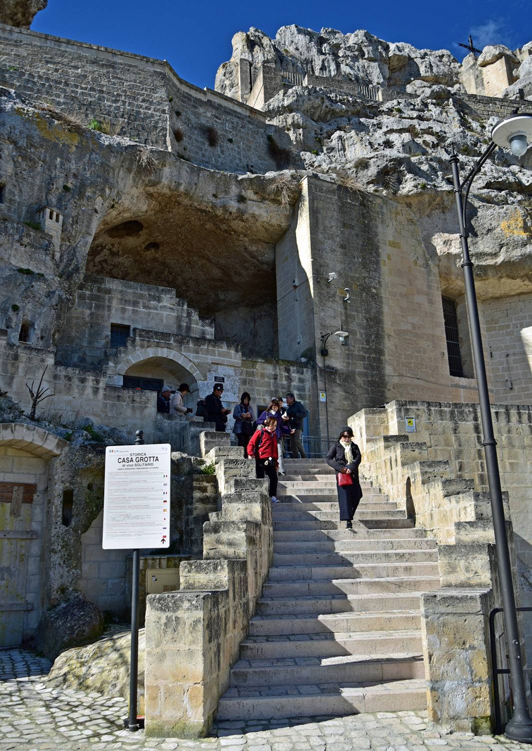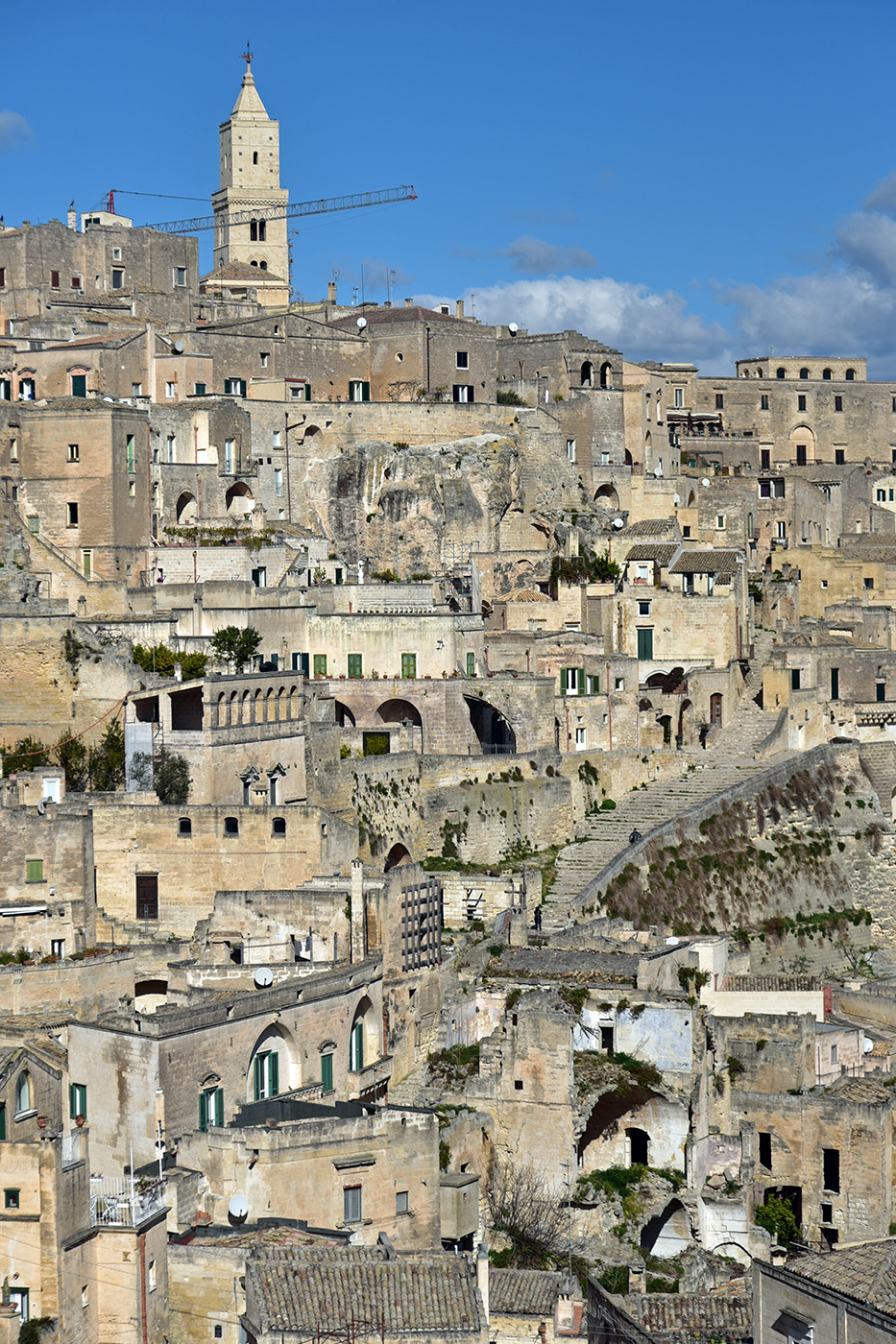 マテーラはバジリカ州第2の都市、旧市街には石灰岩の岩を掘った岩窟住居サッシが多数ある。美しいフレスコ画の岩窟教会、サッシを利用したレストランなどがある。旧市街全体が1993年世界文化遺産登録された。