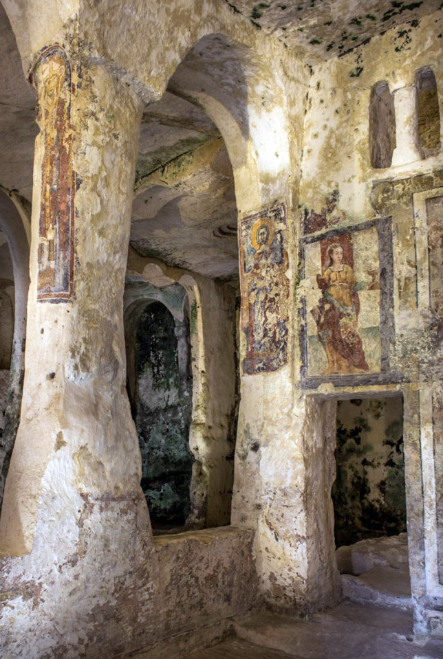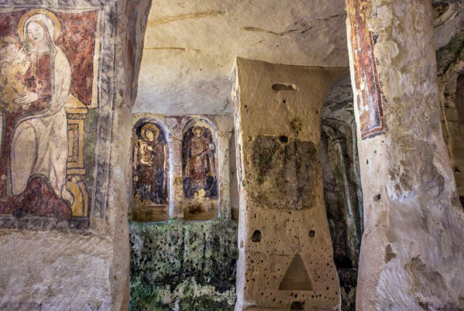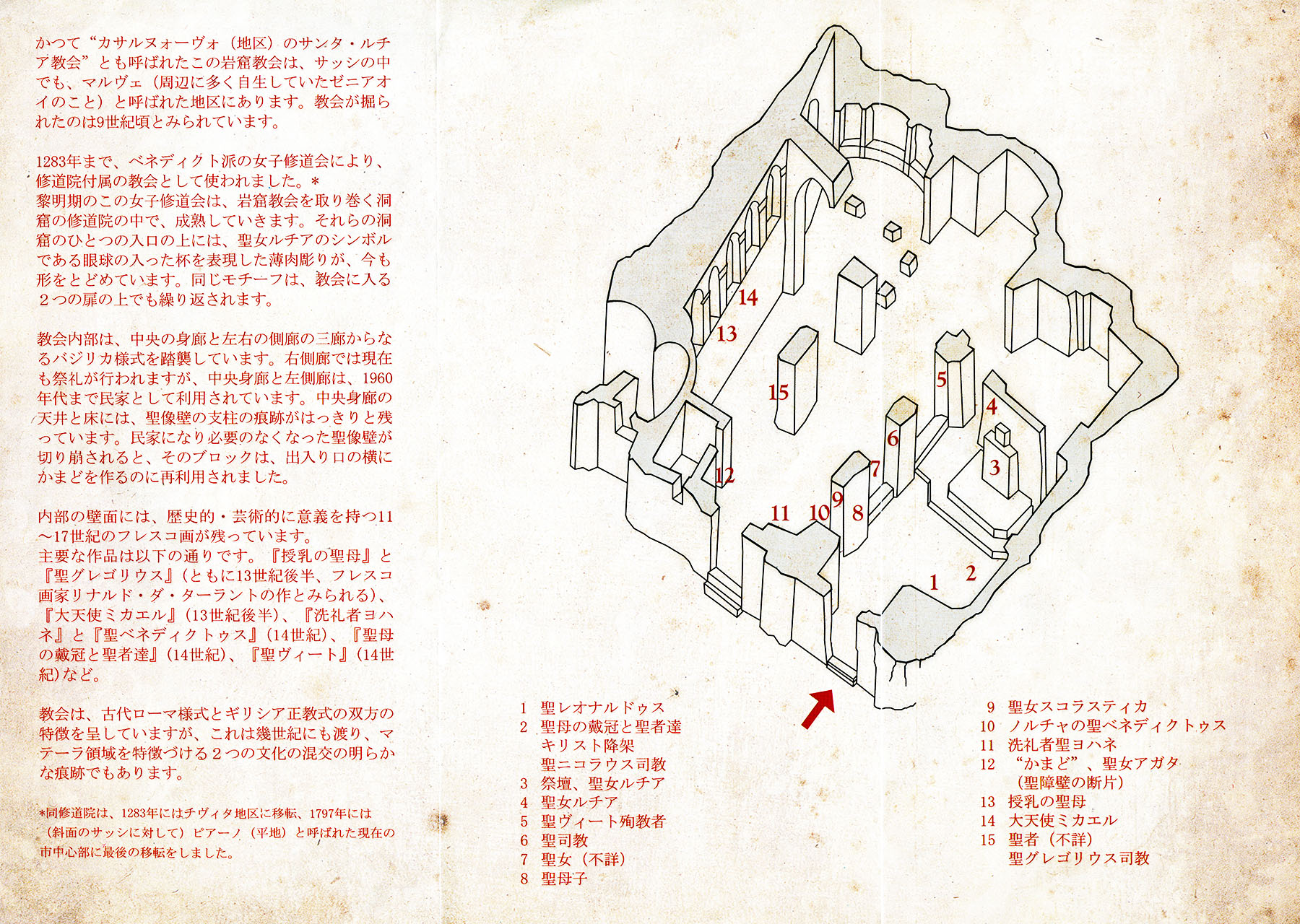 サンタ・ルチア・アッレ・ヌルヴェ教会は9世紀に建設された聖ルチアを祭る女子修道会の岩窟教会であり、授乳する聖母、聖ルチアを描いたフレスコ画が綺麗に残されいる。13世紀に住居に転用され、内部で炊飯などを行ったため、煤などが壁に付き、痛んだ絵もあるが、当時を今に残す素晴らしい遺産である。内部は写真撮影禁止されているが、ガイドブックやホームページから引用して掲載している。
