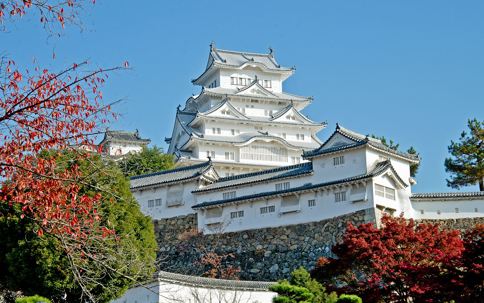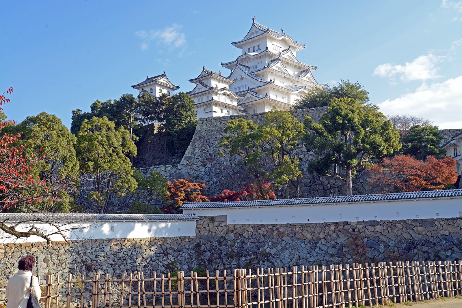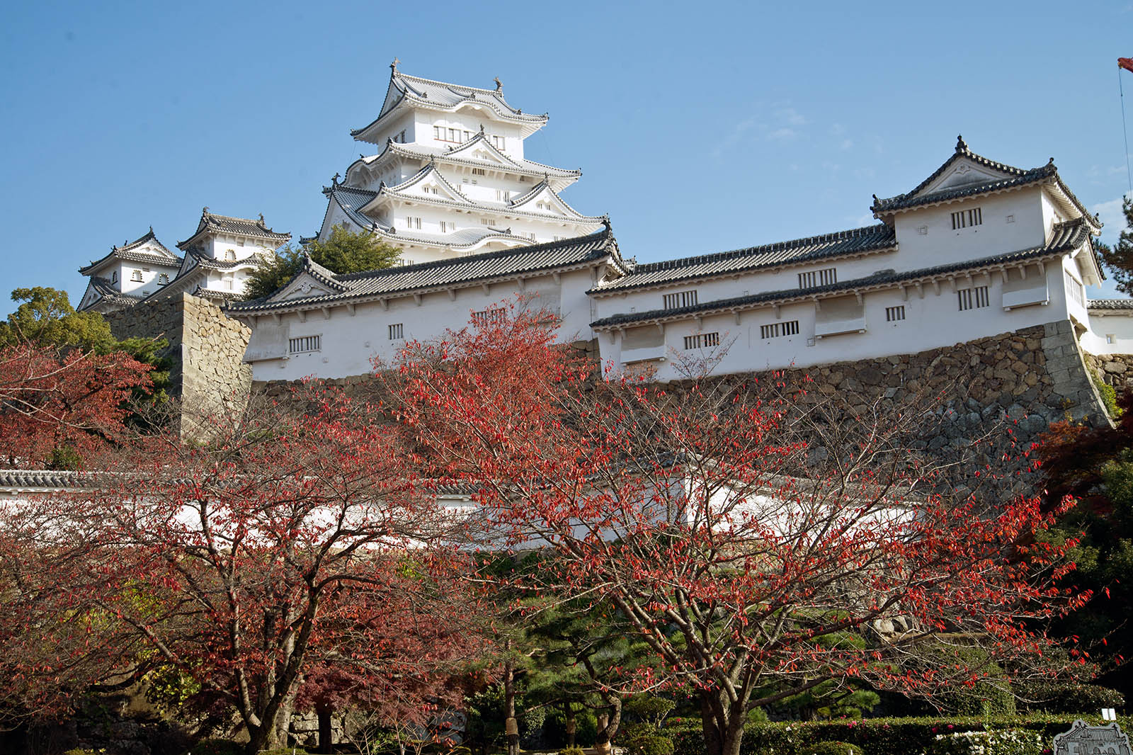 修復されて、まばゆい白さになった天守閣 紅葉の紅とのコントラスト