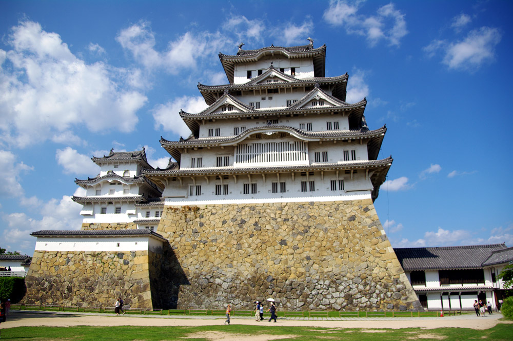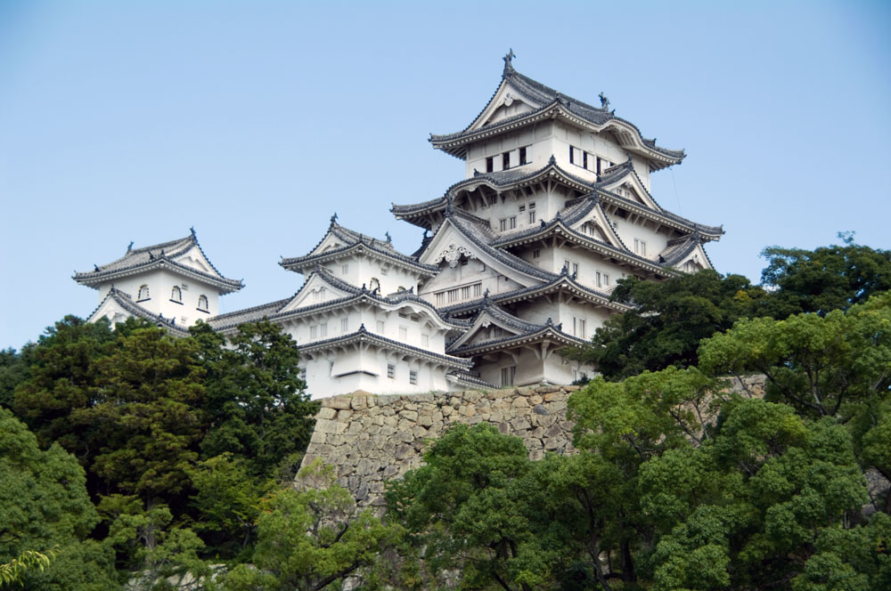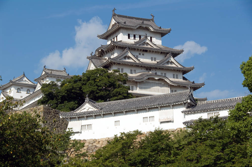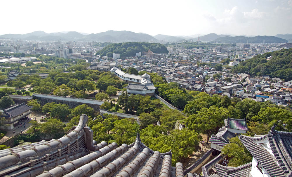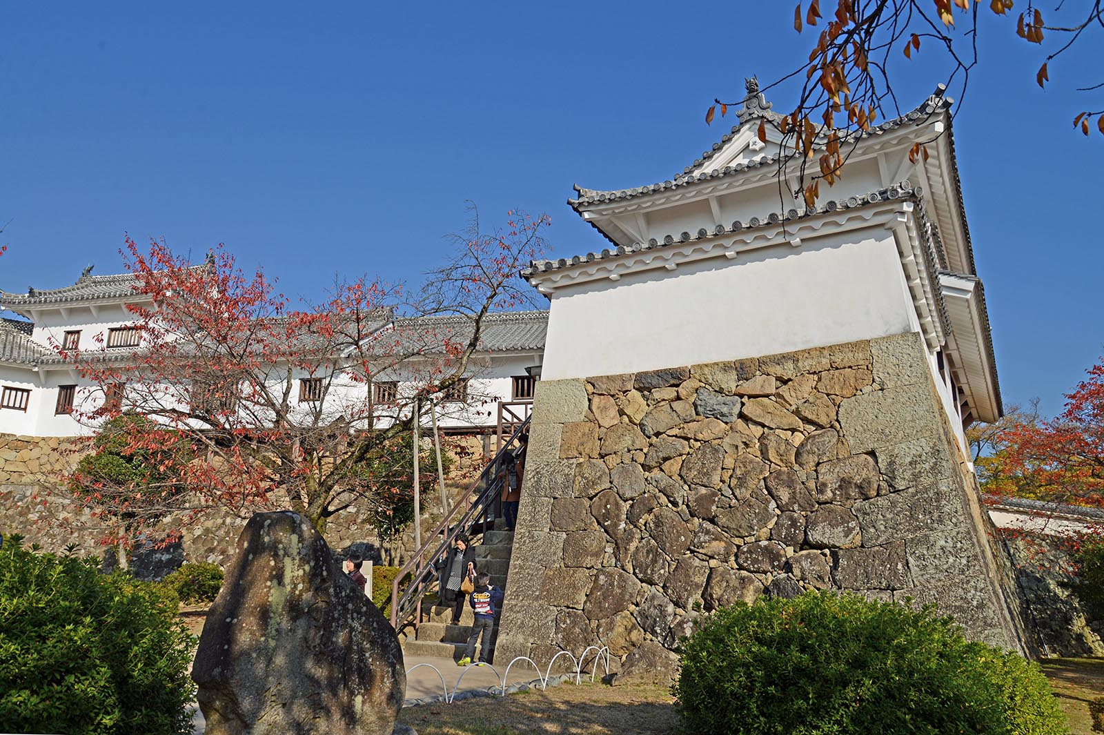 修復されて、まばゆい白さになった天守閣 紅葉の紅とのコントラスト