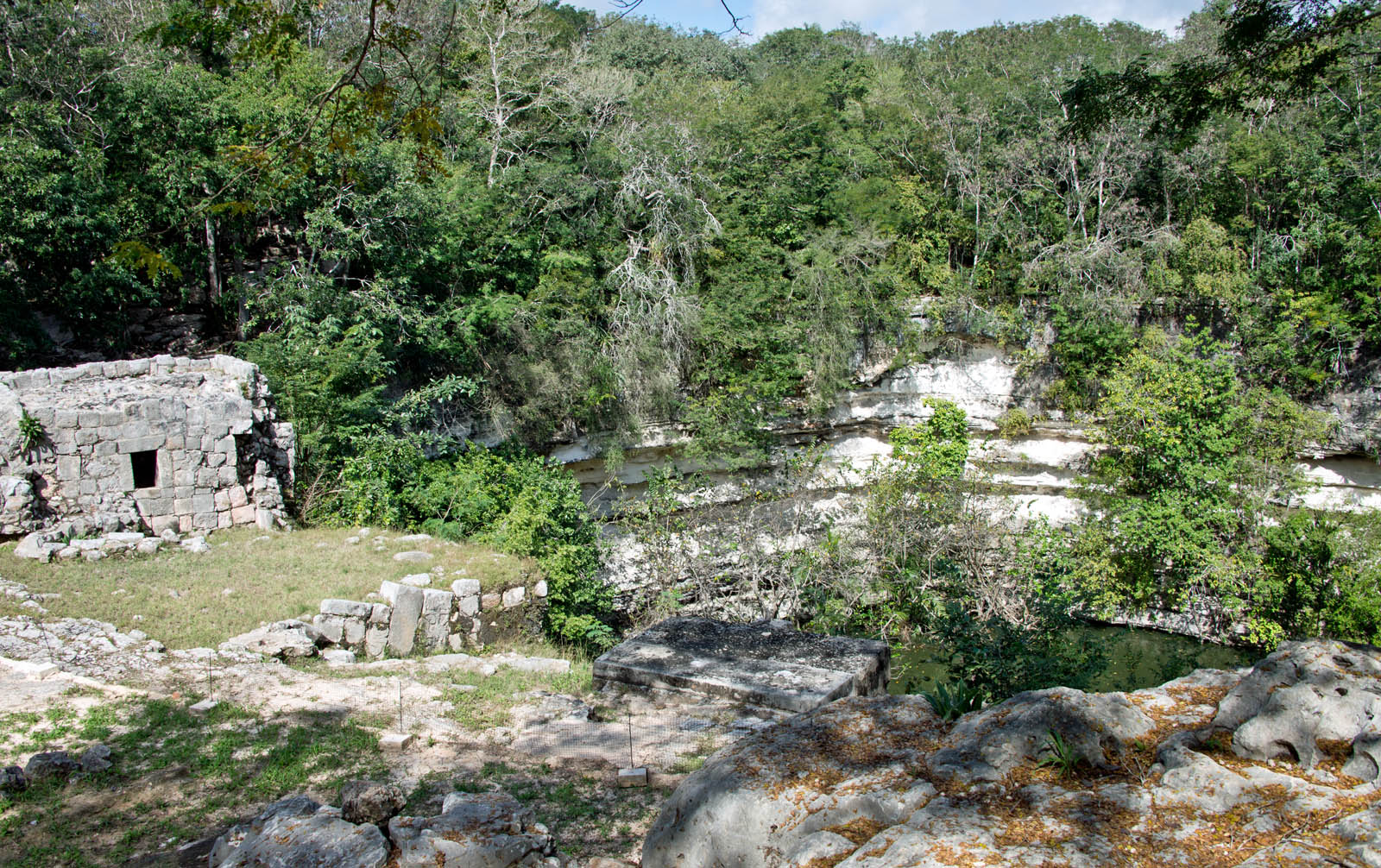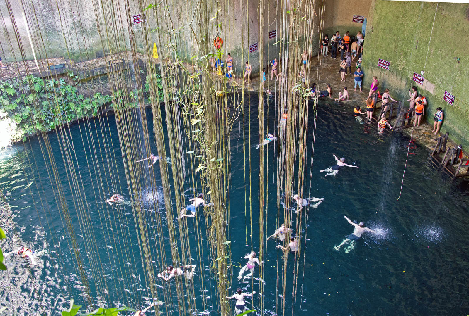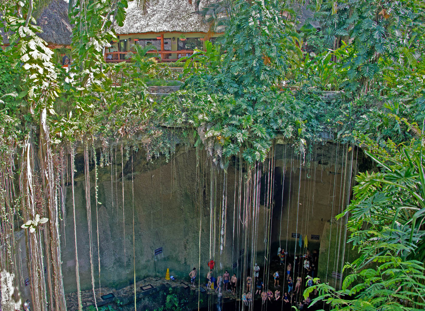 セノーテ --> [Slide] [top] レストランの下にあるセノーテ 蔦が多数たれ下がっている。