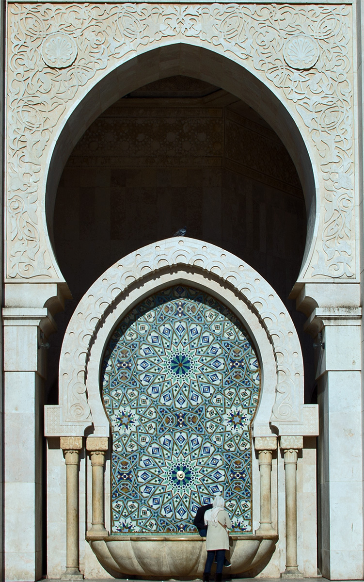 水汲み場の両側にあるゼリージュによる壁面装飾は、ひし形の網目模様になっており、こちらもエメラルドグリーン一色に見えますが、中央に異なる色を配色することで奥行きを与えています.