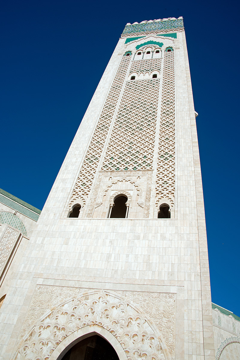モロッコの先代国王ハッサン2世が、北アフリカを象徴するモスクを建設するため、全土から数多くの職人を集めて、1986年から8年をかけて、海岸に作り上げたモロッコ最大級のモスクです。全長200メートルの高さを誇るミナレット(尖塔)や、小さいタイルを用いた壁面の装飾は美しいものです。2015年には映画「ミッション:インポッシブル/ローグ・ネイション」のロケ地として注目されました。