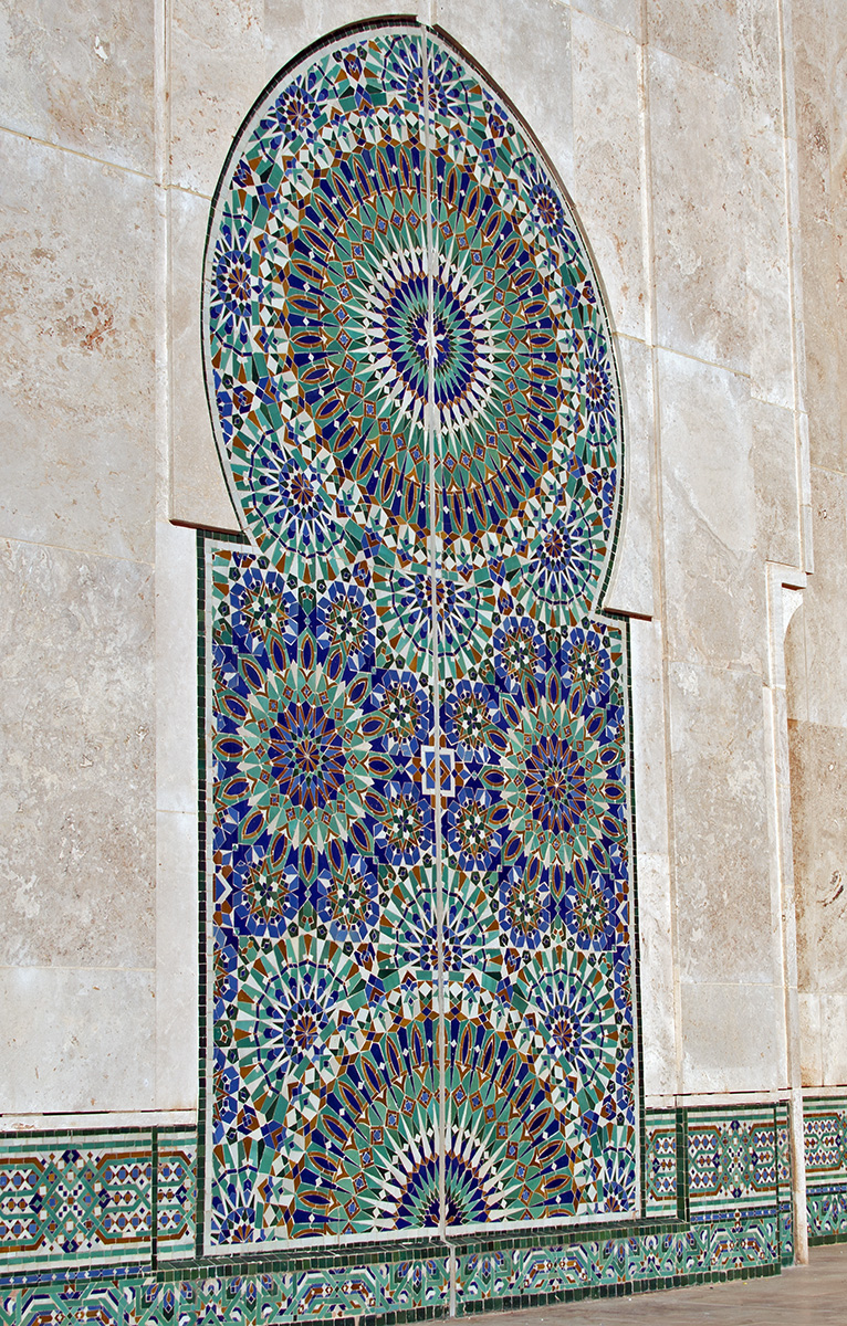 モスクを飾る伝統的な技法「ゼリージュ」は小さくカットされた施釉(せゆ)タイルを組み合わせて幾何学模様のモザイクにしたものです。エメラルドグリーンがベースになっており、赤や青や黄色など様々な色が散りばめられています。