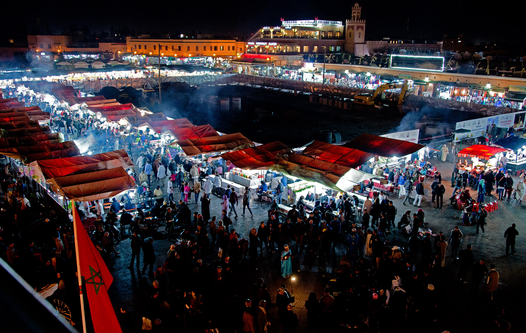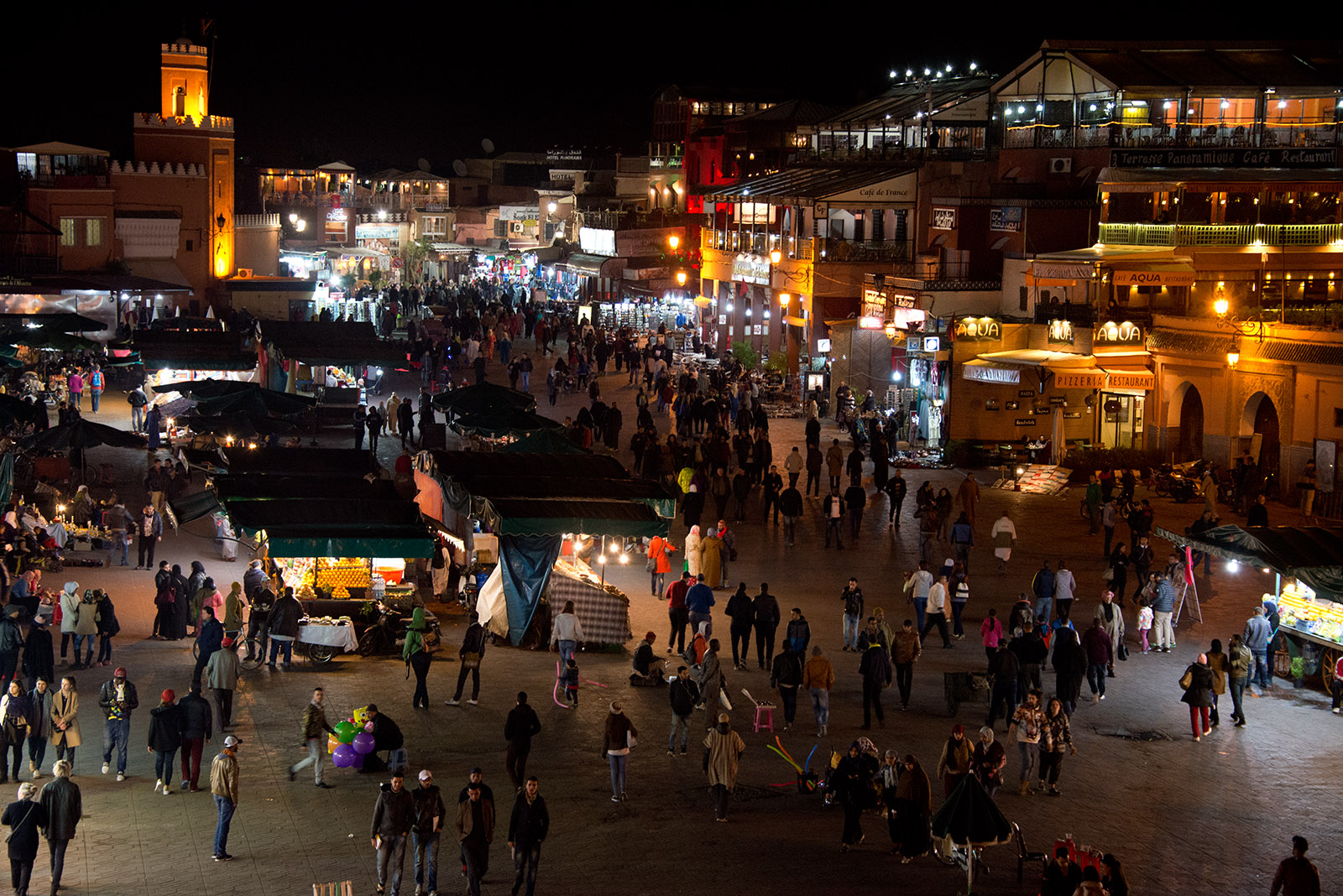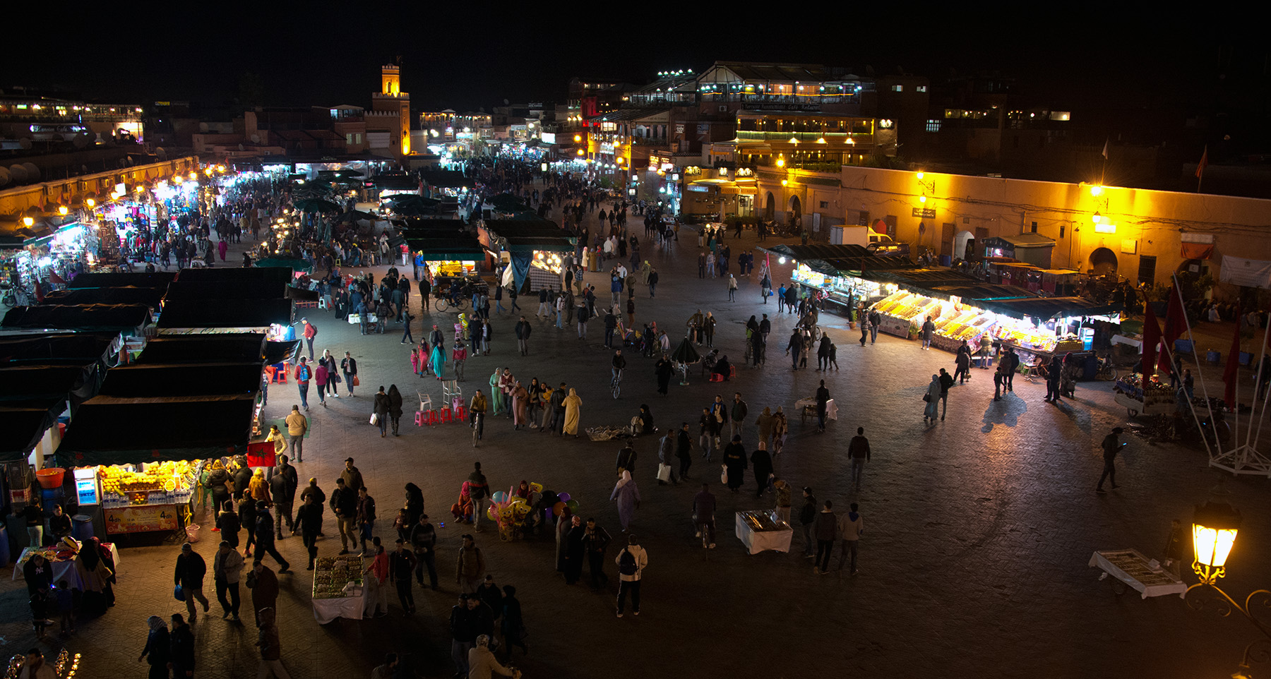 11世紀後半、モロッコ中央部に位置するマラケシュがイスラム王朝の都であった頃から、街の中心にあるジャマ・エル・フナ広場が活気に満ちていた。城壁に囲まれた旧市街地の中心にあり、約400m四方の世界最大の広場とも言われる。夜には大道芸人が技を競う姿や、猿や蛇を扱う者などの様々な芸を楽しむことができる。また、レストランやオレンジジュース屋台などで食も堪能できる。まさに毎日がお祭り騒ぎの広場。ちなみに、ジャマ・エル・フナ (Djemaa el Fna) とは、アラビア語で死人の集会場の意味だそうです。