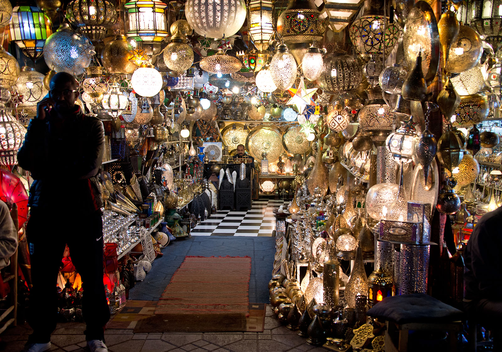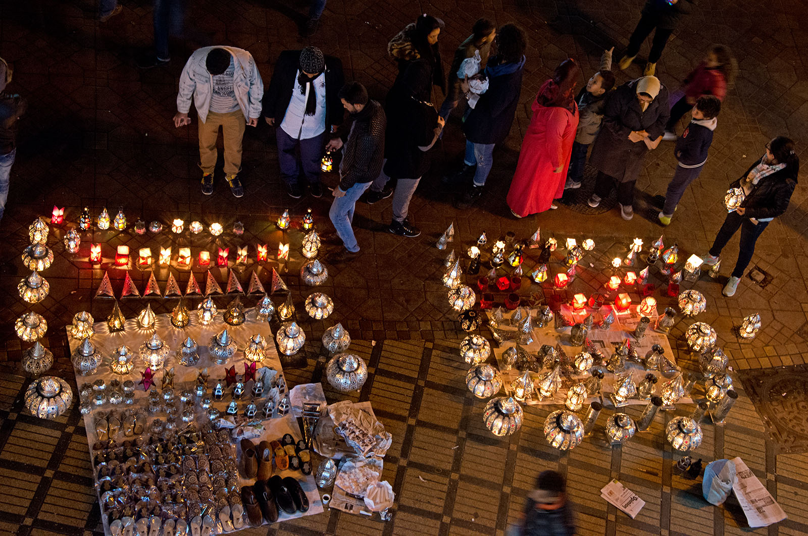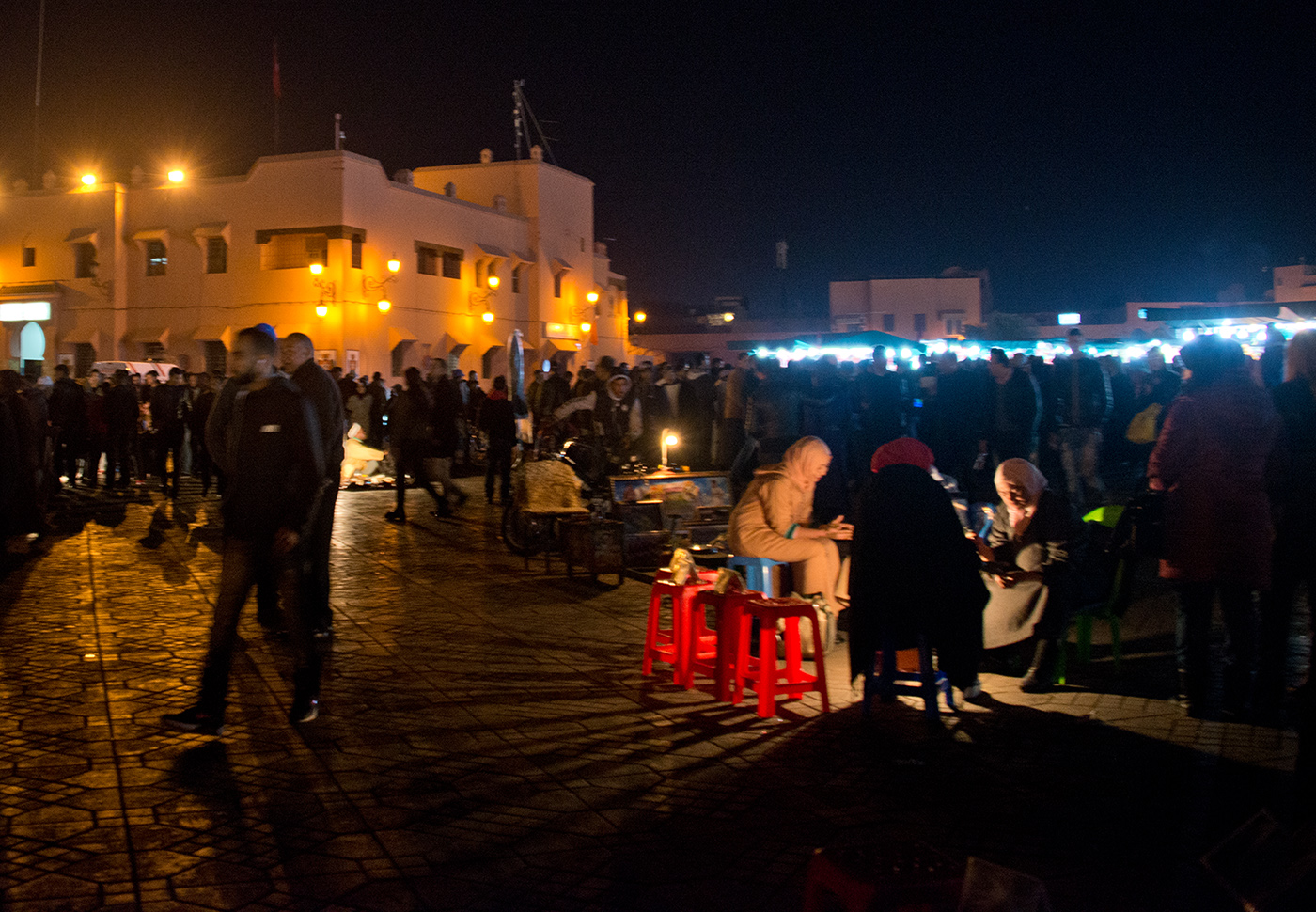 11世紀後半、モロッコ中央部に位置するマラケシュがイスラム王朝の都であった頃から、街の中心にあるジャマ・エル・フナ広場が活気に満ちていた。城壁に囲まれた旧市街地の中心にあり、約400m四方の世界最大の広場とも言われる。夜には大道芸人が技を競う姿や、猿や蛇を扱う者などの様々な芸を楽しむことができる。また、レストランやオレンジジュース屋台などで食も堪能できる。まさに毎日がお祭り騒ぎの広場。ちなみに、ジャマ・エル・フナ (Djemaa el Fna) とは、アラビア語で死人の集会場の意味だそうです。