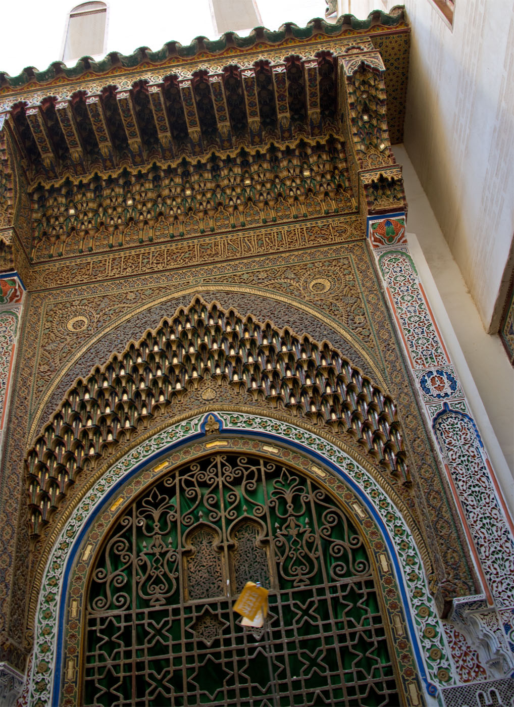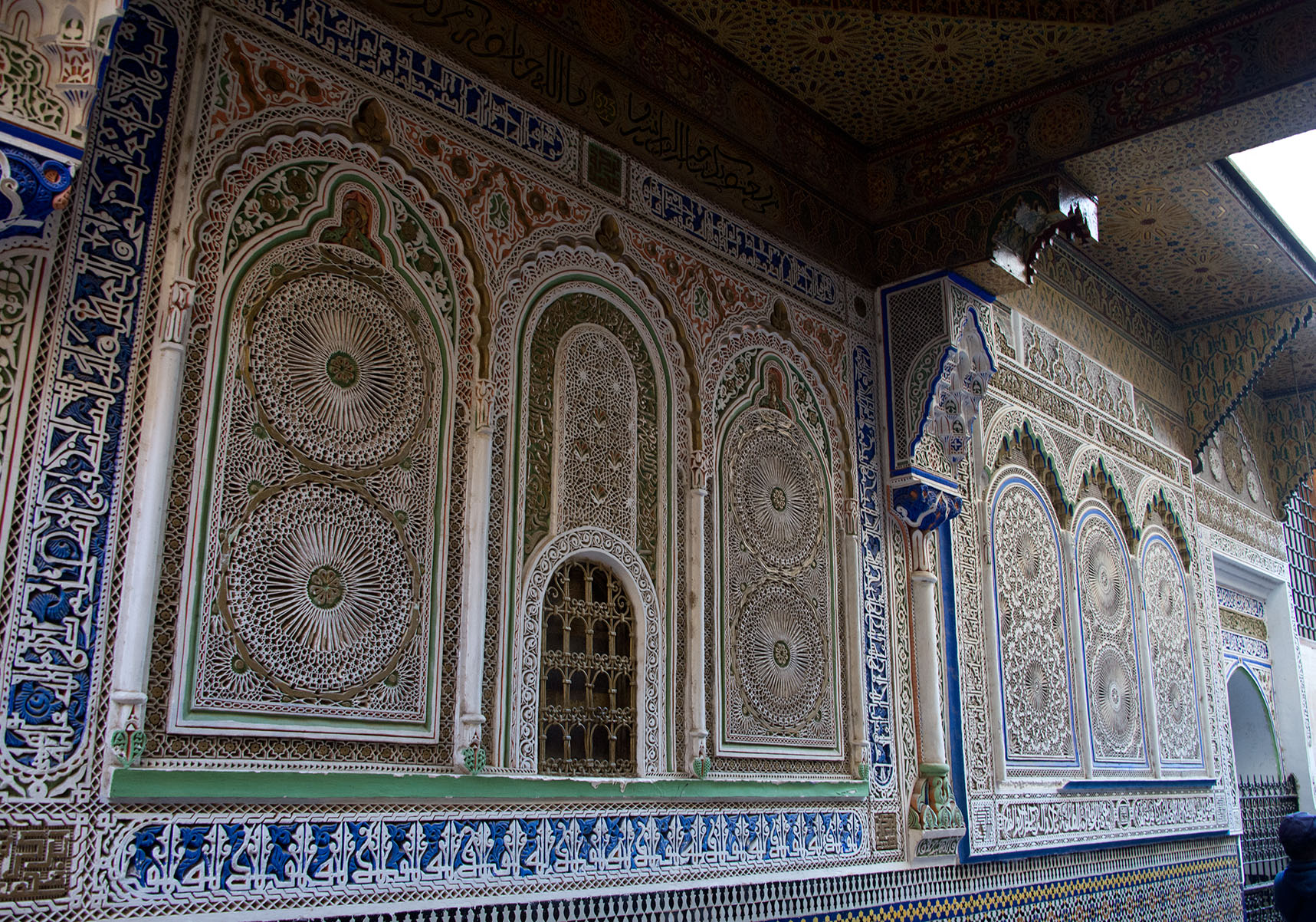 幾何学模様の彫刻と青や緑色のタイルで彩られている