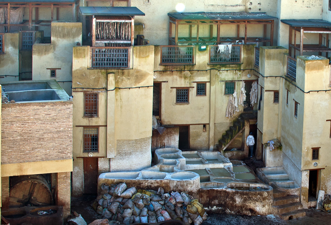 ブー・ジュルード門を通ってフェズ旧市街に足を踏み入れる。モロッコ中北部のなだらかな起伏の丘に、9世紀初頭に開かれたイスラム王朝の古い都フェス。フェス・エル・バリと呼ばれる旧市街(メディナ)には建物がひしめき、人がすれ違うのがやっとの狭い路地が無秩序に延びています。常に外敵の侵略にさらされてきた地中海沿岸地域では、周囲に堅固な城壁を巡らせ、内部を複雑な構造にした都市が発達しました。中でもフェス旧市街は巨大迷路で、「世界一の迷宮都市」と形容されるほどです。