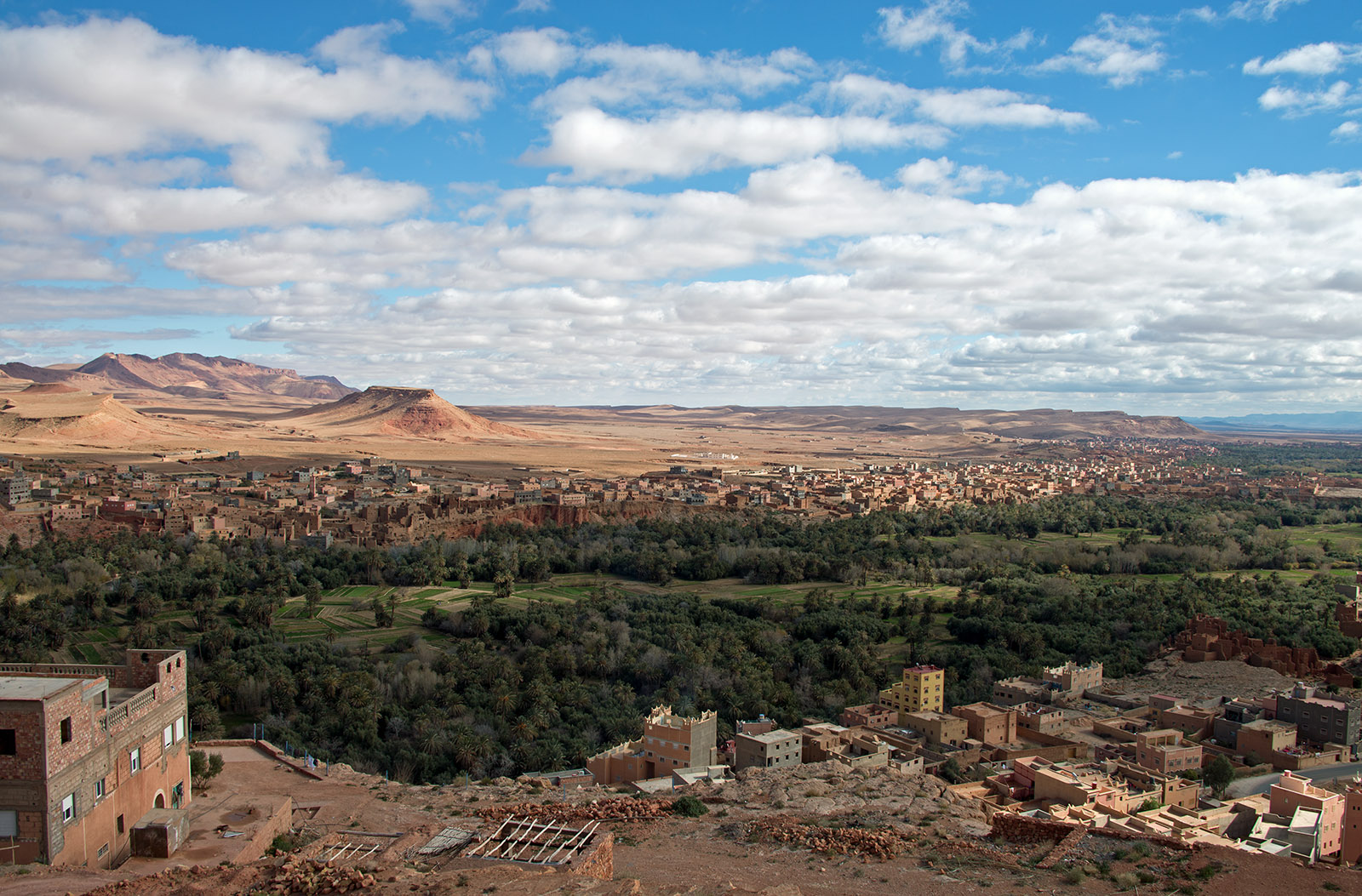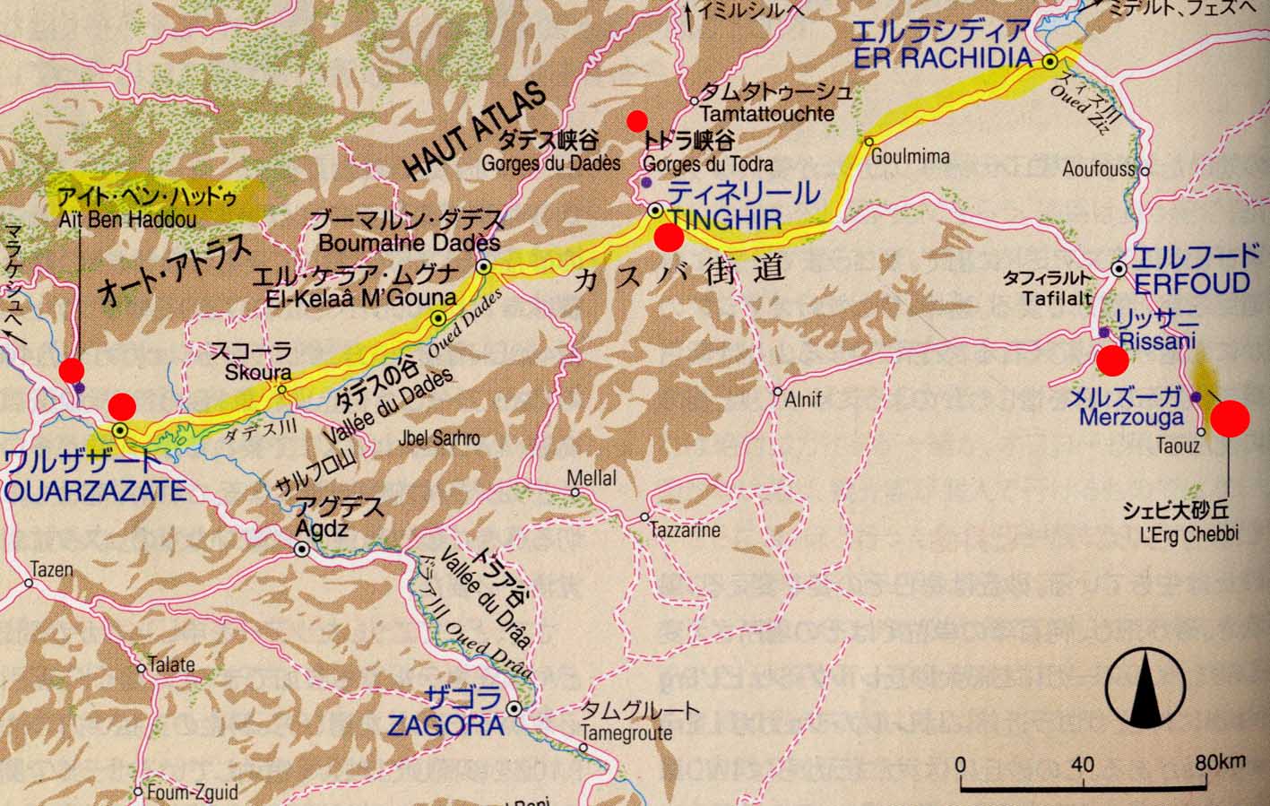 カスバ街道は、アトラス山脈南部の砂漠地帯には、ワルザザードからティネリール(トドラ峡谷)を経て、エルラシディアを結ぶ道。かつて隊商交易が陸上交通の要所として通っていました。カスバとは外敵から守る城壁に囲まれた要塞のこと。街道沿いにはカスバやオアシス、峡谷が点在する。サハラ砂漠の入り口を東西に結ぶカスバ街道沿いには、映画のロケ地、世界遺産、断崖絶壁の景勝地など見どころが集中しています。そして、カスバ街道の終点地から西は、サハラ砂漠が広がっています。