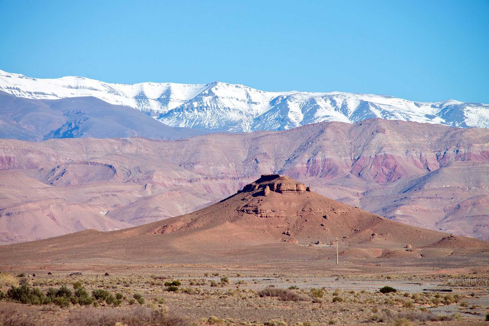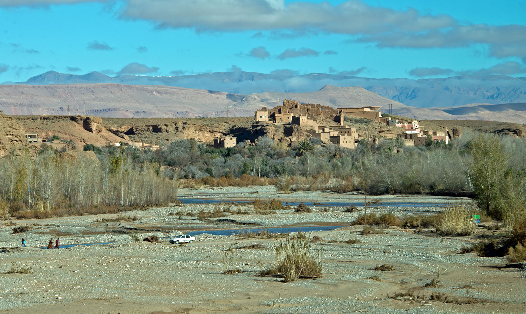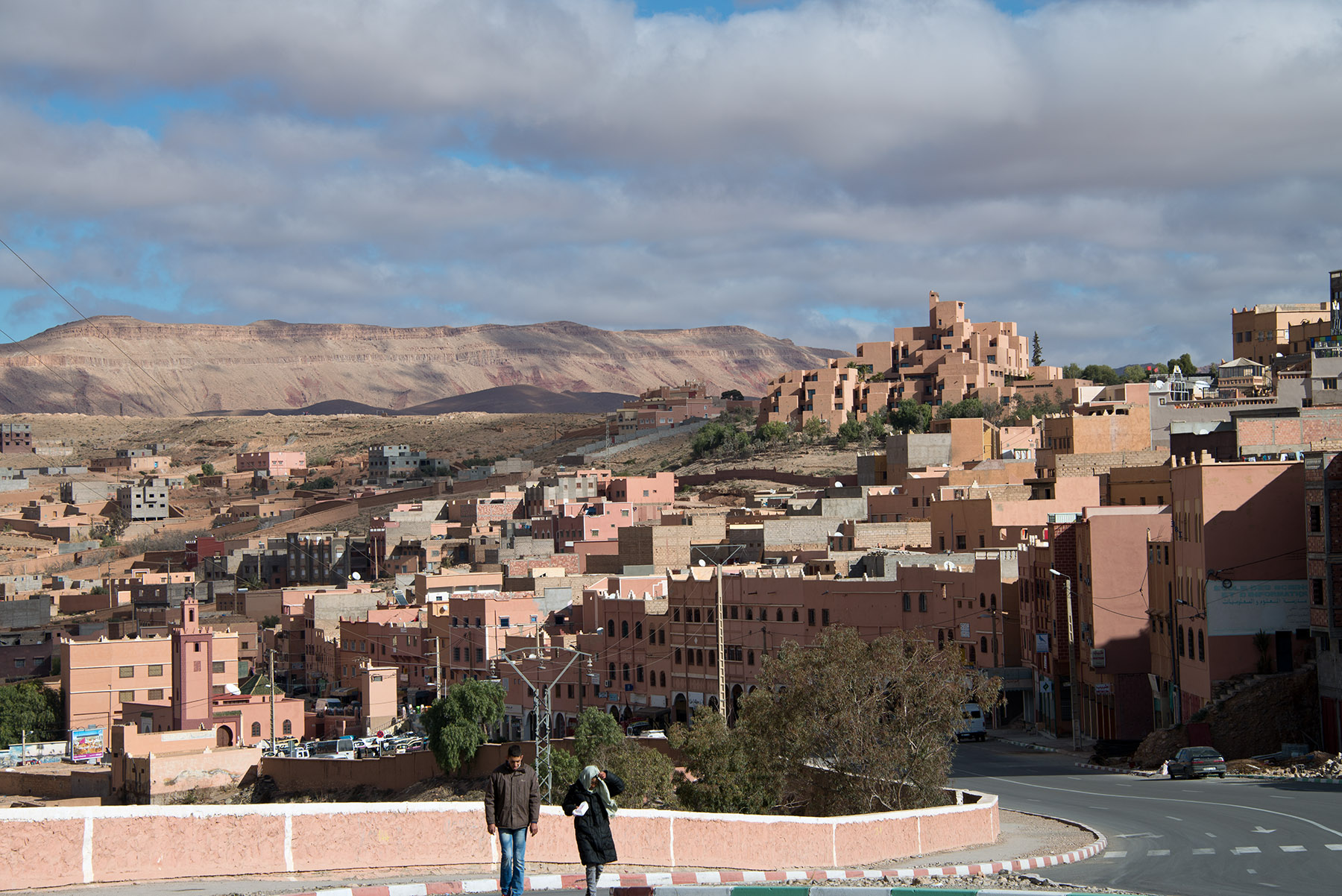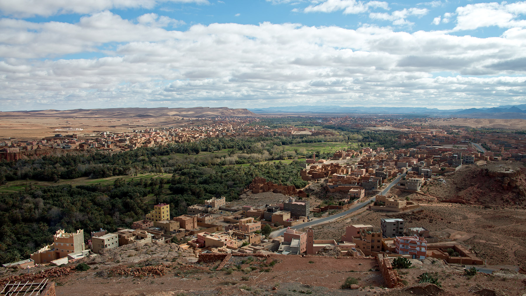 アトラス山脈を見ながらカスバ街道を進む。カスバ街道は、アトラス山脈南部の砂漠地帯の、ワルザザードからダデスの谷を通りティネリールを経てエルラシディアを結ぶ道。