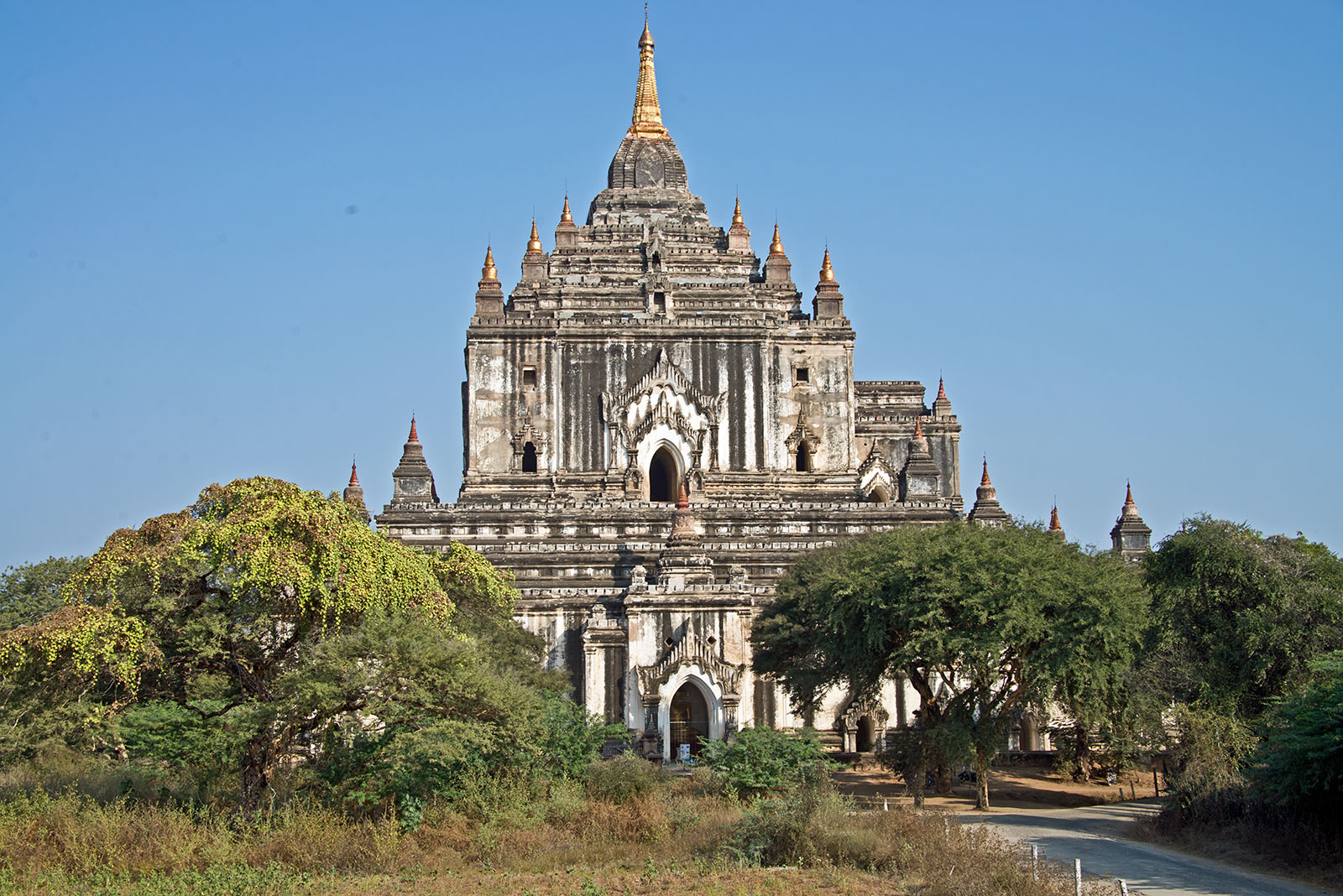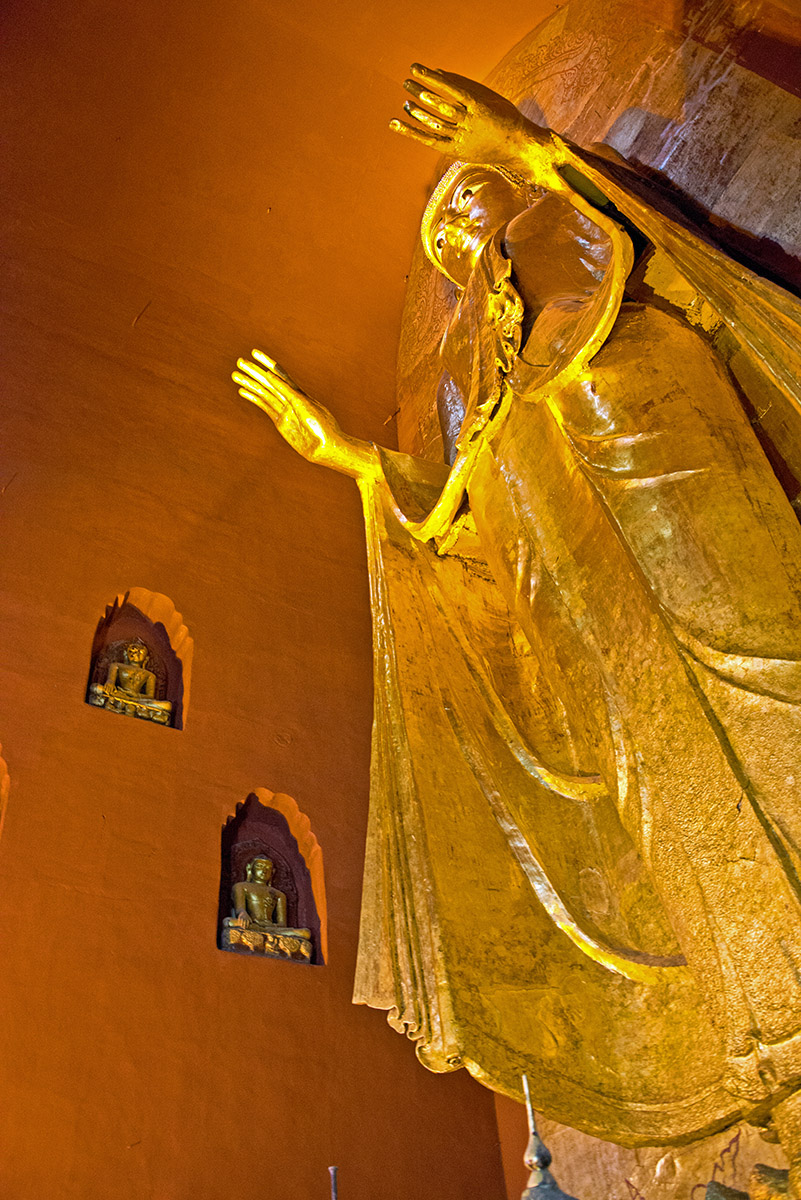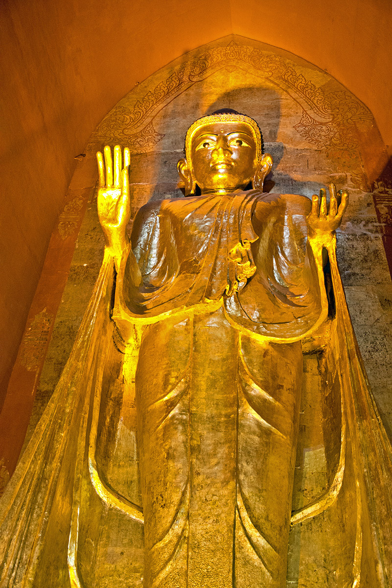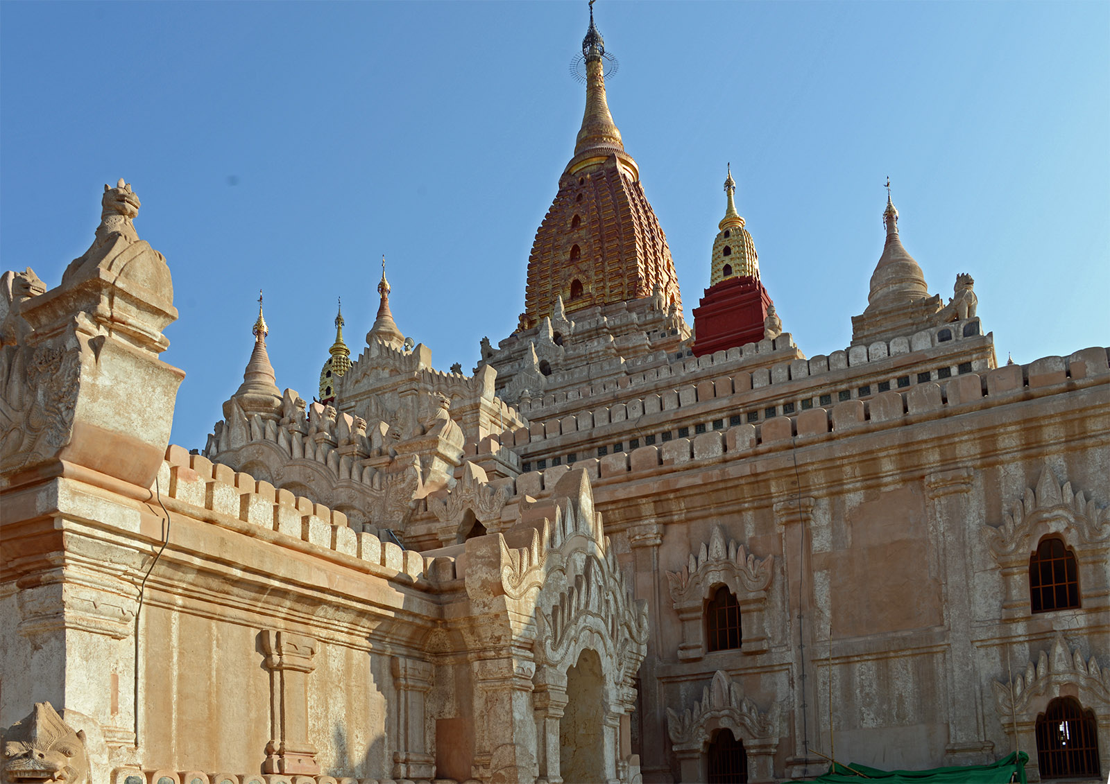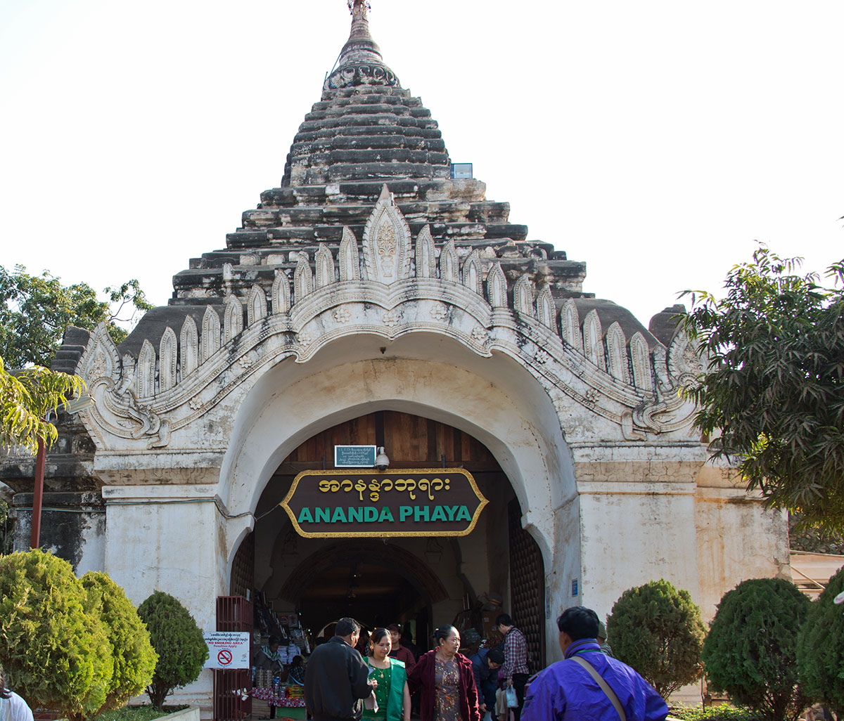 アーナンダ寺院は、バガン遺跡を代表する最大の寺院遺跡である。上座部仏教(小乗仏教)を導入し、ミャンマー族最初の統一国家を築いたバガン朝の第3代の王チャンスィッターによって、11世紀末〜12世紀初頭に建設された。高さ50m、面積63m四方の白亜の寺院の内部には、4つの仏像が東西南北に向いて整然と安置され、釈迦(仏陀)の生涯を描いた80点の浮き彫りがある。アーナンダーは釈迦の一番弟子の名前である。