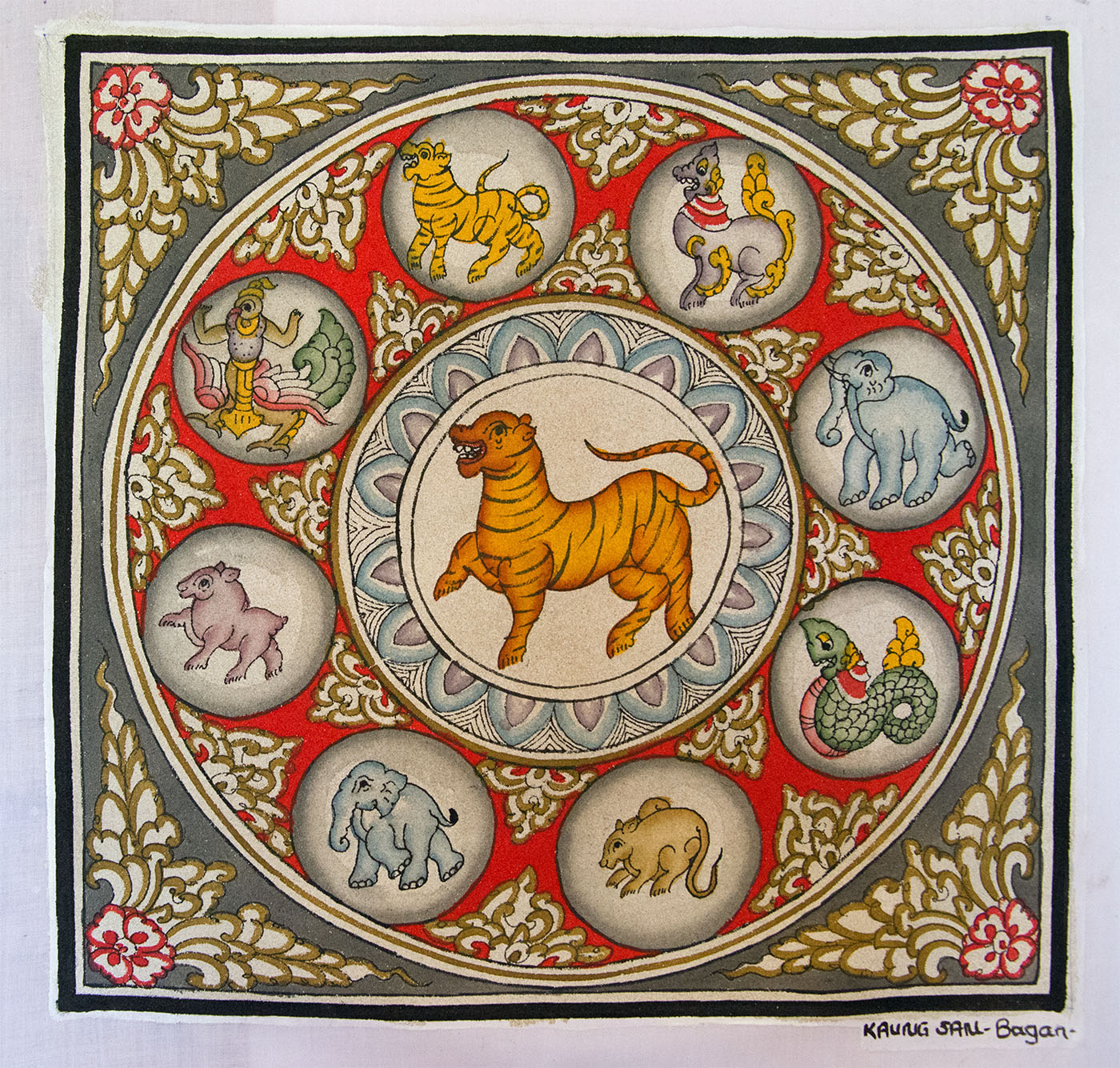 八曜日の動物の砂絵 真ん中は月曜の虎, 右回りに火曜:獅子, 水曜午前:牙のある象, 土曜:ナーガ, 木曜:ネズミ, 水曜午後:牙のない象, 金曜:モグラ, 日曜:ガロン