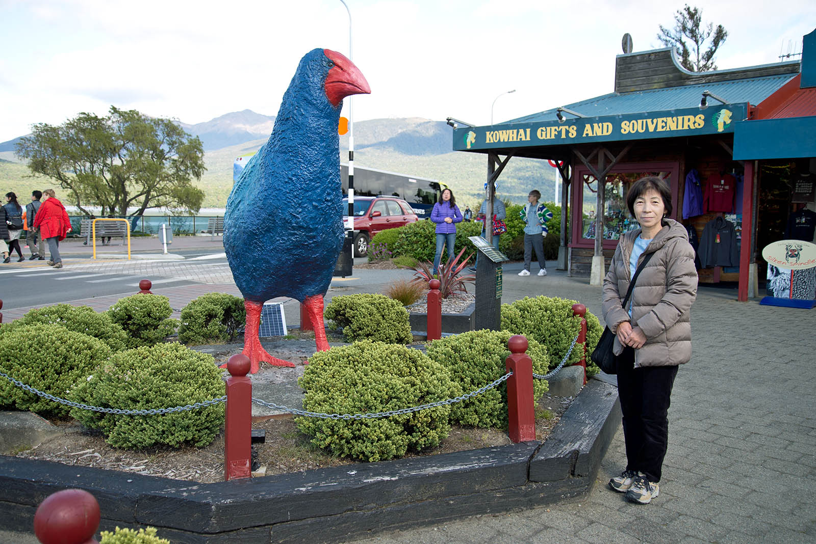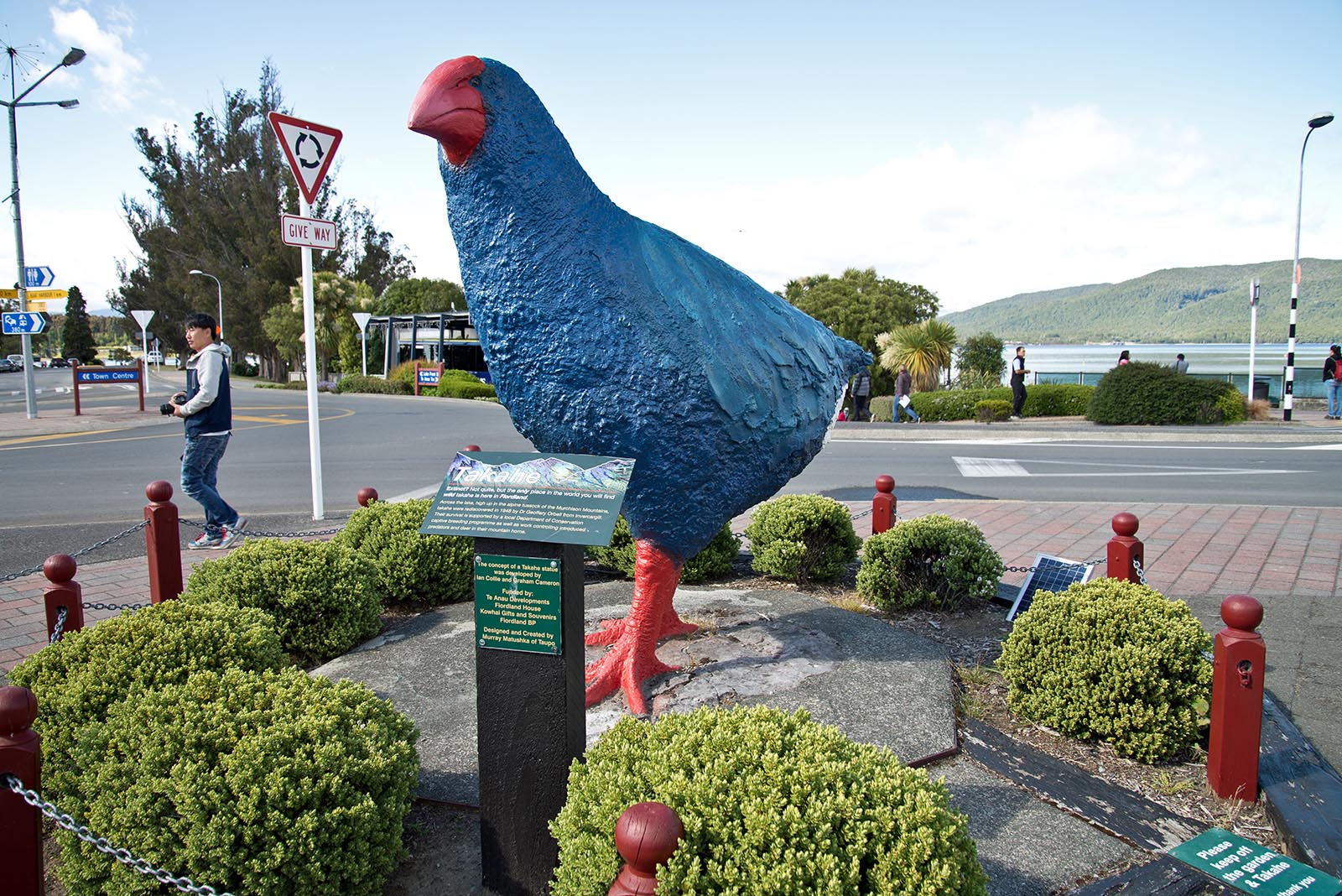 船着場の前に設置されている“タカへ”の像。“タカへ”はクイナの仲間で空を飛べない鳥で絶滅に瀕しており、フィヨルドランド内に130羽程度と保護地区に60羽程度が飼育されている。