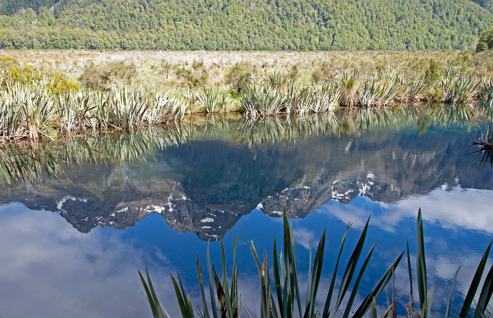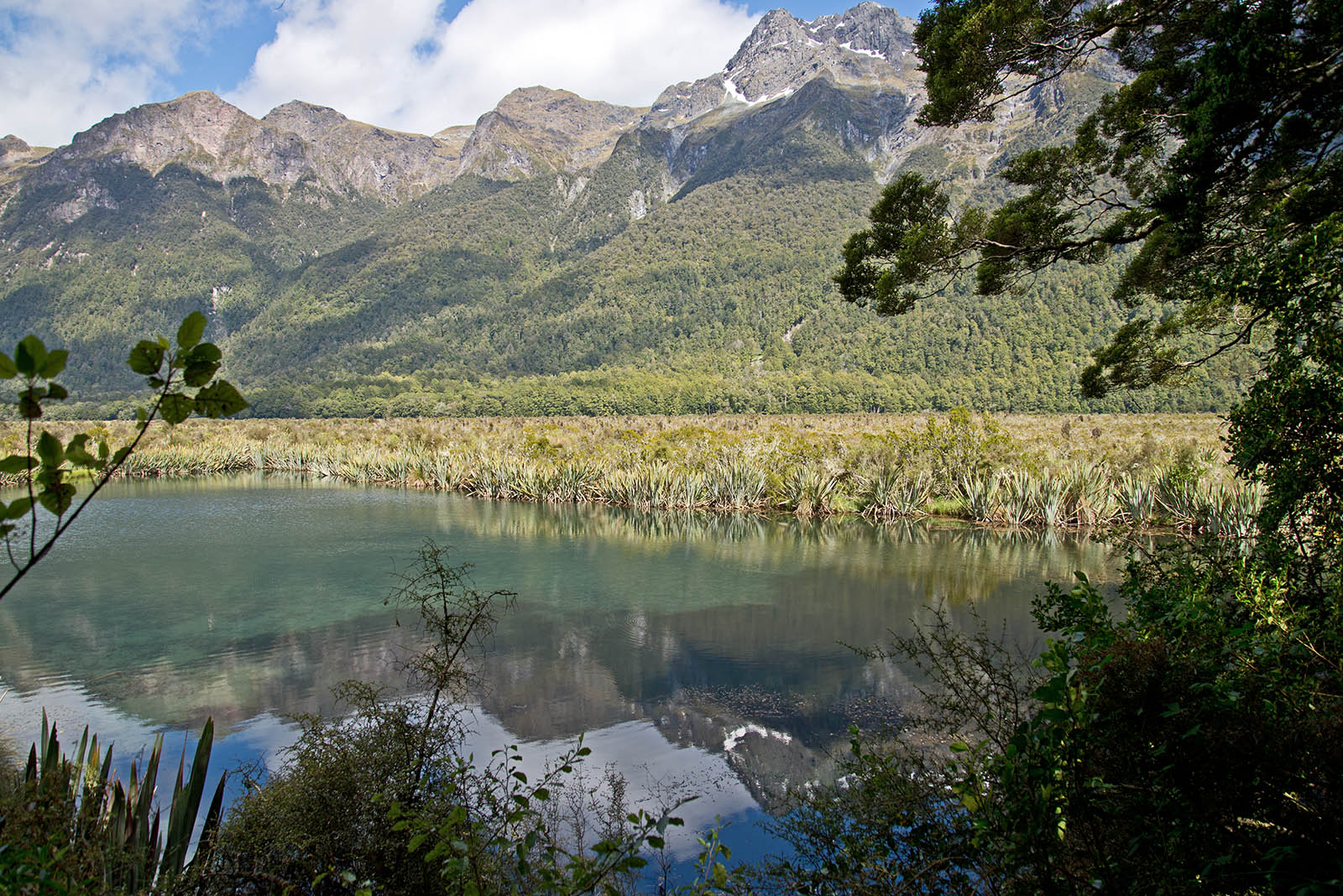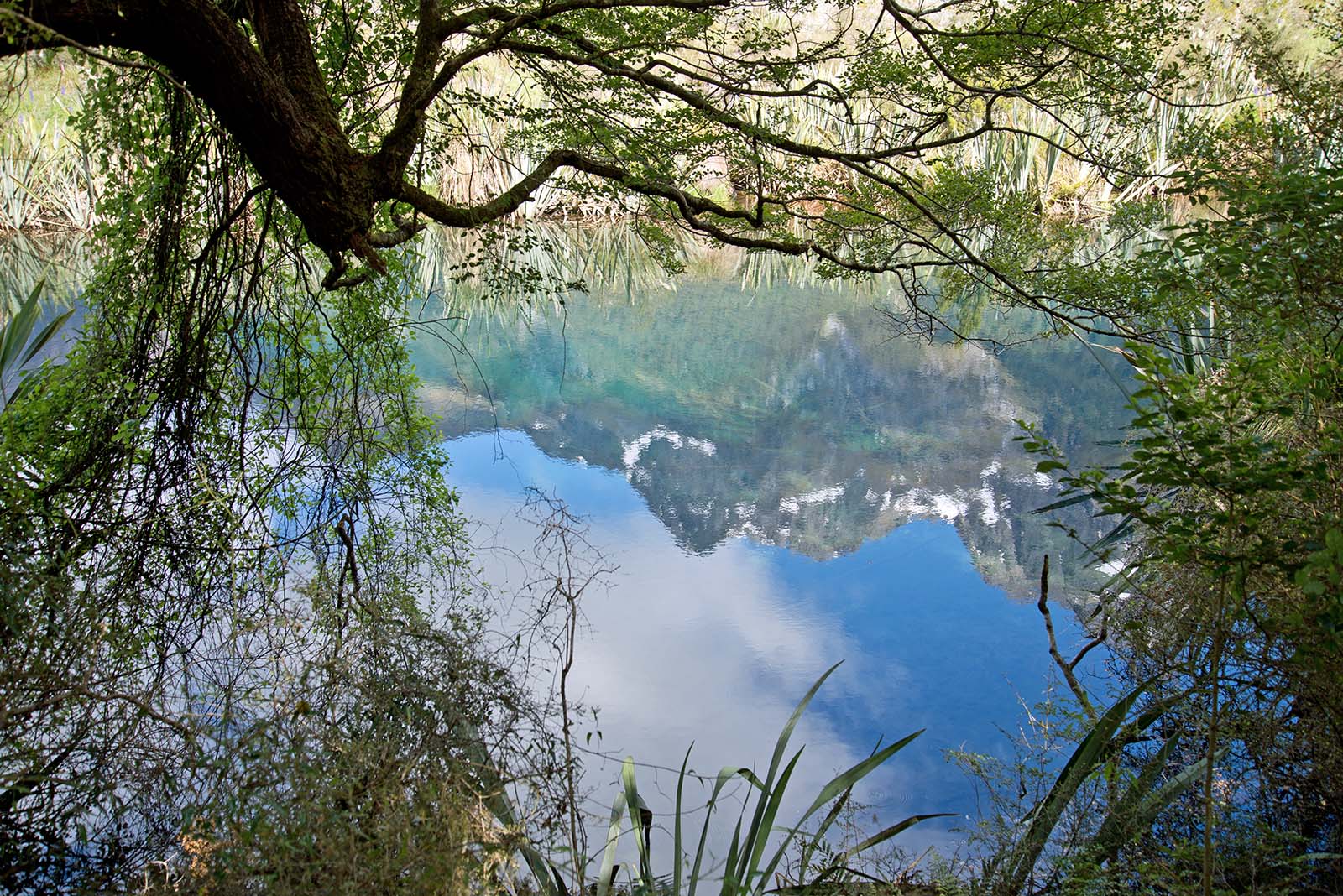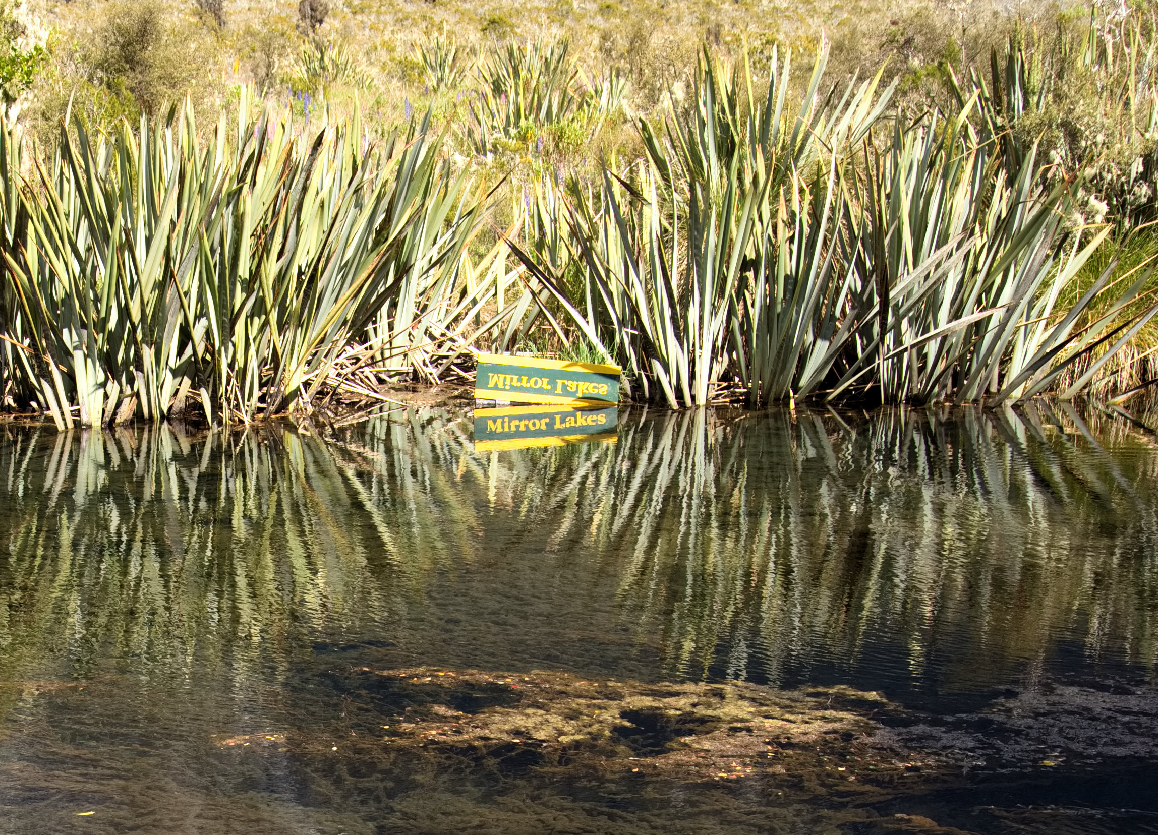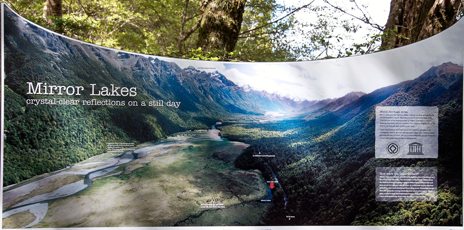 テアナウ湖から56kmでミルフォードサウンドまでの州道94号線の中間にある湖です。風がないと湖面がまさに鏡のようになって、周囲の山などを見事に映し出す。湖に設置されている看板は文字が反転&逆さまに書かれており、湖面に映ると読むことができる。
