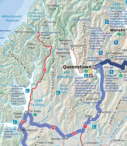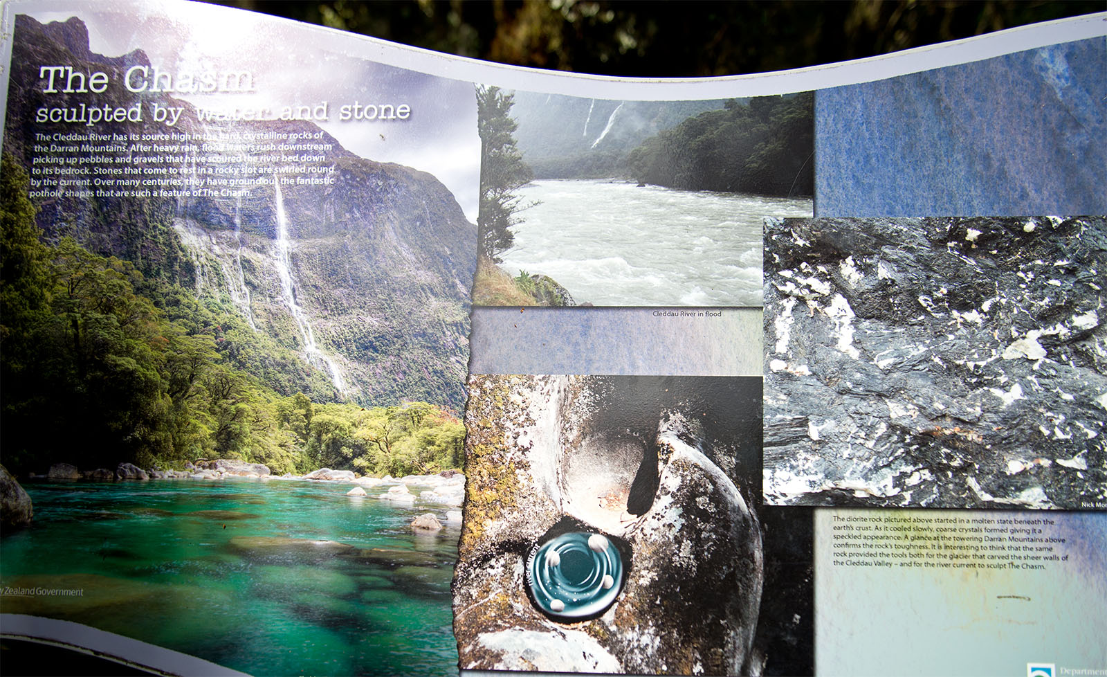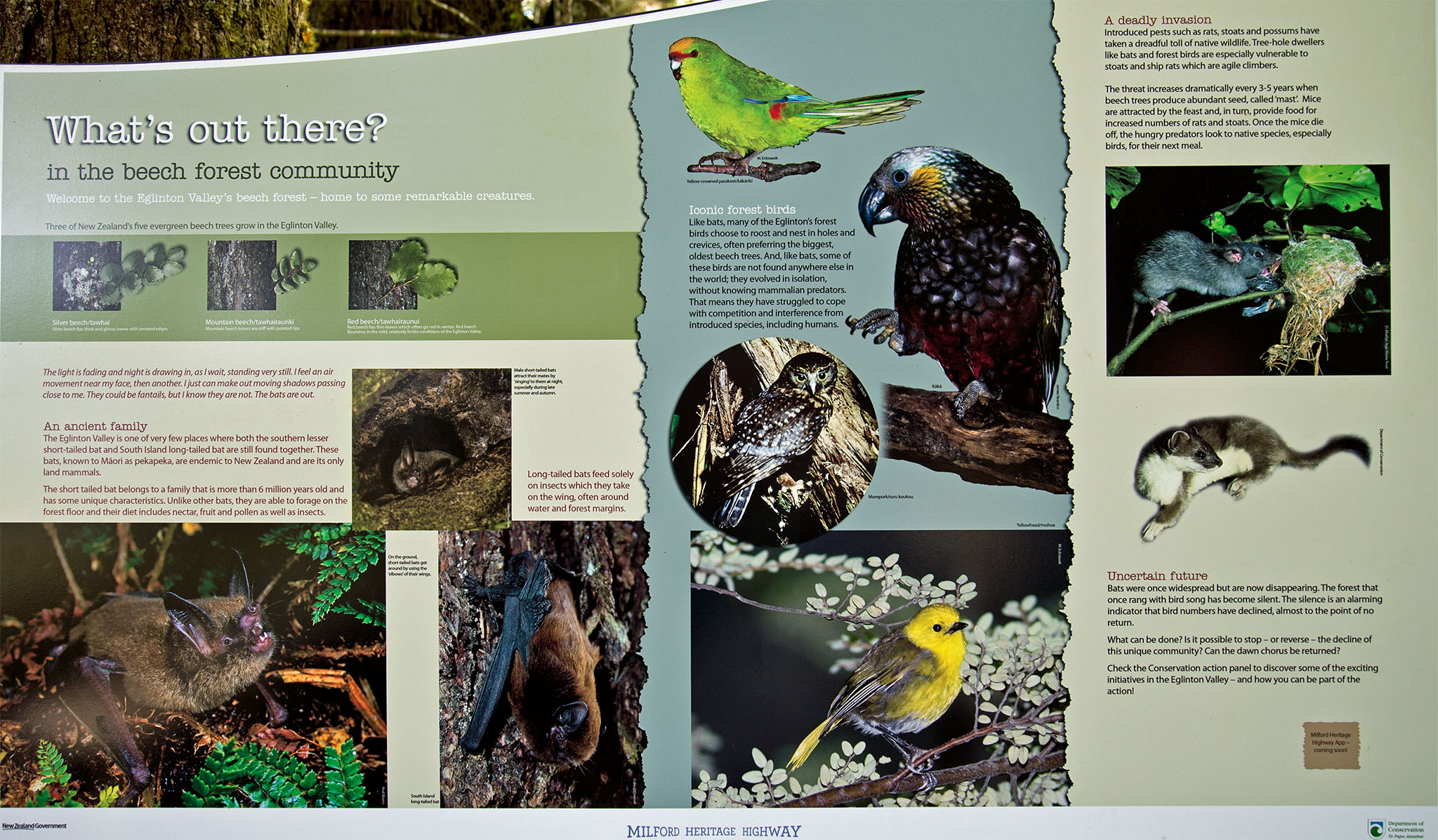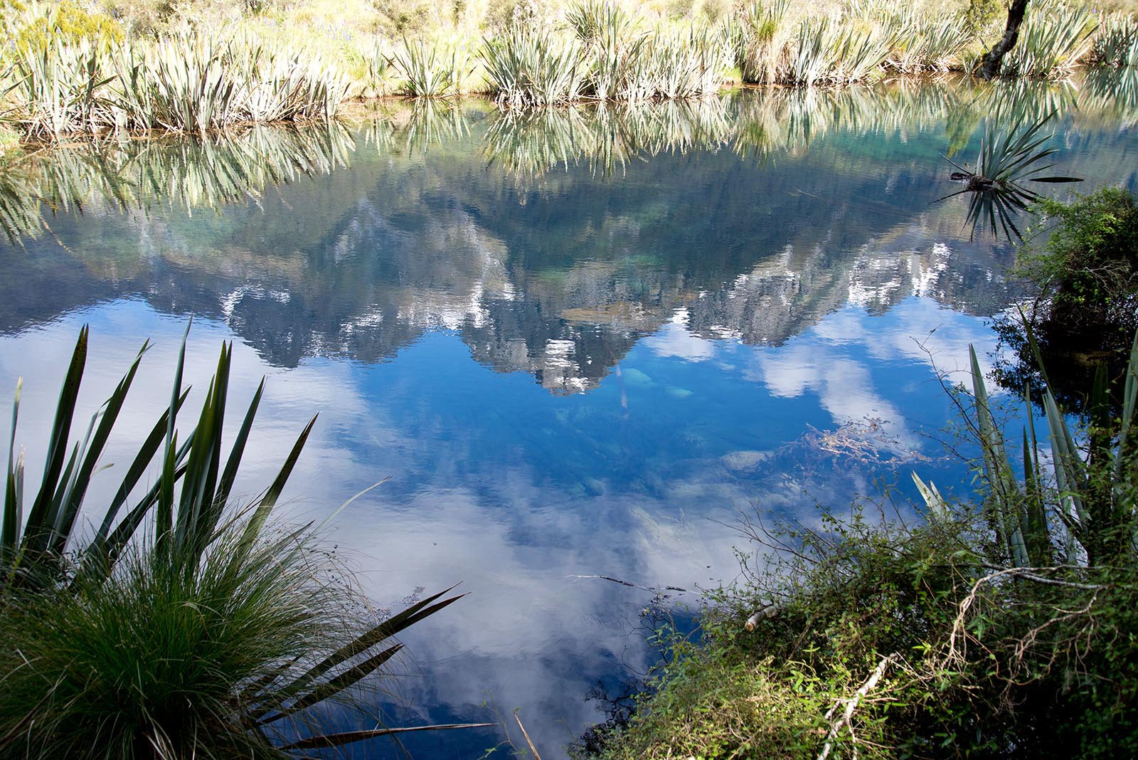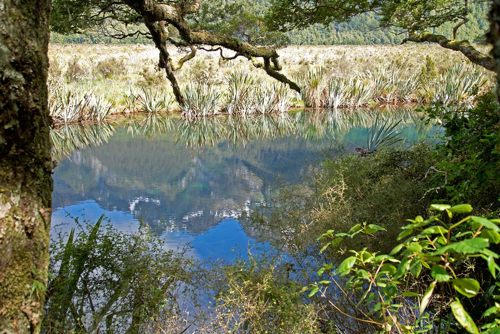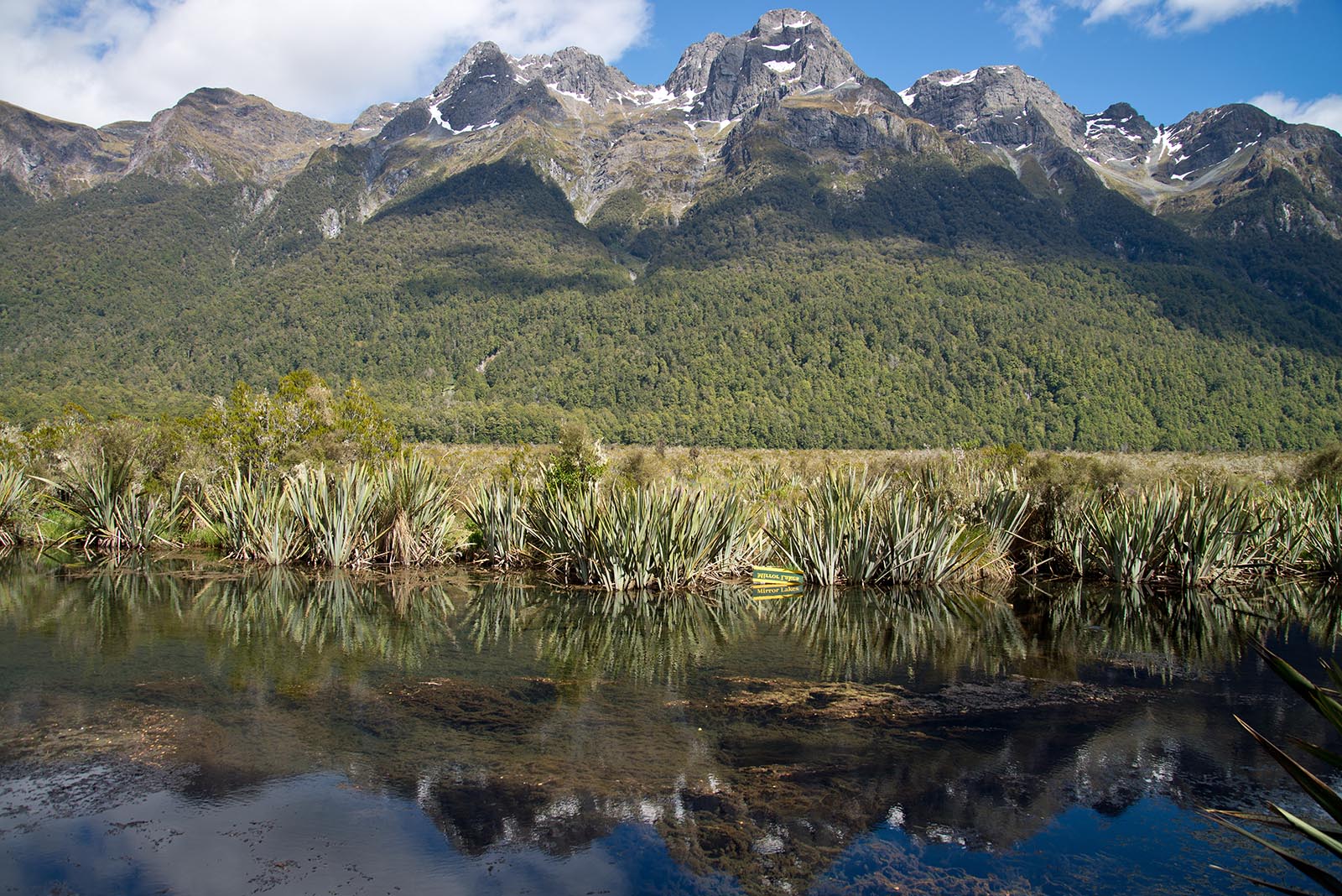 テアナウ湖から56kmでミルフォードサウンドまでの州道94号線の中間にある湖です。風がないと湖面がまさに鏡のようになって、周囲の山などを見事に映し出す。湖に設置されている看板は文字が反転&逆さまに書かれており、湖面に映ると読むことができる。