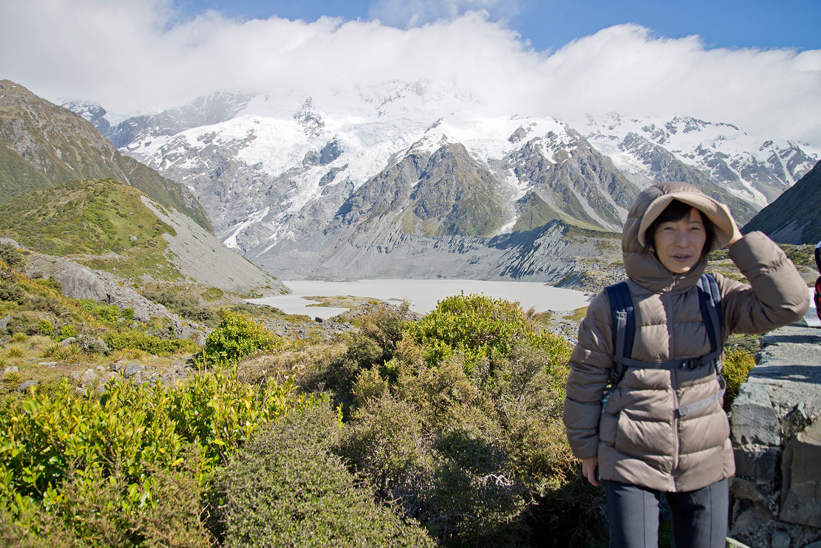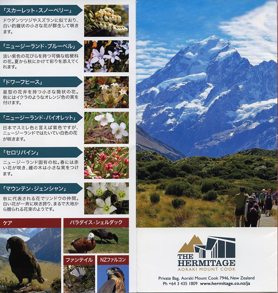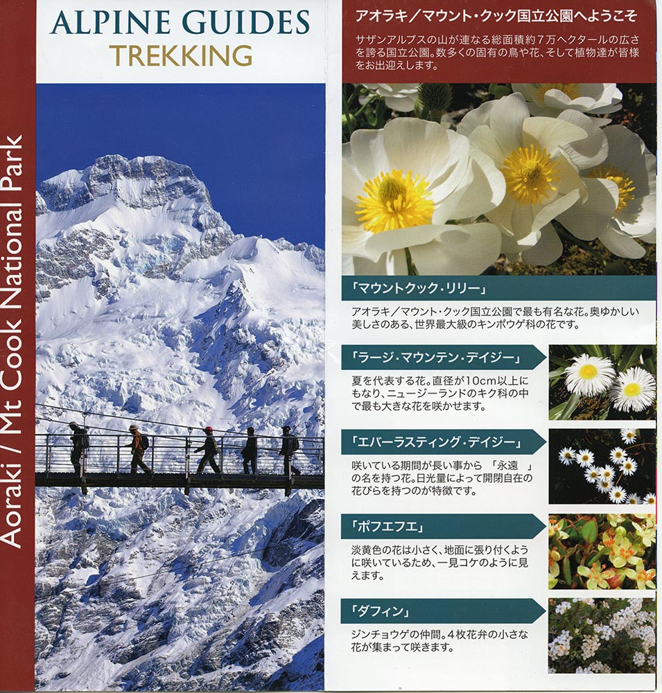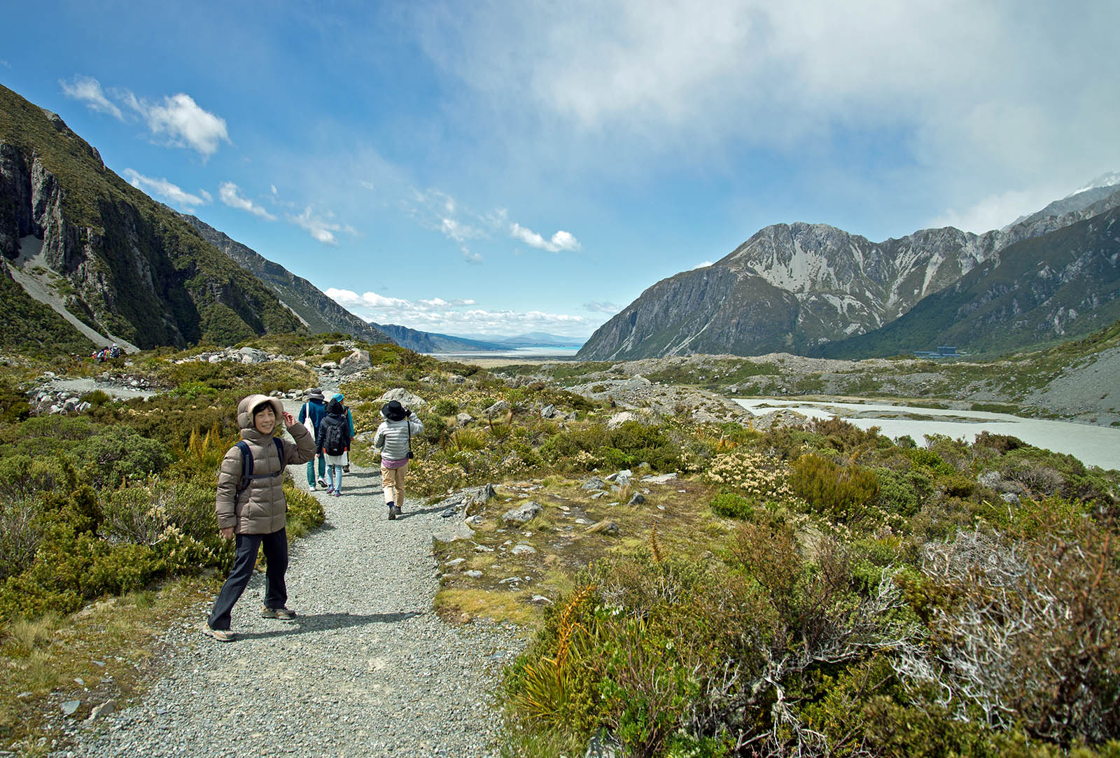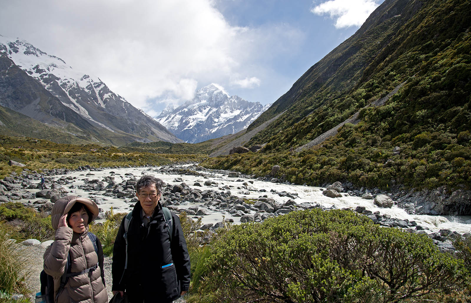 マウントクックの代表的なハイキングコースで、所要時間は約3時間半、歩行距離は往復で約7kmのコースです。訓練された日本語トレッキングガイドが同行し山や花、自然に関する詳しい御説明もありました。平坦なコース上では世界遺産に登録されているマウントクックの優美な姿や数多くの氷河や氷河湖を見ることができる。マウントクック村のキャンプ場からフッカー川に沿って、第二と第二の吊り橋を渡り、先の小さい橋の先(通称・水場)で折り返します。マウントクックに近づいた写真撮影のベストポイントです。また、周辺には11月中旬から11月にかけて、マウントクック・リリーが咲き誇り、目を楽しませてくれます。帰りには、眼下に不思議な青色のプカチ湖や、ハミテージホテルを遠望できる。