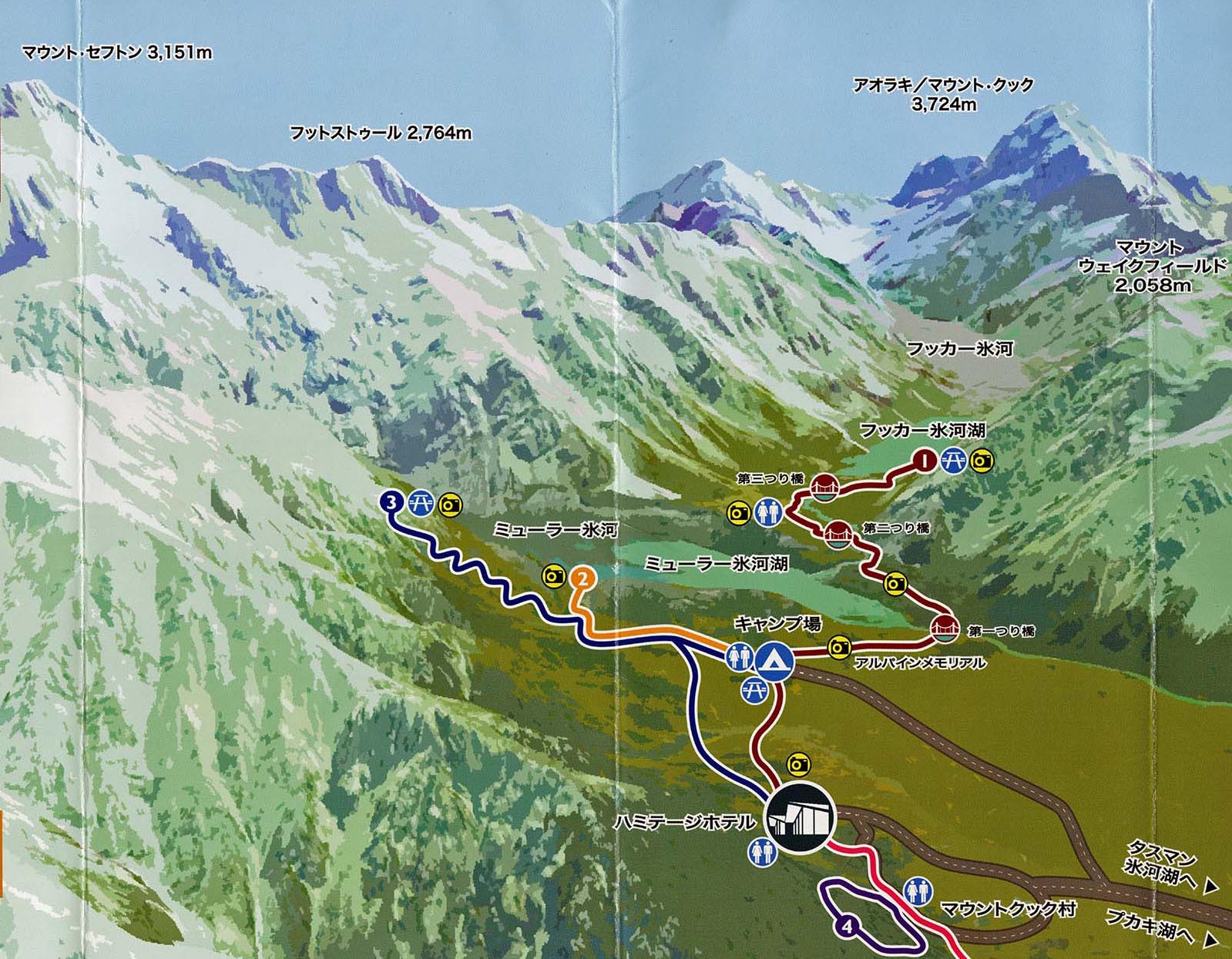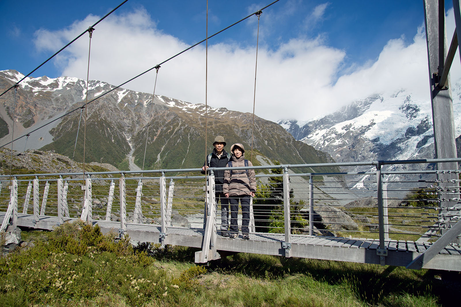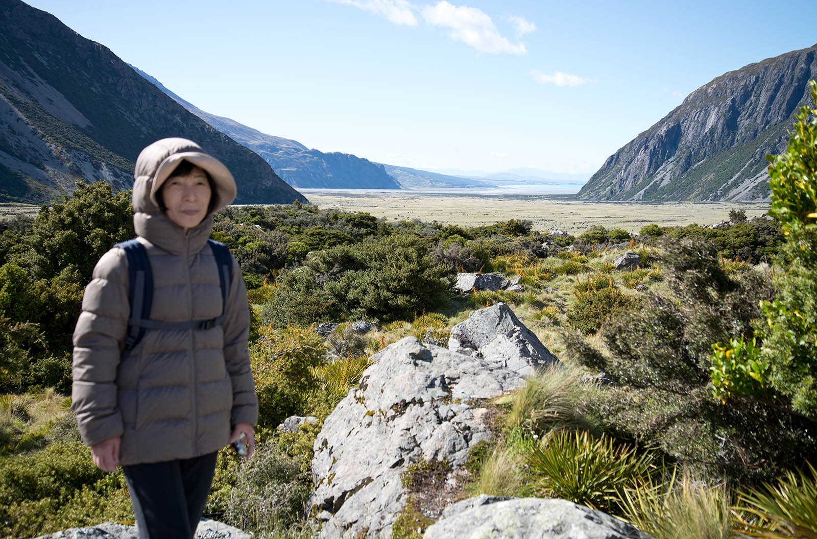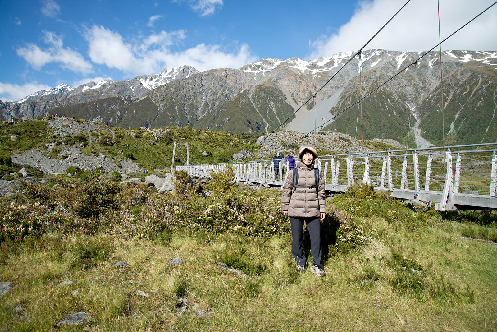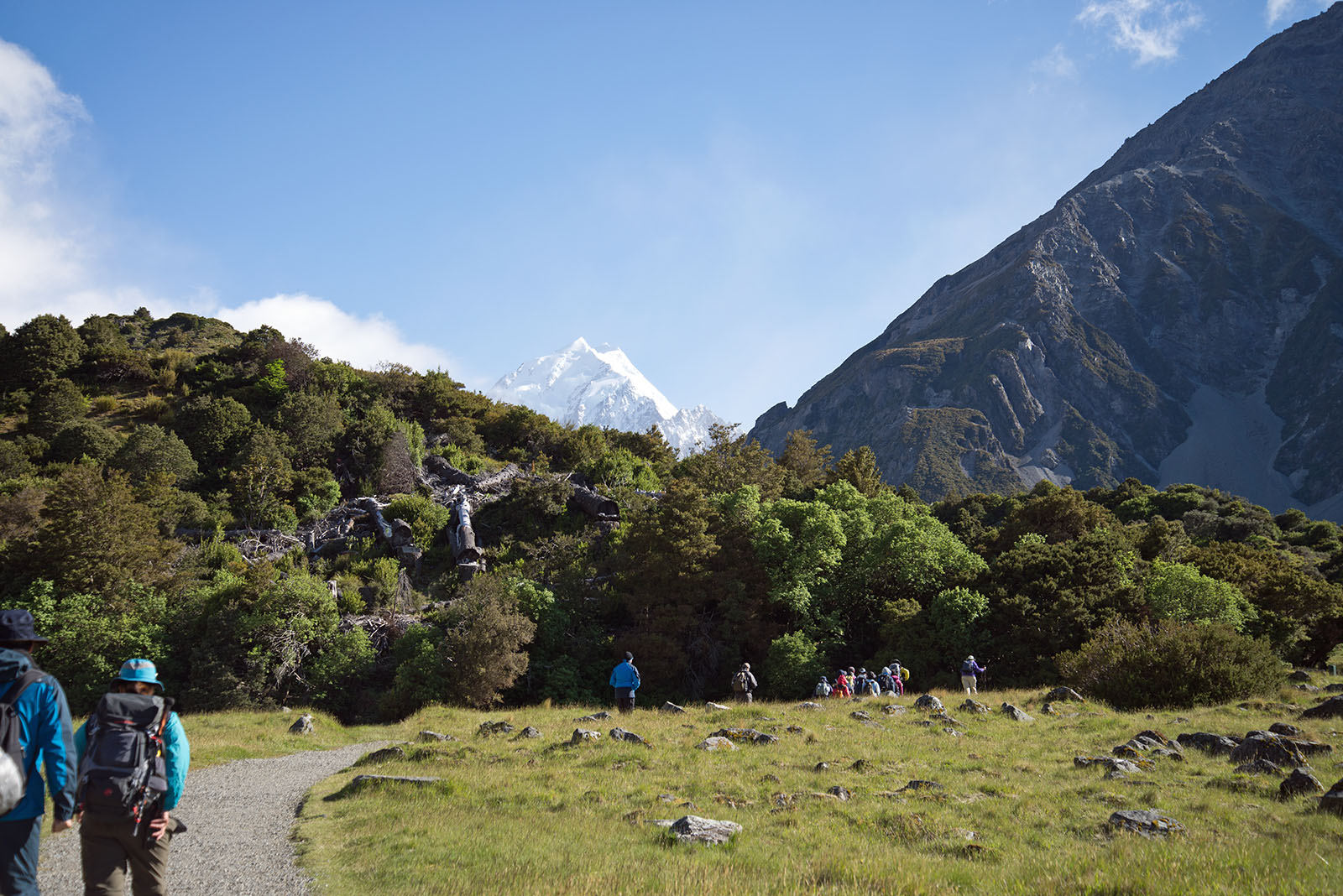 マウントクックの代表的なハイキングコースで、所要時間は約3時間半、歩行距離は往復で約7kmのコースです。訓練された日本語トレッキングガイドが同行し山や花、自然に関する詳しい御説明もありました。平坦なコース上では世界遺産に登録されているマウントクックの優美な姿や数多くの氷河や氷河湖を見ることができる。マウントクック村のキャンプ場からフッカー川に沿って、第二と第二の吊り橋を渡り、先の小さい橋の先(通称・水場)で折り返します。マウントクックに近づいた写真撮影のベストポイントです。また、周辺には11月中旬から11月にかけて、マウントクック・リリーが咲き誇り、目を楽しませてくれます。帰りには、眼下に不思議な青色のプカチ湖や、ハミテージホテルを遠望できる。